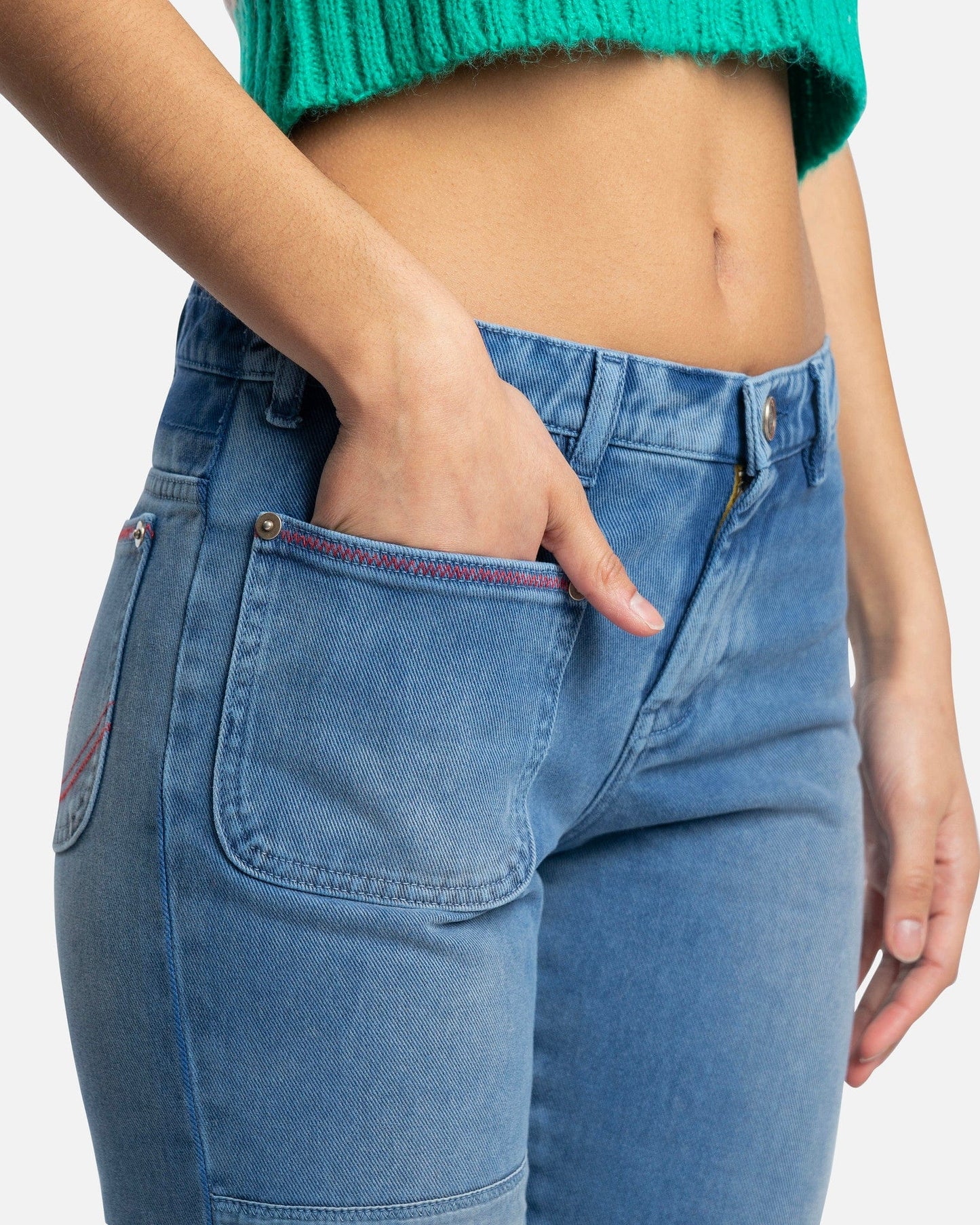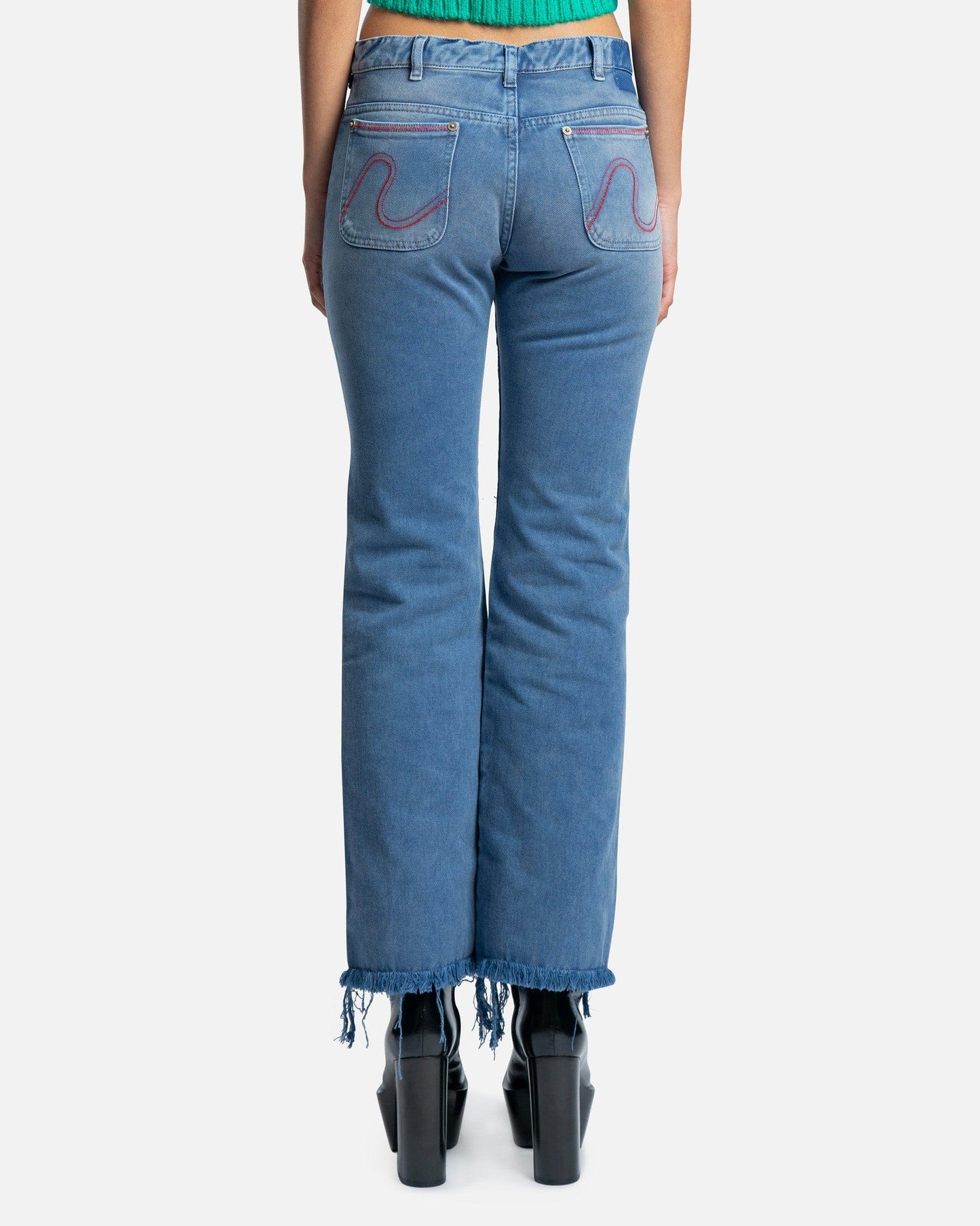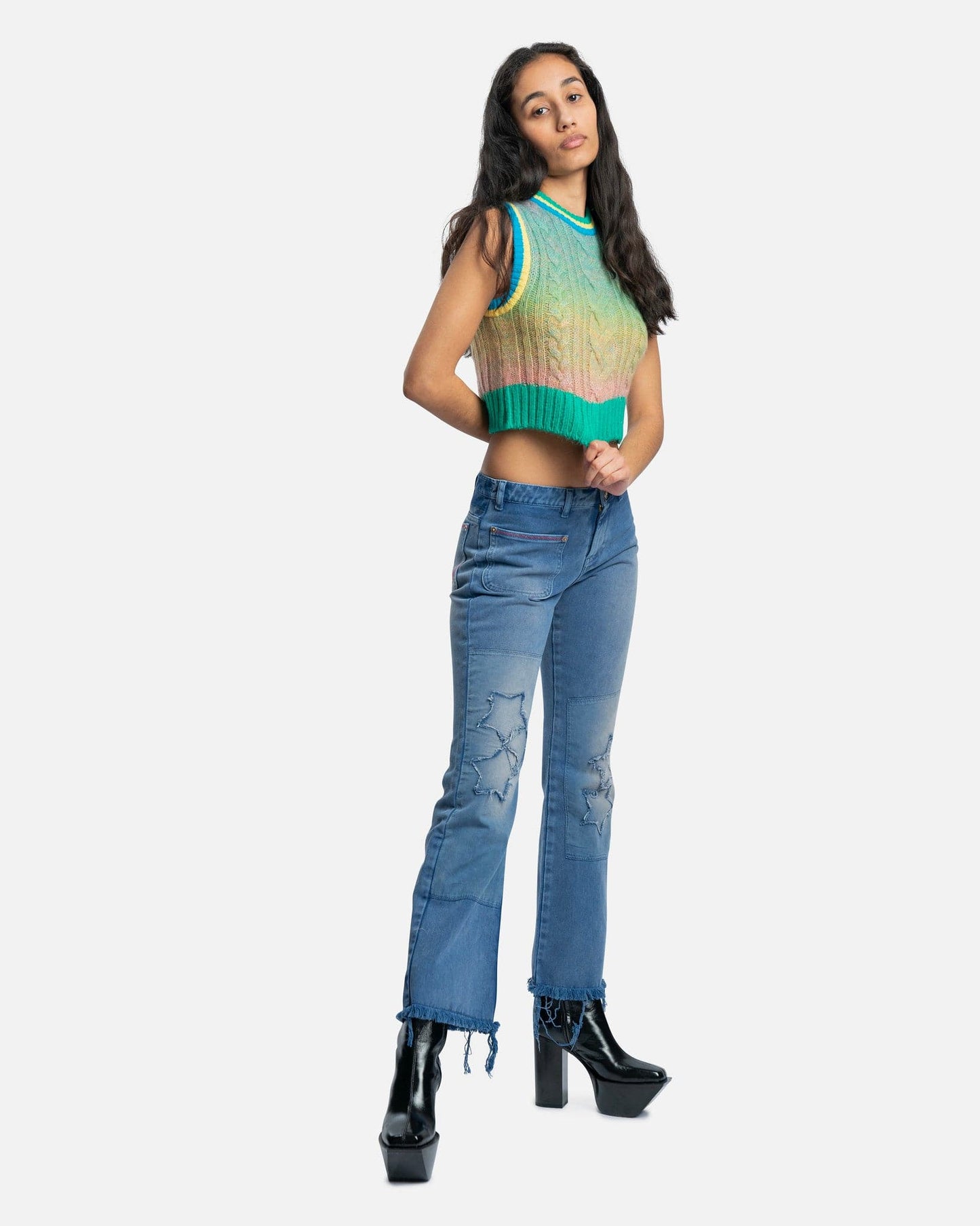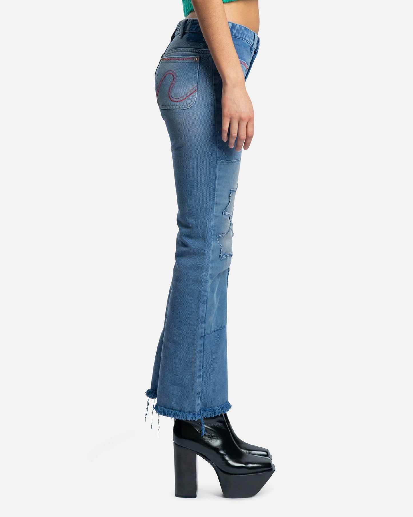 ERL women's jacquard star pants in blue. These jeans feature one patch pocket on the front and two on the back. There are jacquard stars along the knees and raw hems.