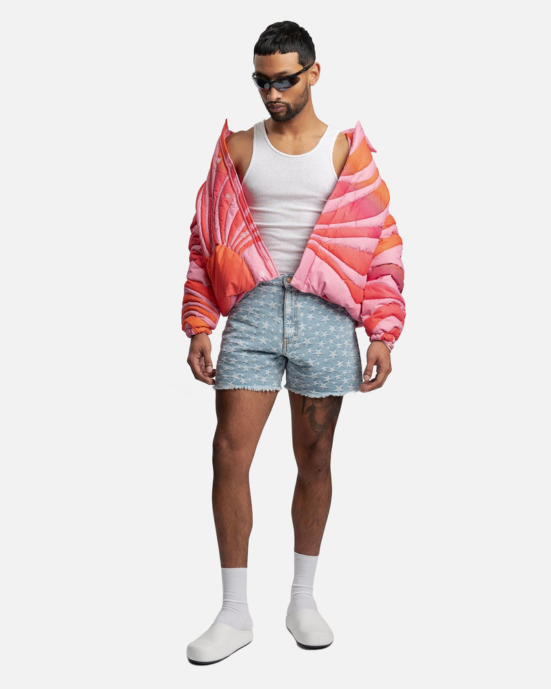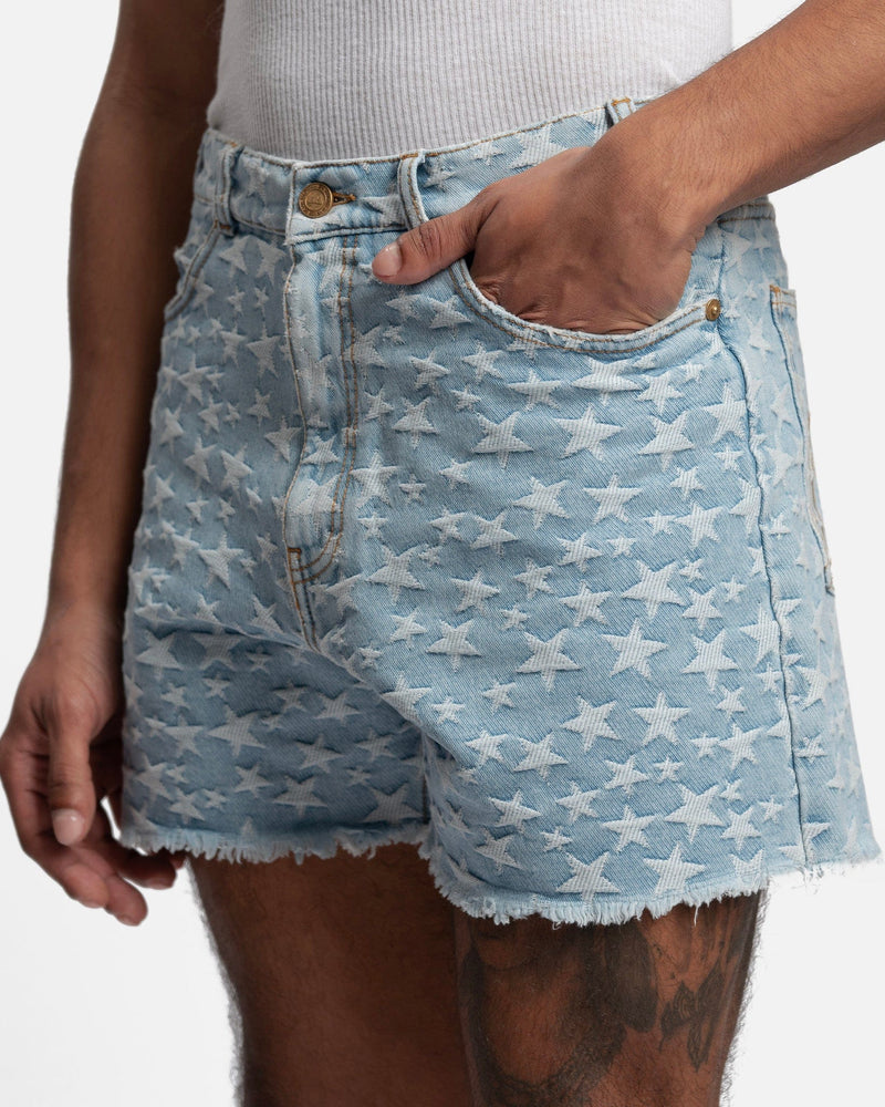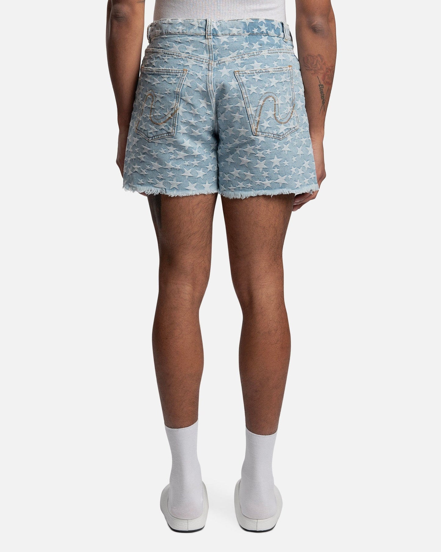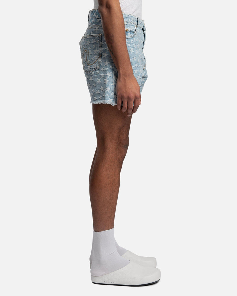 ERL men's denim cut-off shorts in blue. These jeans have an all-over star pattern, raw edge cuffs, and a short fit.