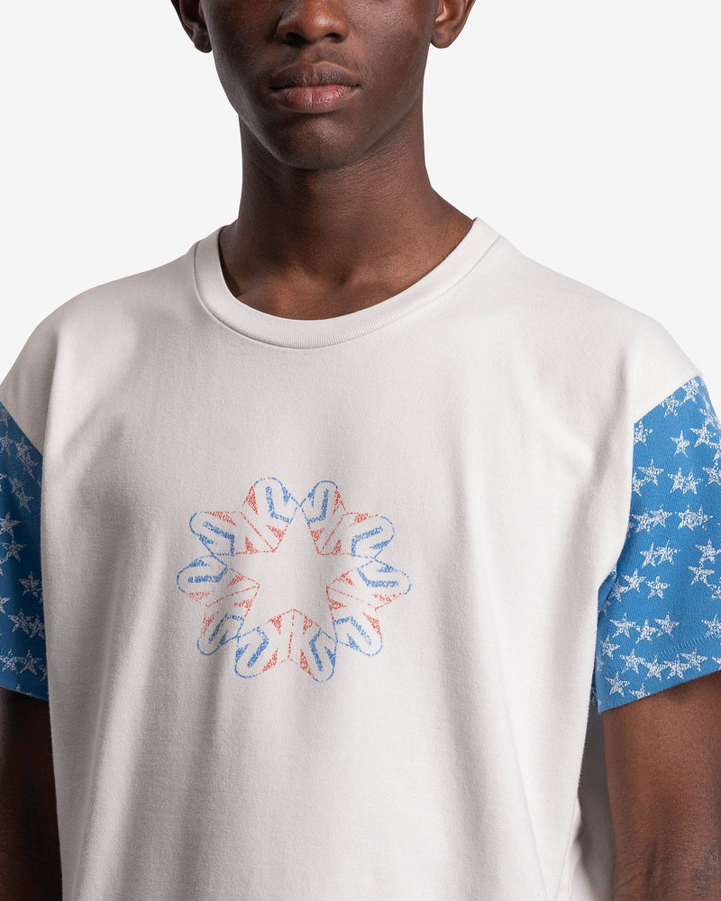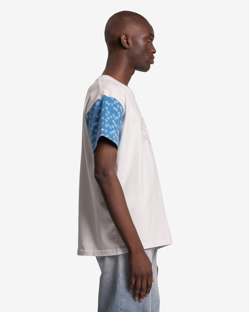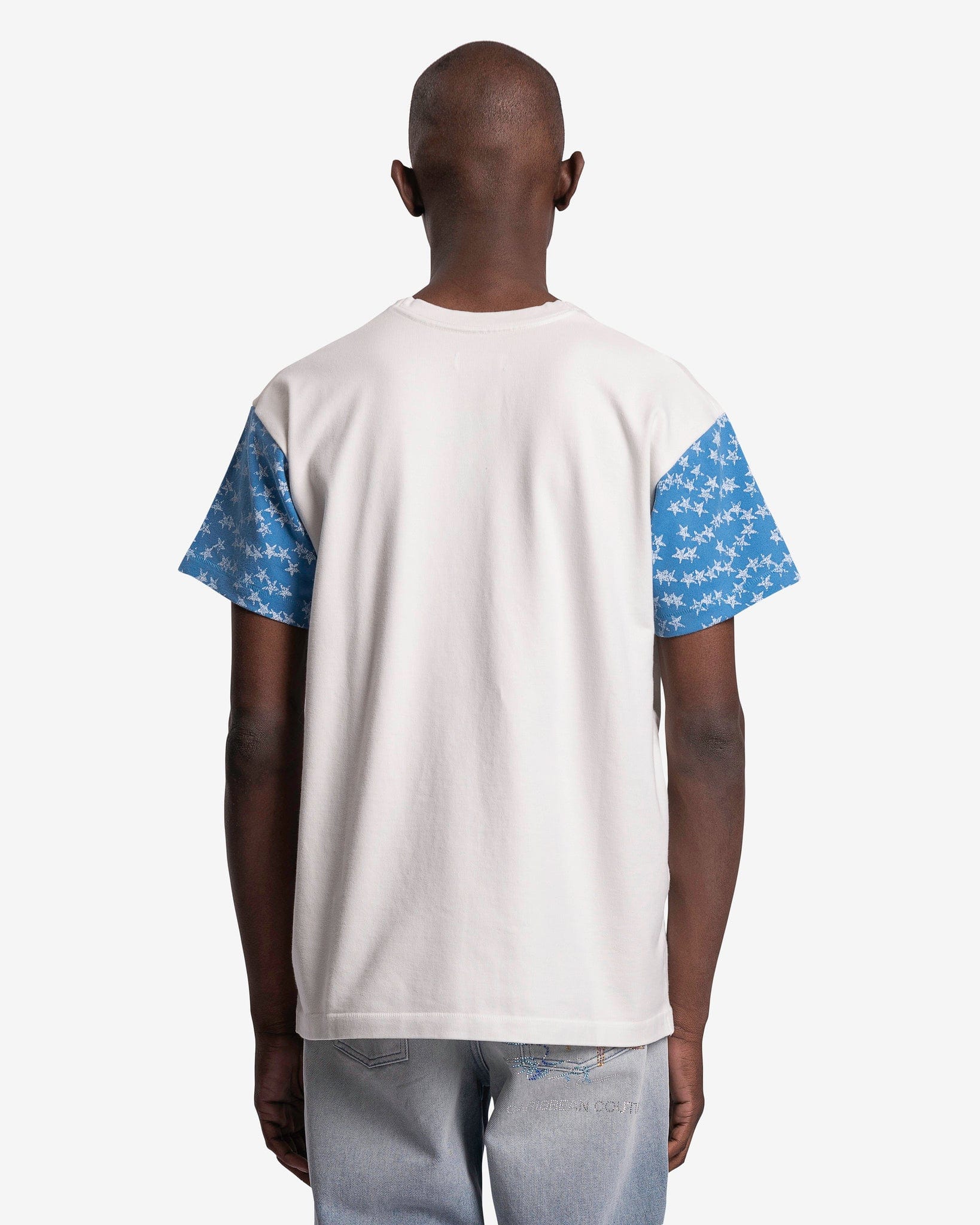 ERL men's short sleeve graphic shirt in blue and white. This shirt features a graphic on the chest and blue short sleeves with a star pattern.