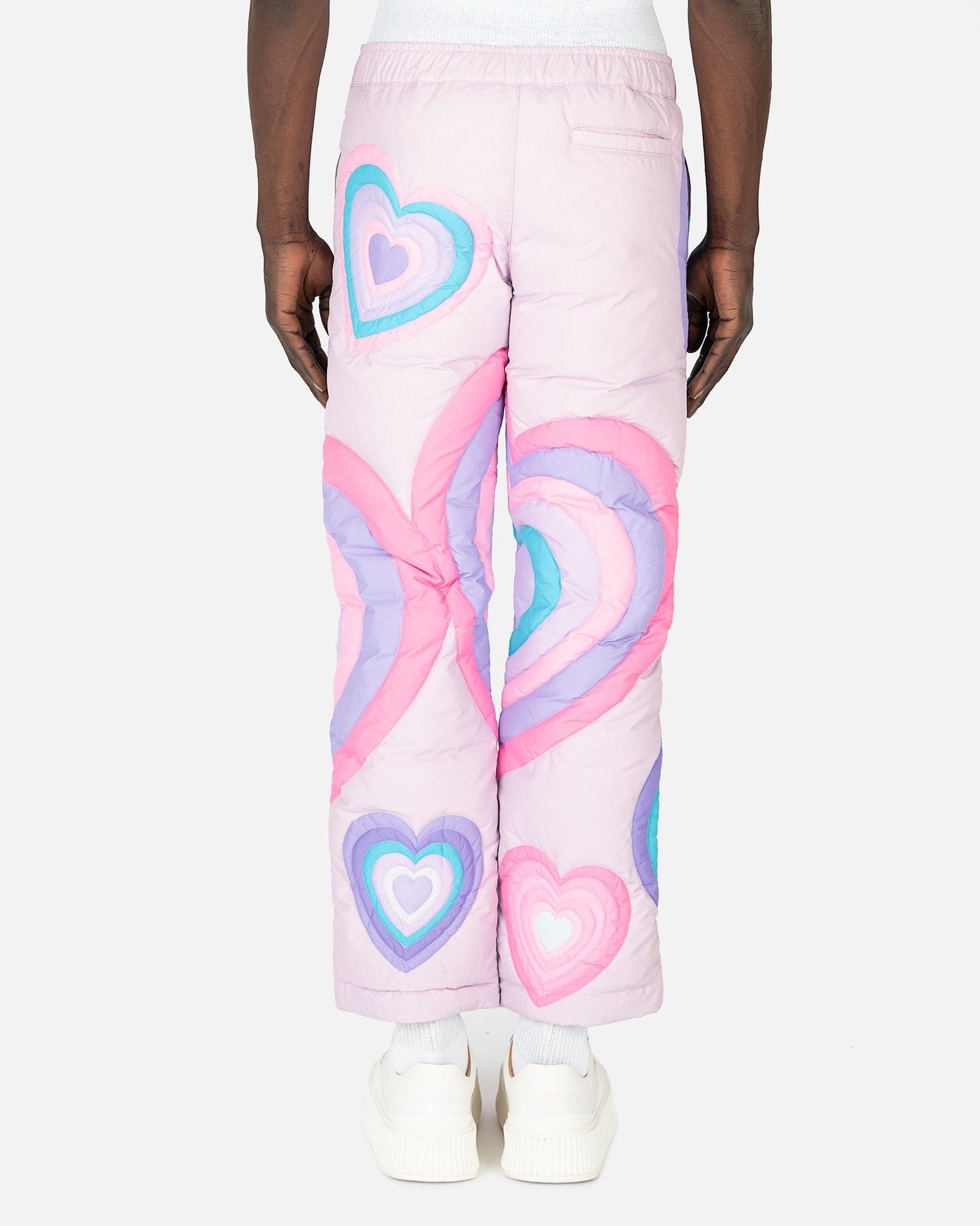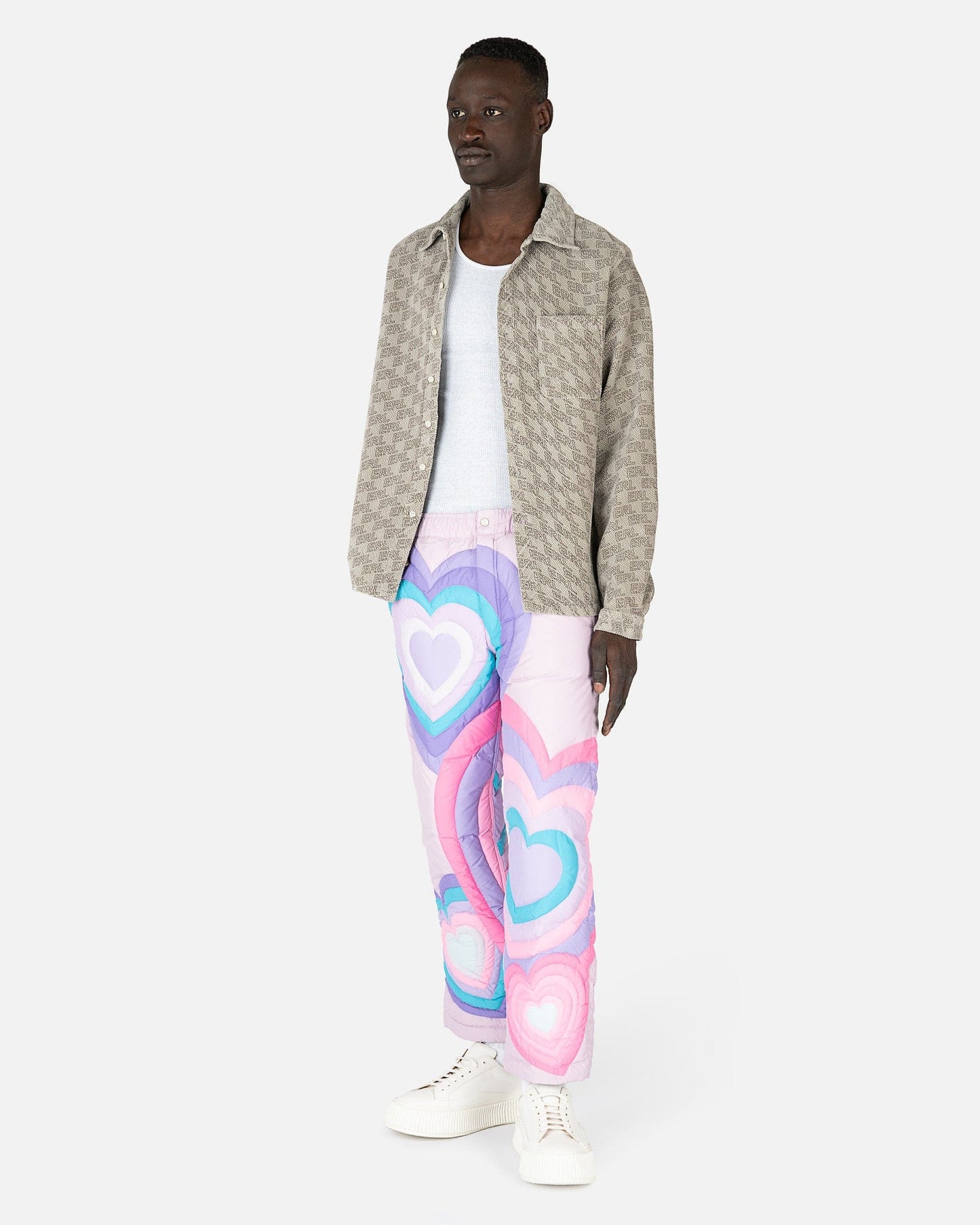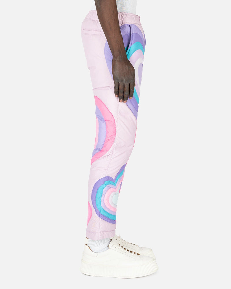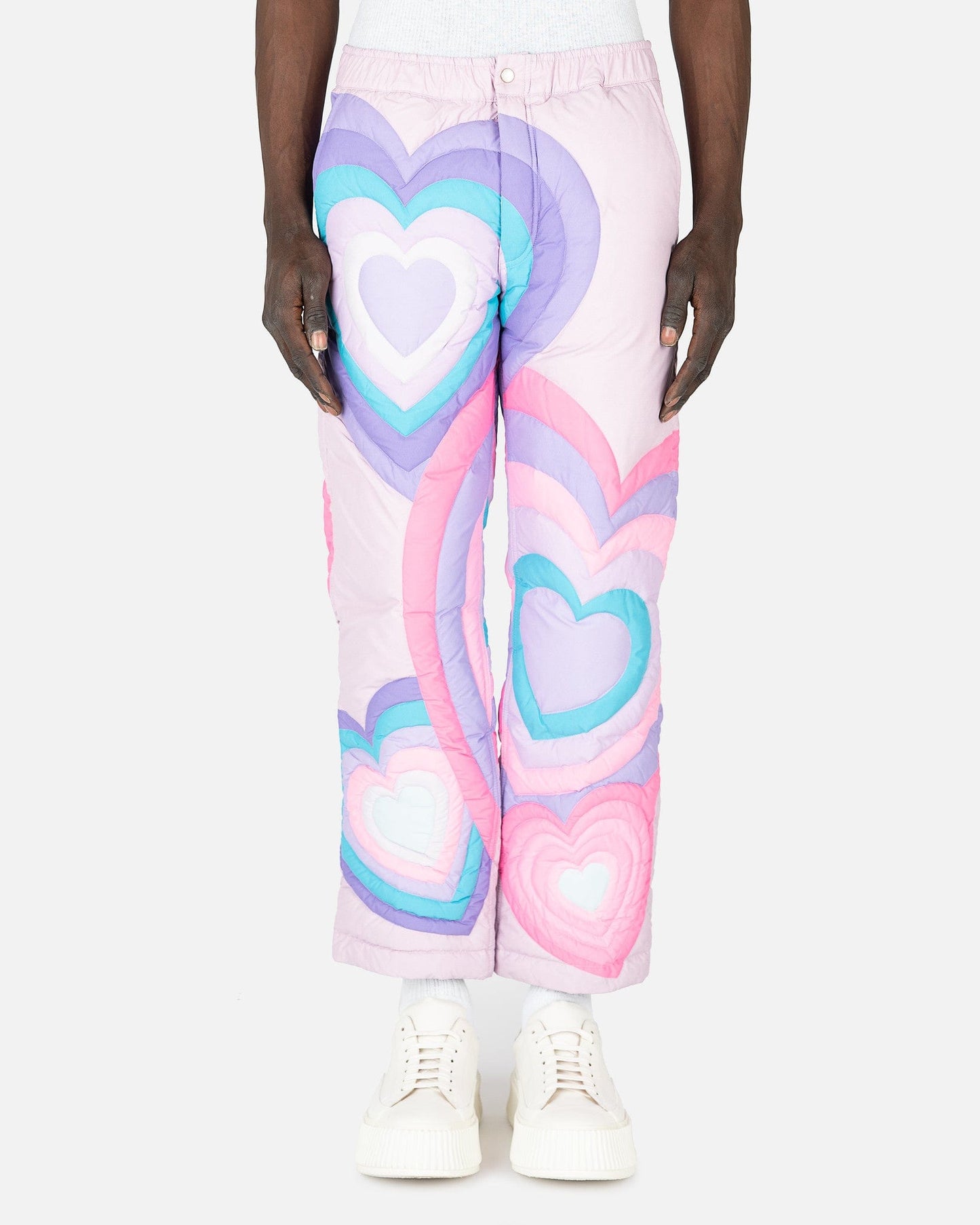 ERL men's heart patterned puffer pants in light purple. These pants have a multicolored pastel quilted heart motif. They use front zip closure and have two side slit pockets. There is one welt pocket on the back.