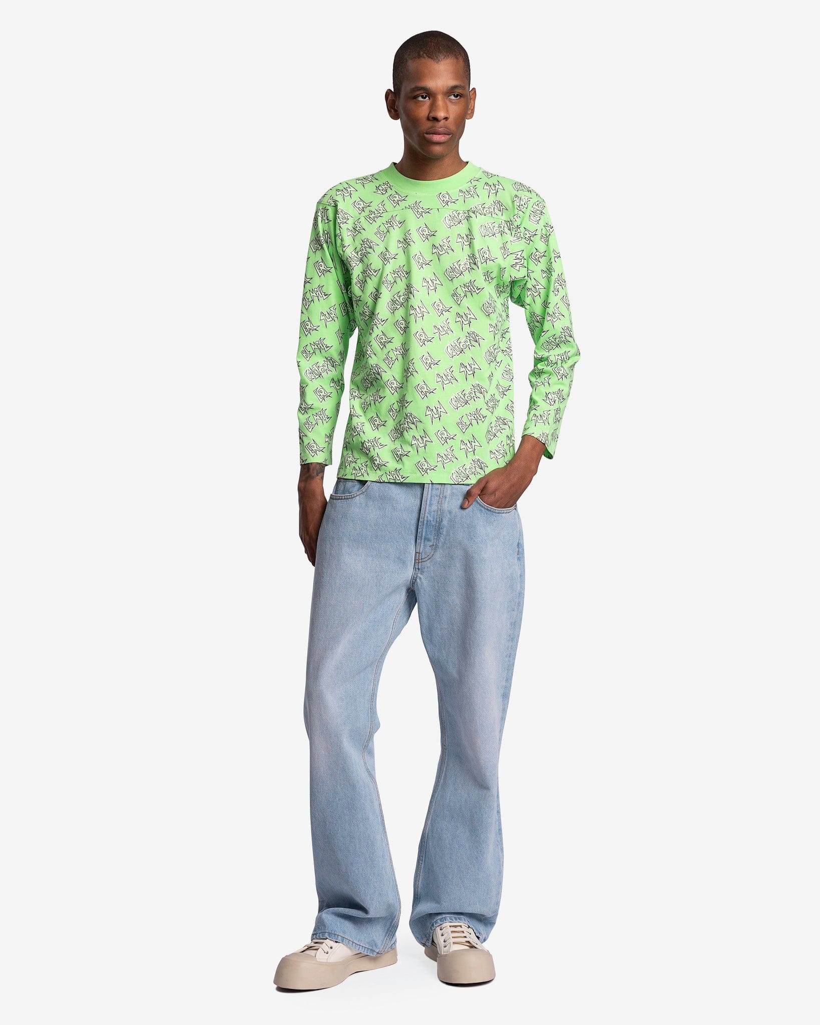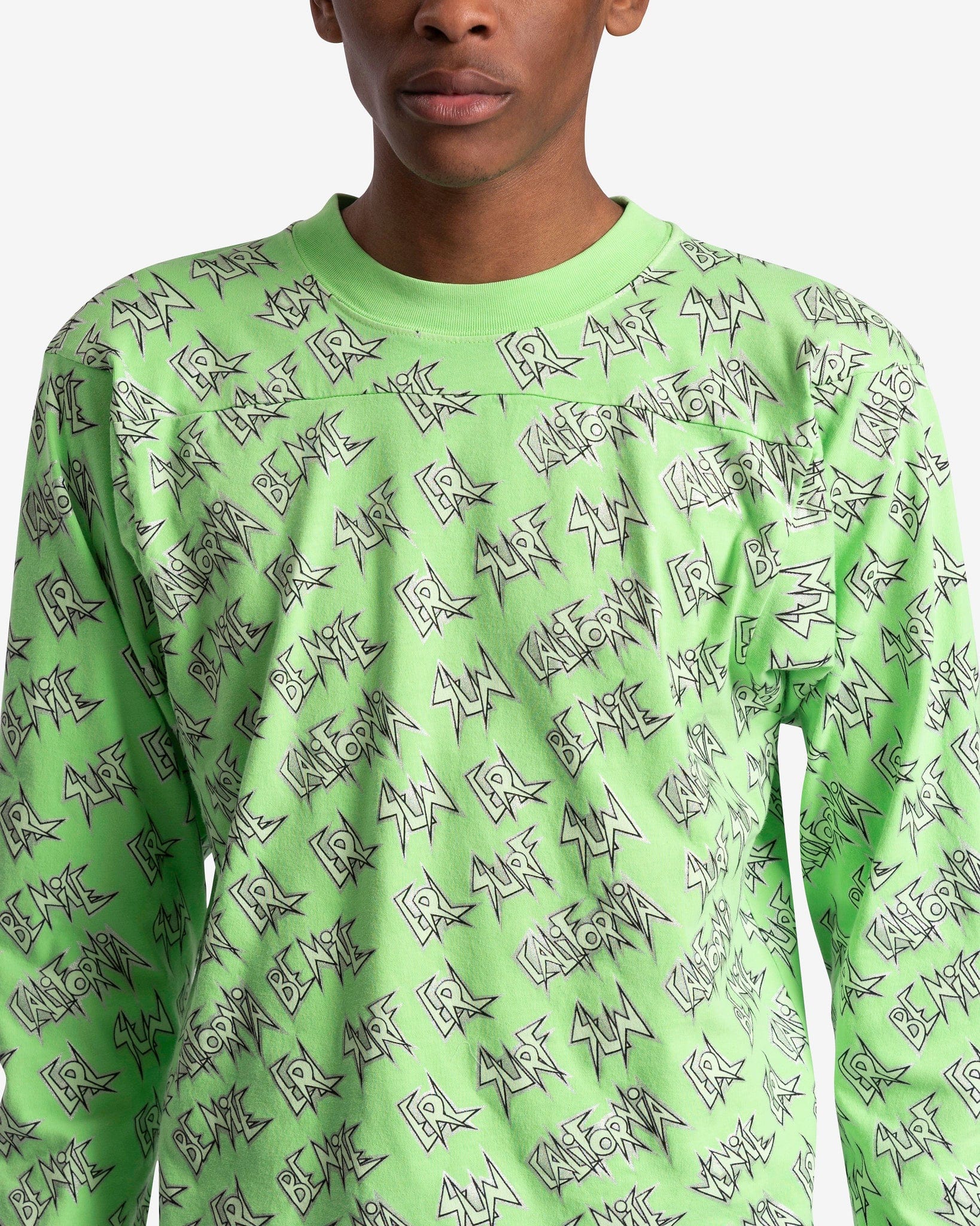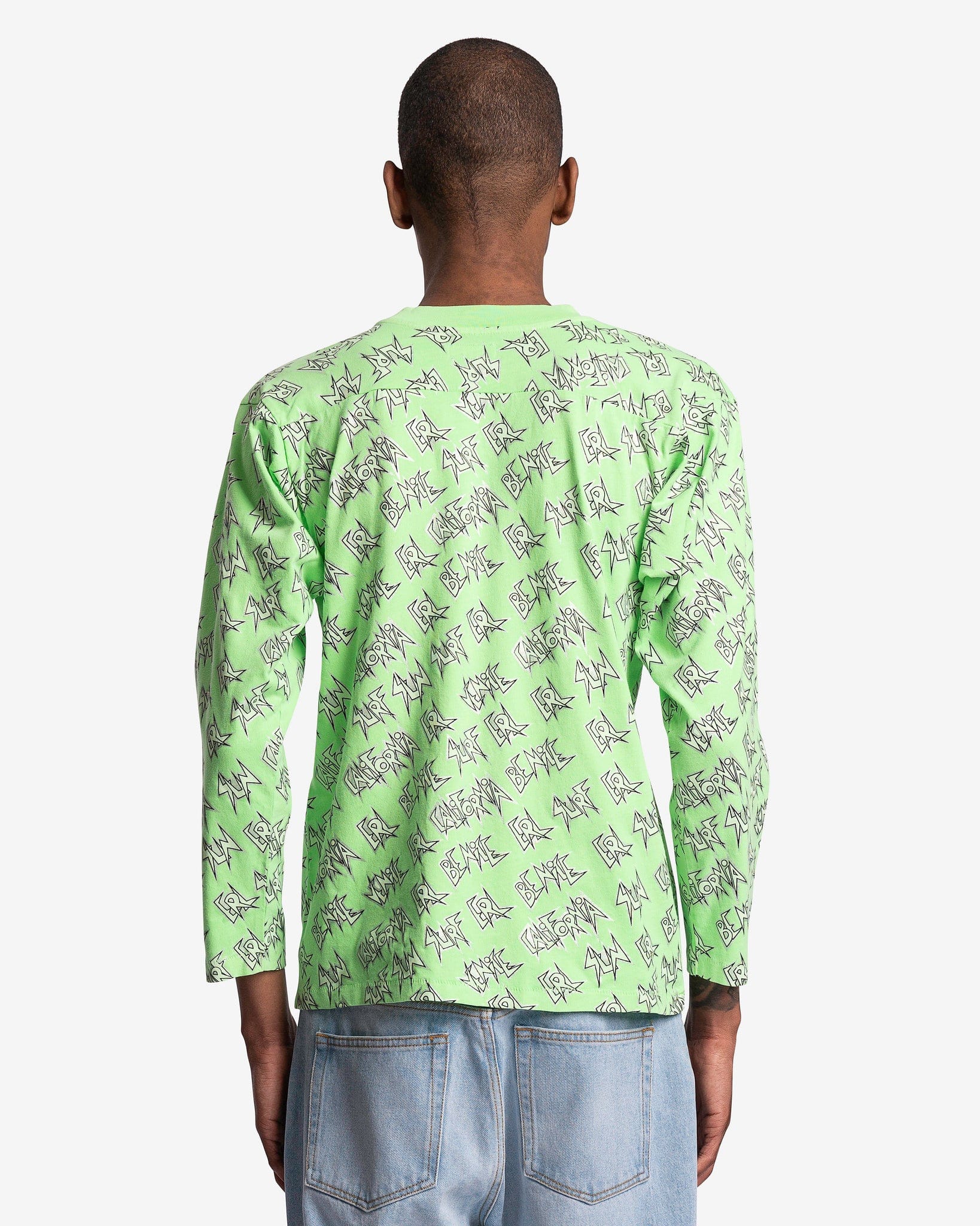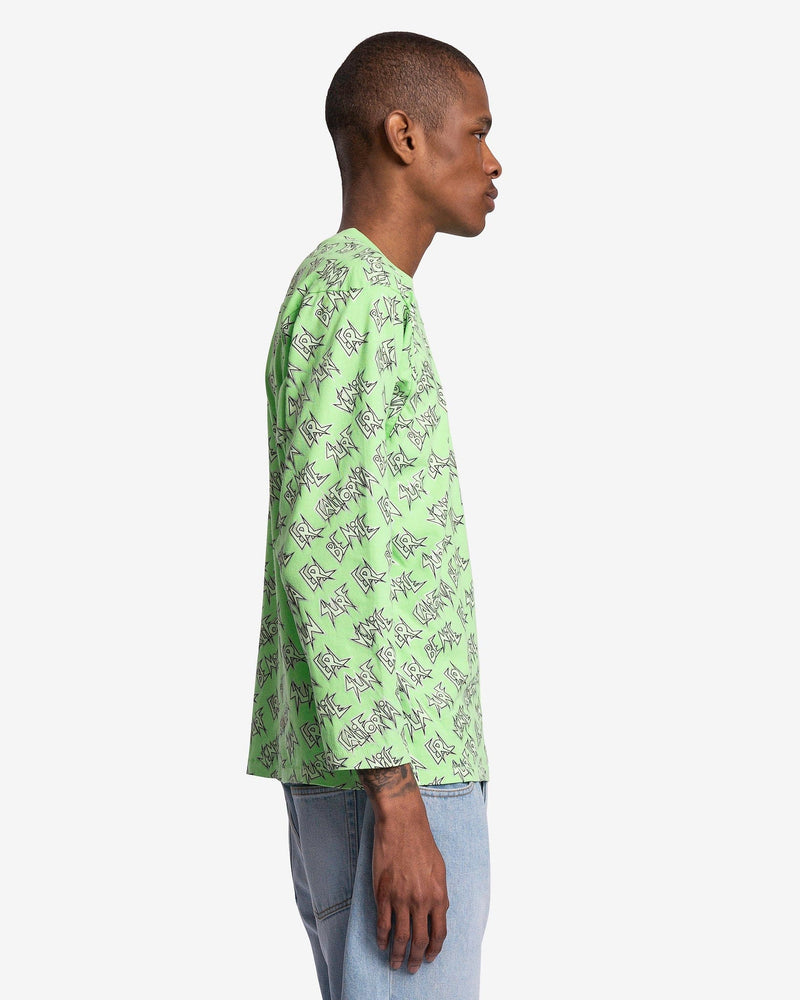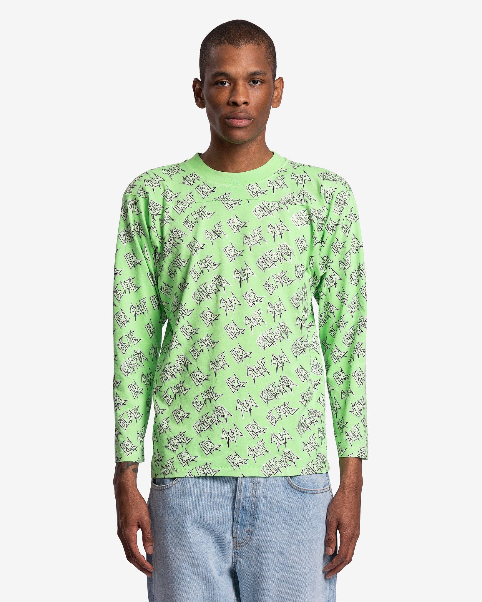 ERL men's allover print shirt in green. This t-shirt features a print of the words 'ERL,' 'SUN,' 'CALIFORNIA,' 'BE NICE,' and 'SURF' repeating across the body.