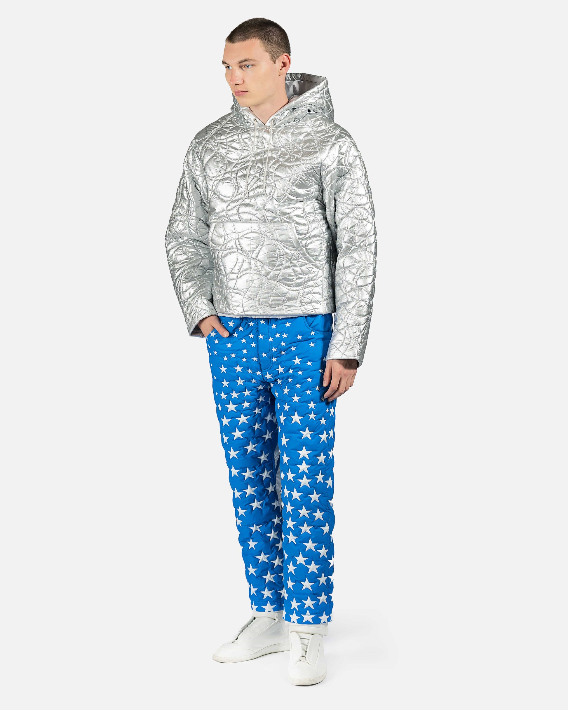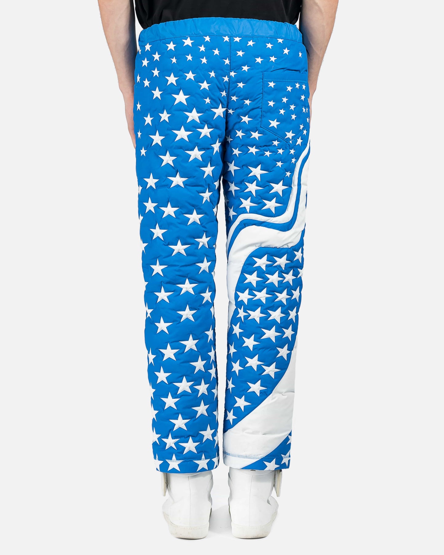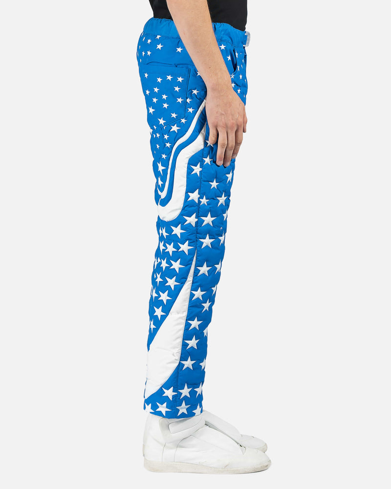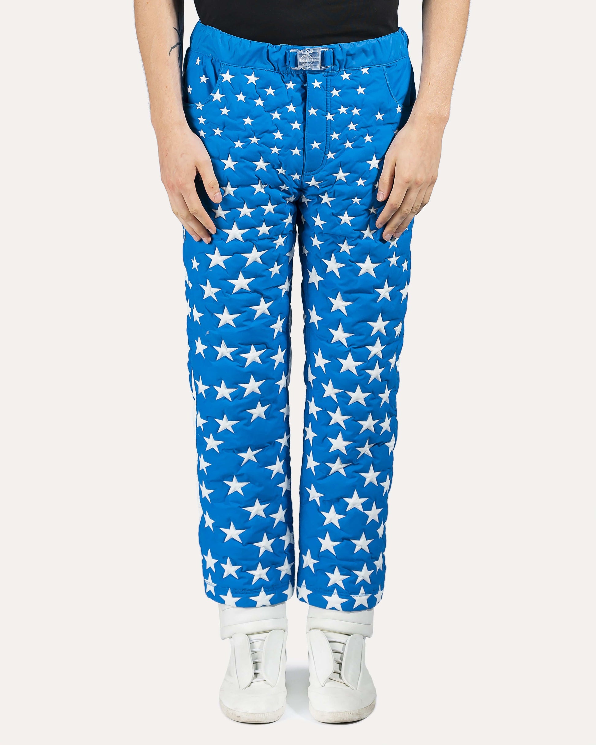 Blue puffer trousers with white star panelling throughout legs. 3 pocket construction with translucent buckle belt at waist.