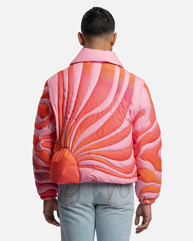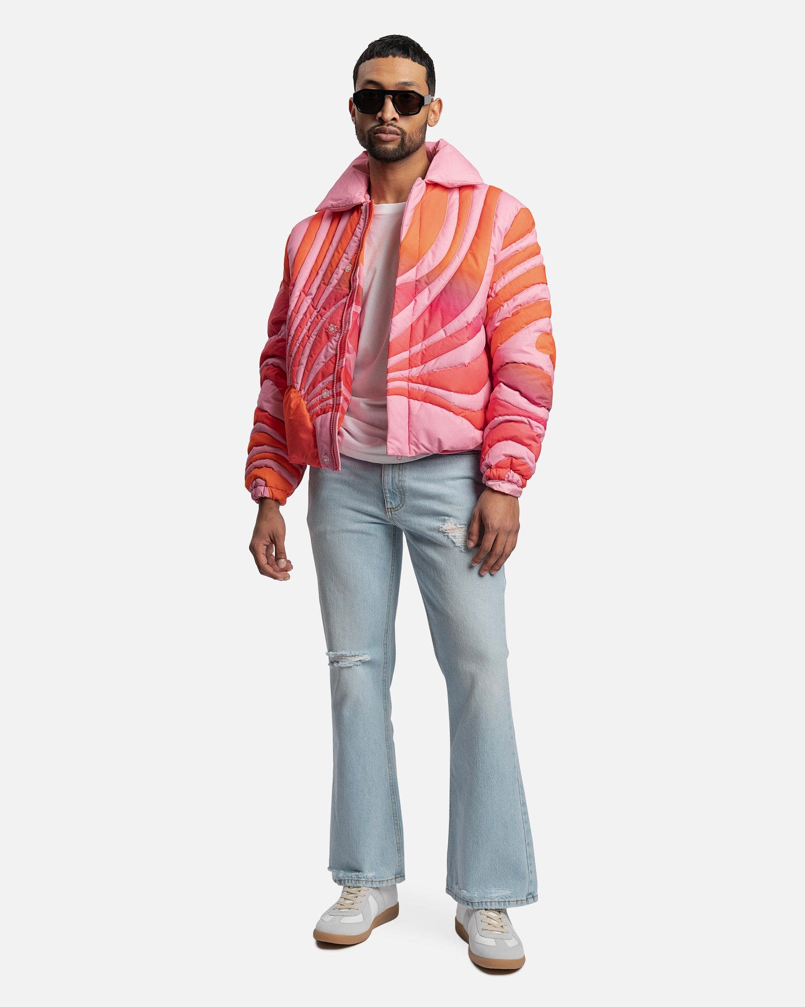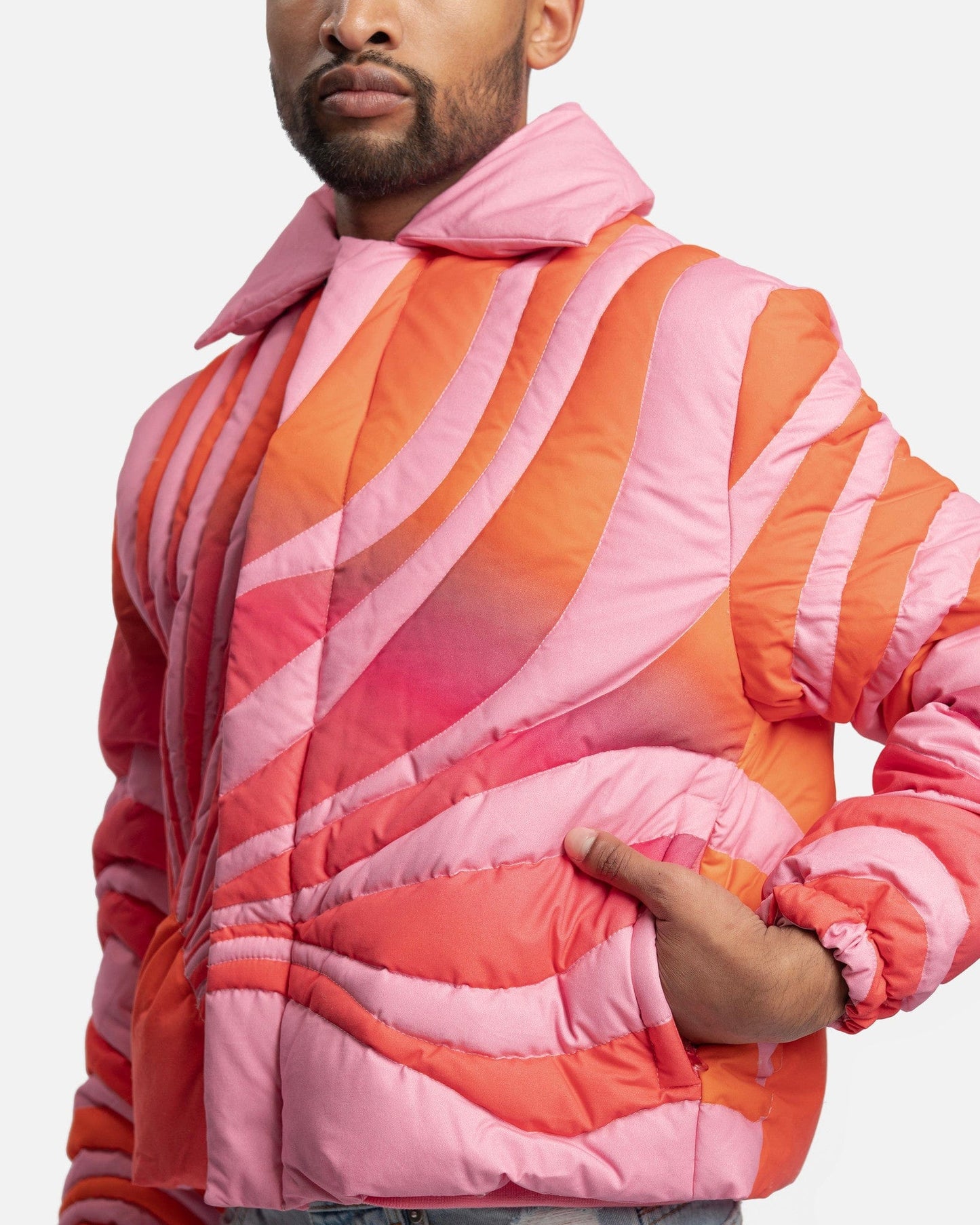 ERL men's puffer jacket in pink. The quilted puffers are always one of the most coveted pieces from ERL's collections. This jacket features a spread collar, a sunset motif, gradient dye, and elasticized cuffs.