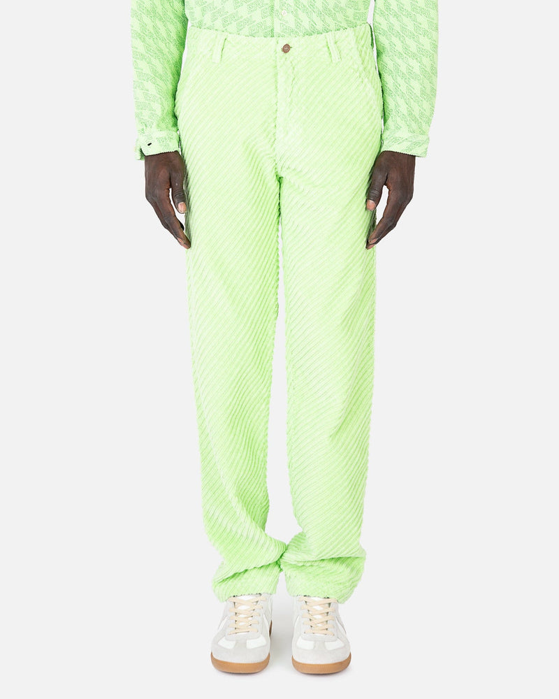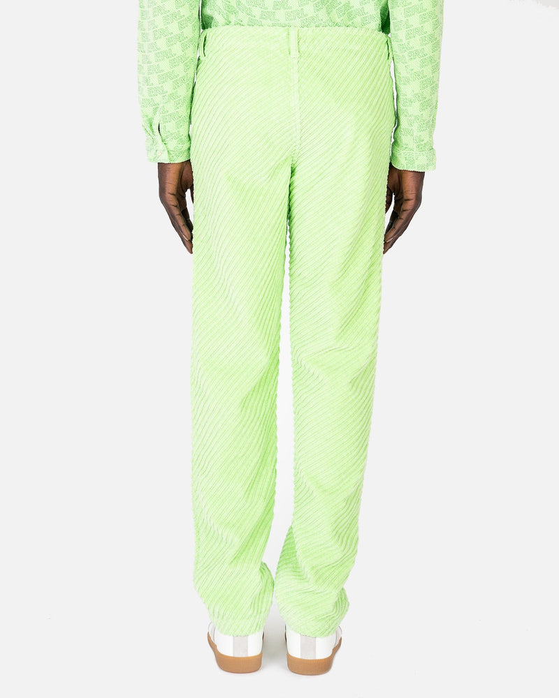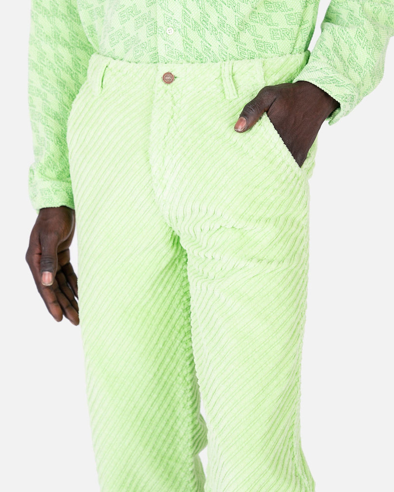 ERL men's lime green corduroy pants. These pants use front zip and button closure and two side slit pockets. They have a diagonal striped fuzzy texture throughout the body.