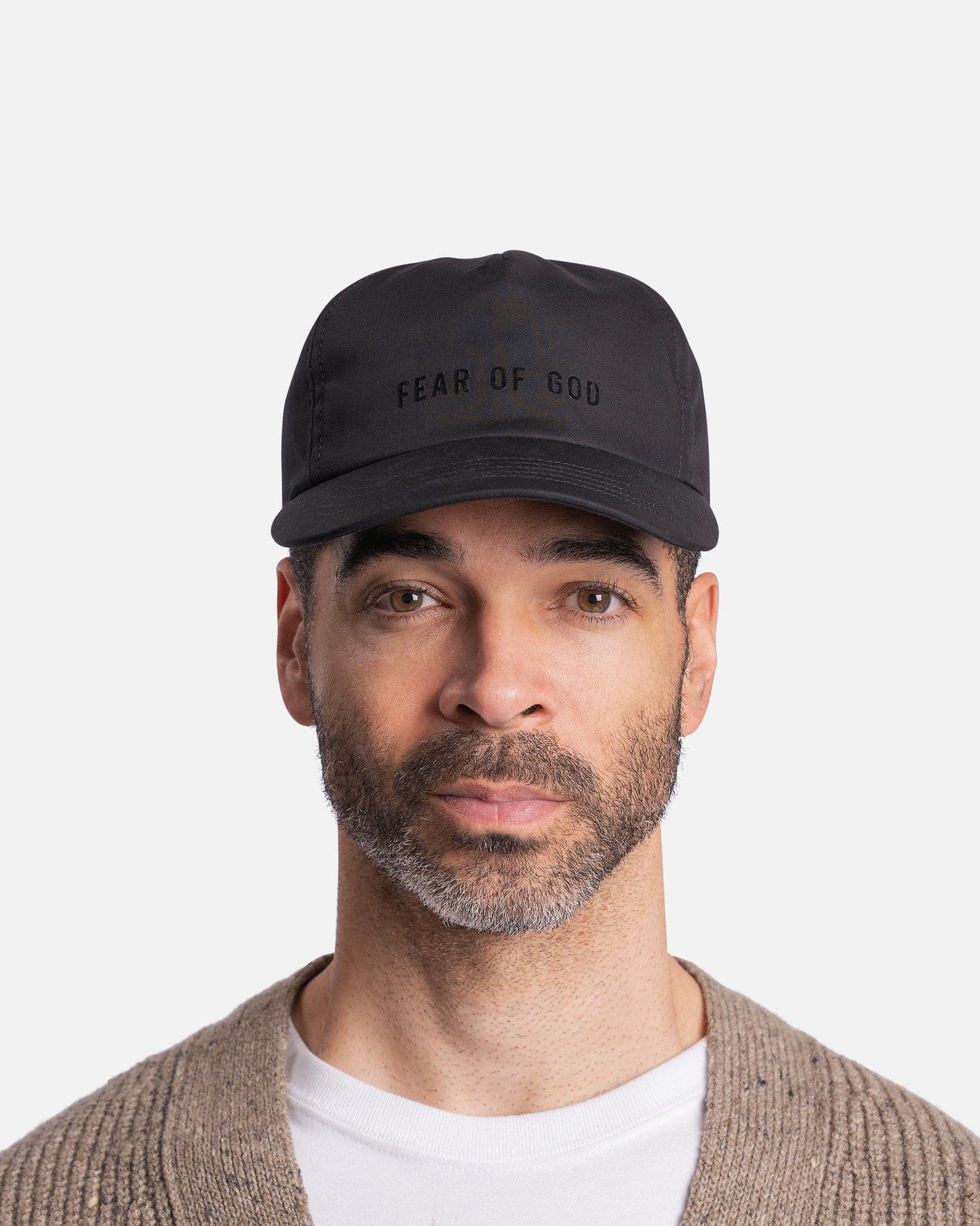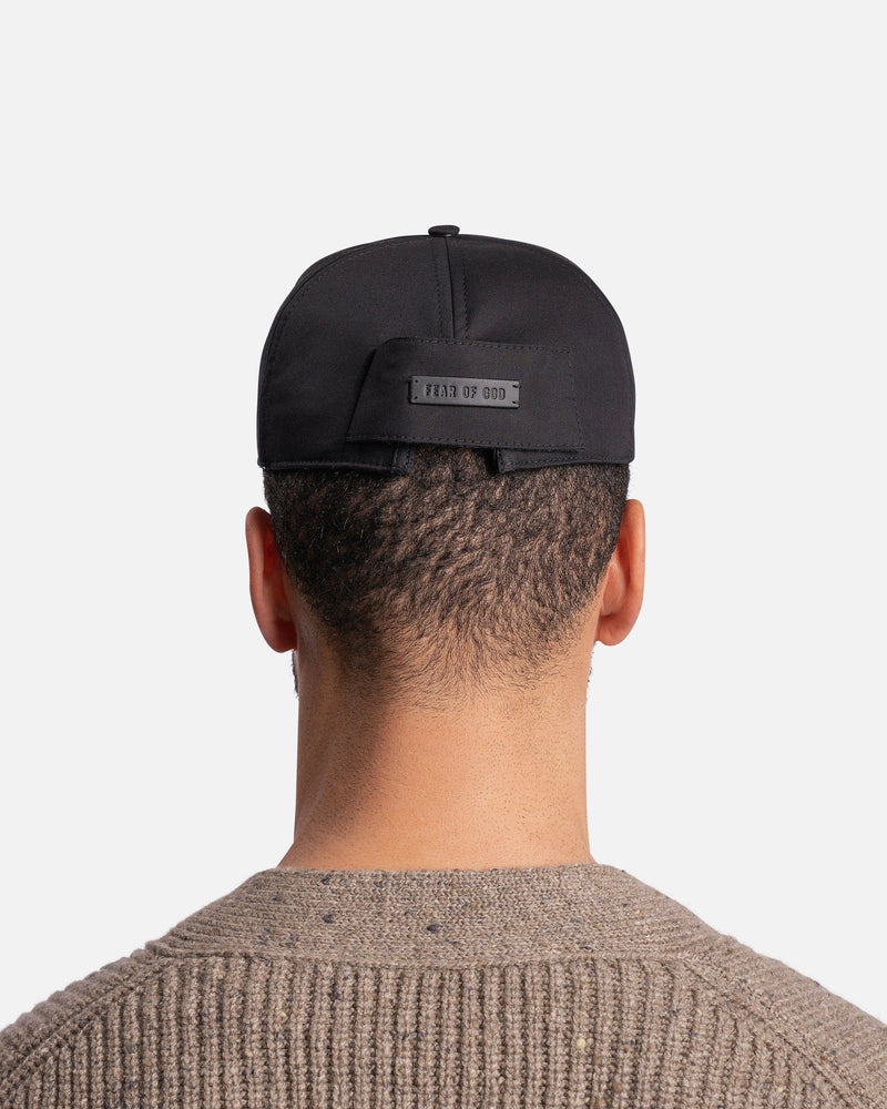 Fear of God cotton hat in black. This hat features an oversized brim and flocked logo text on the face. There is velcro closure with a leather logo patch on the back.