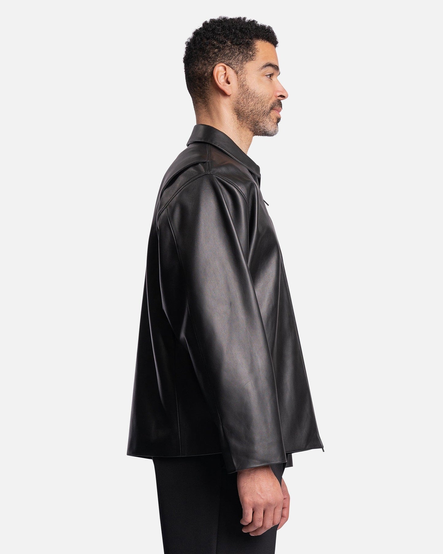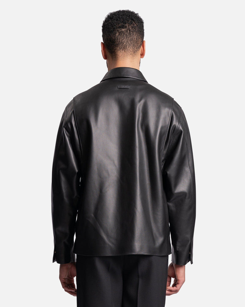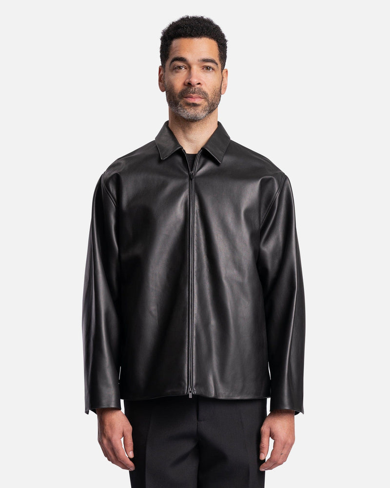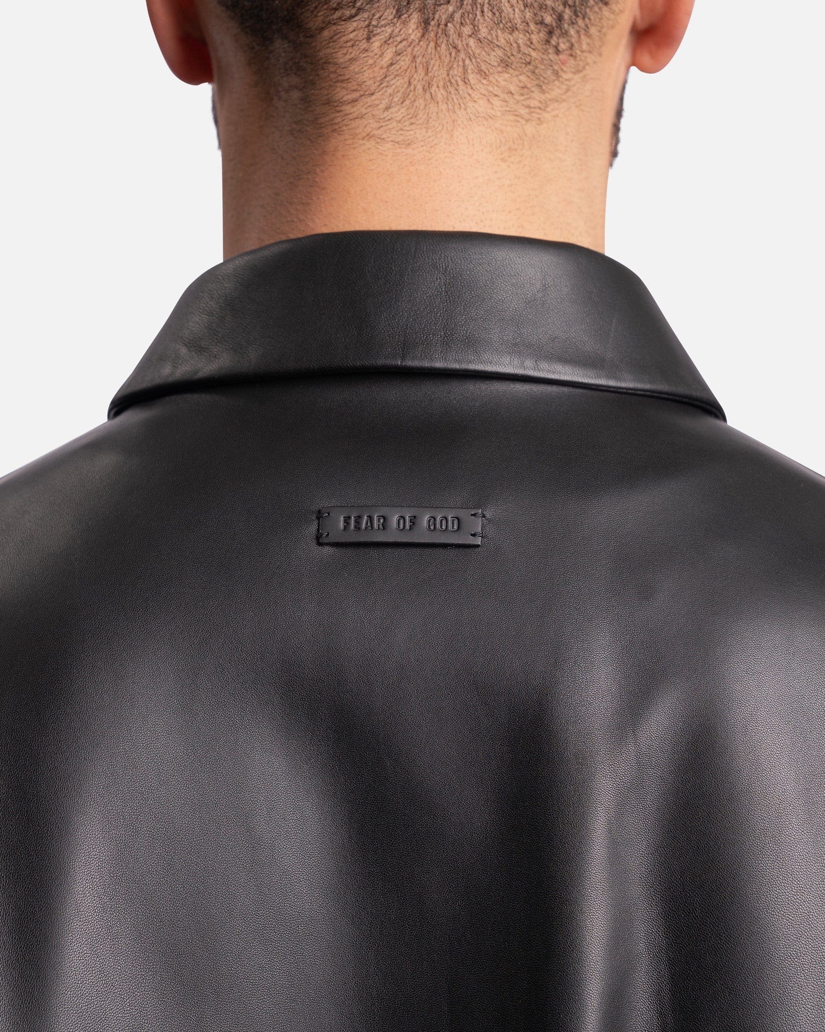 Fear of God men's leather jacket in black. This jacket features a classic collar and two way zip closure. It has dropped shoulders and an action back, made in the softest Italian leather.