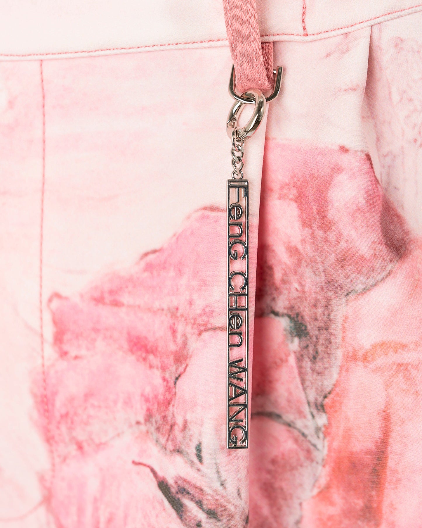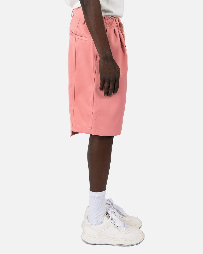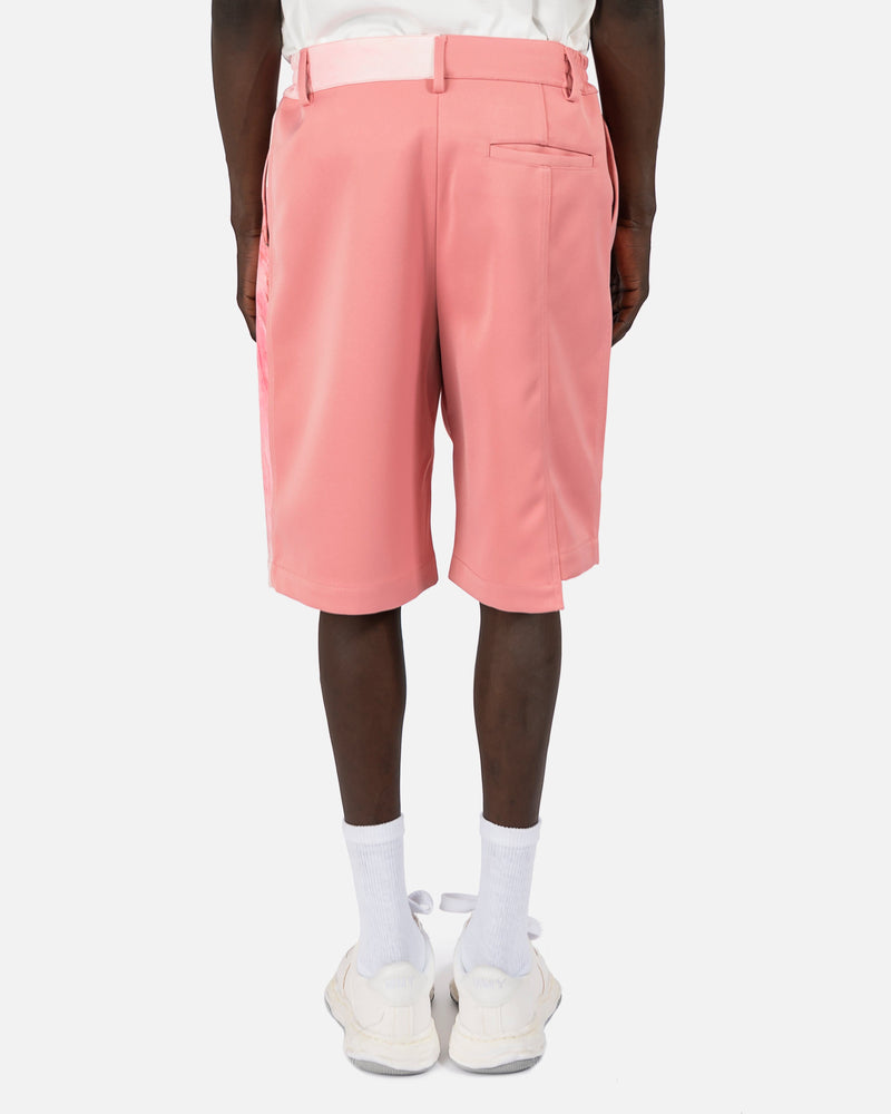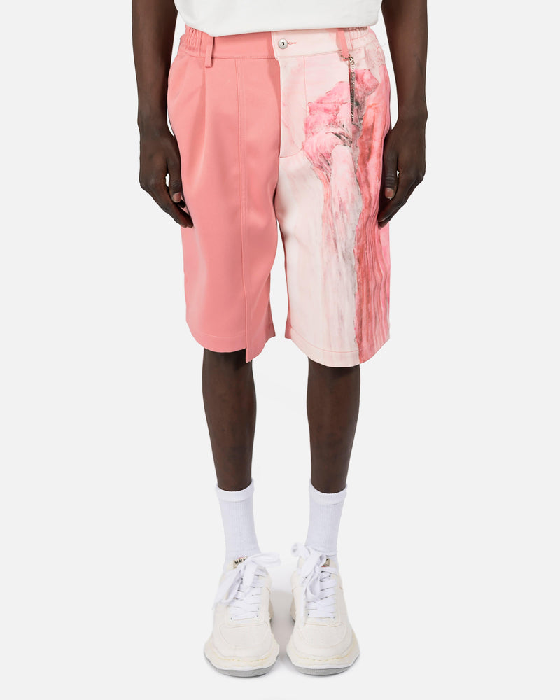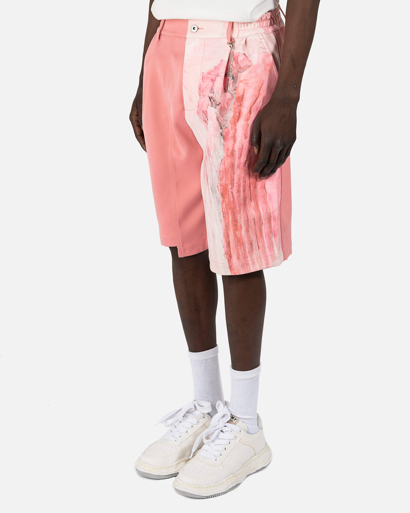 Feng Chen Wang men's Chinese landscape printed Bermuda shorts in pink. These shorts pay homage to the label's home of China by featuring a print of Chinese inspired scenery. The shorts are designed to fit loose and look oversized, but feature an elastic waist with a front button and zip closure to customize fit. These shorts also feature knee length hems and dart detailing, with the solid pink leg featuring a high-low cut-out hem as well.