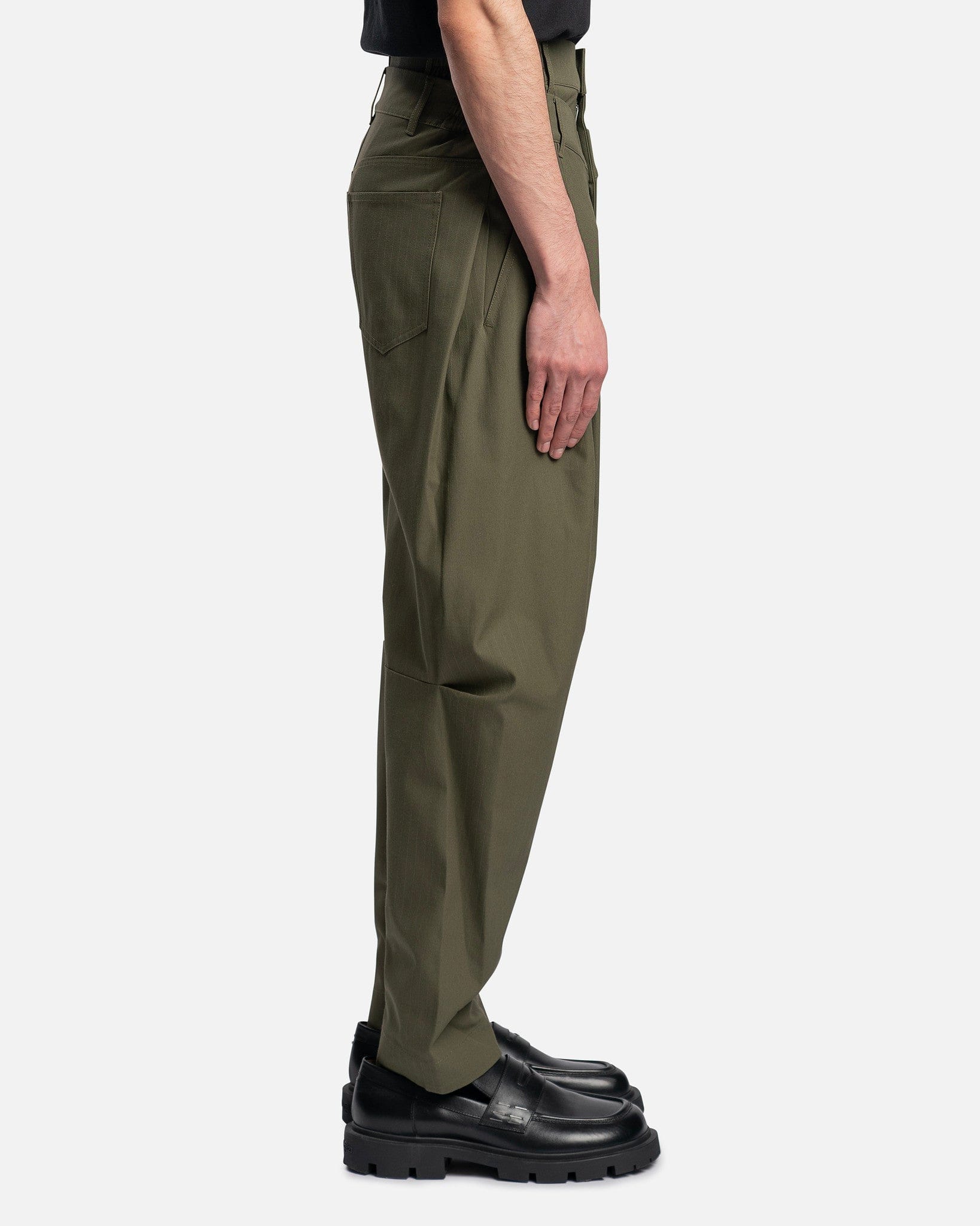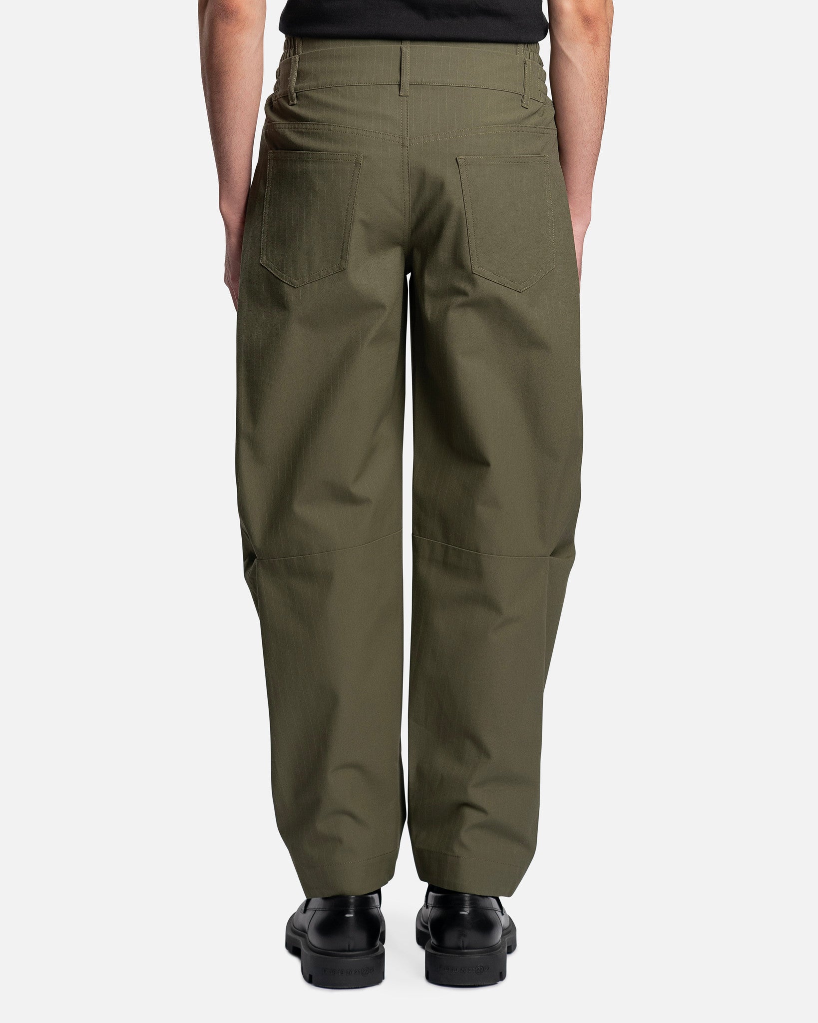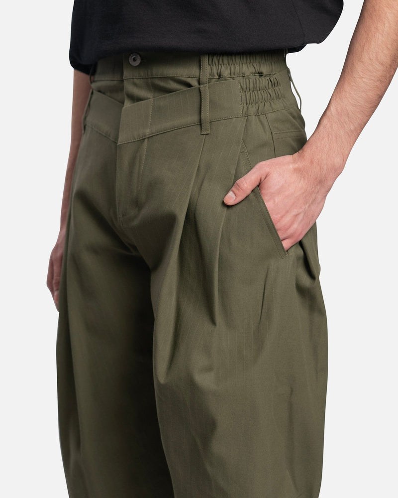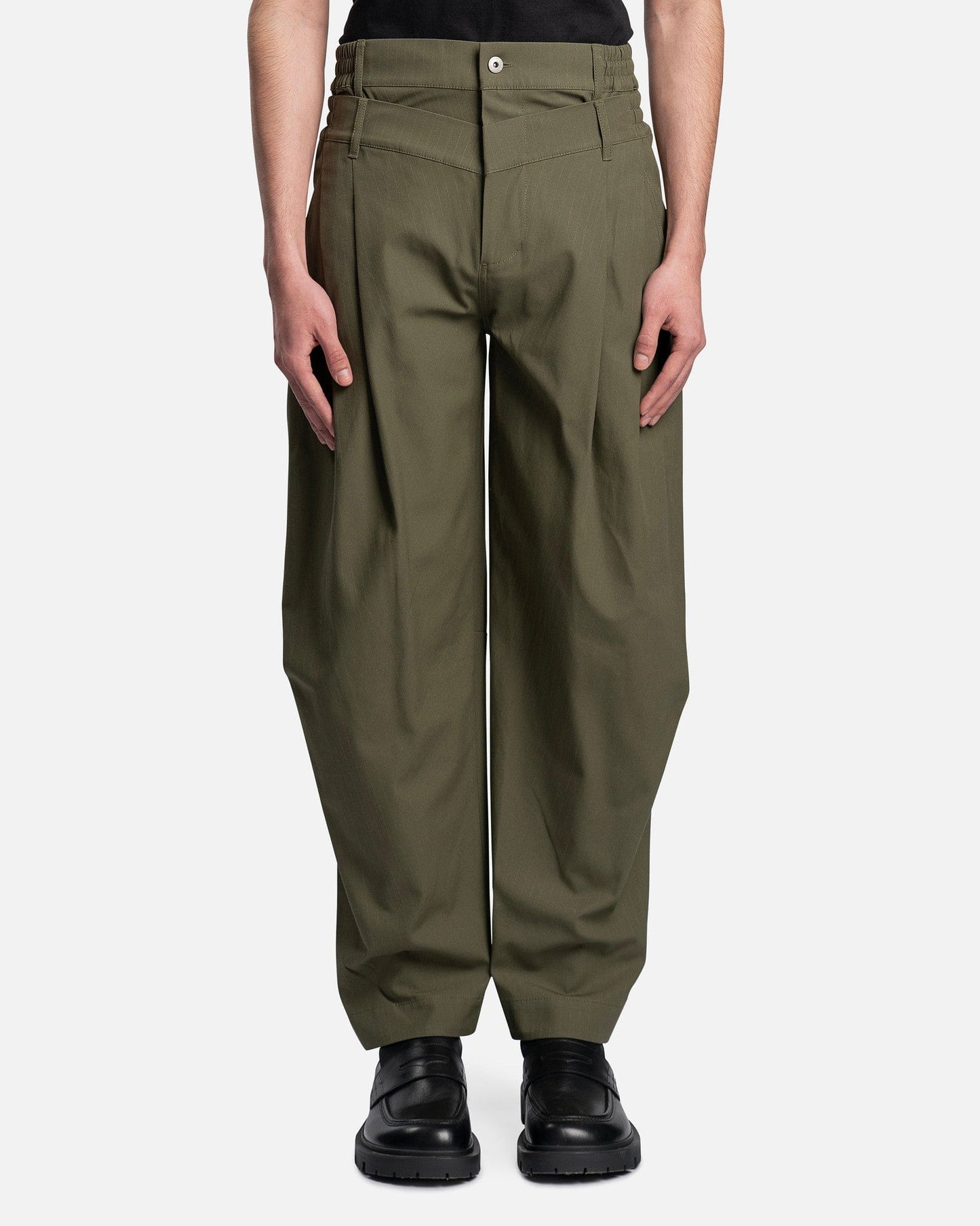 Feng Chen Wang men's double waisted trousers in green. These pants feature a tapered cargo silhouette with double waistband details.
