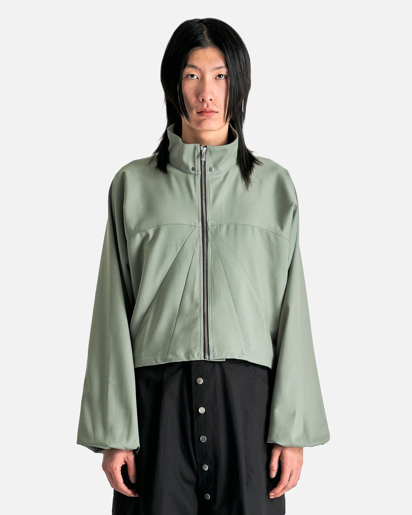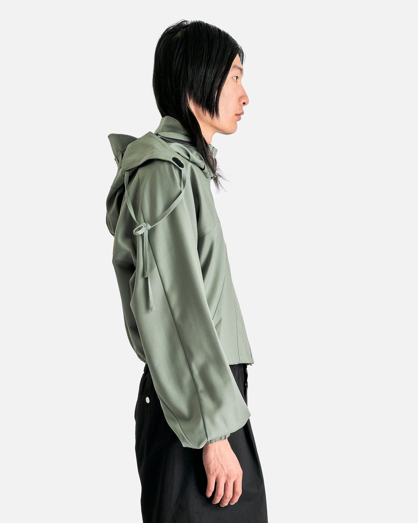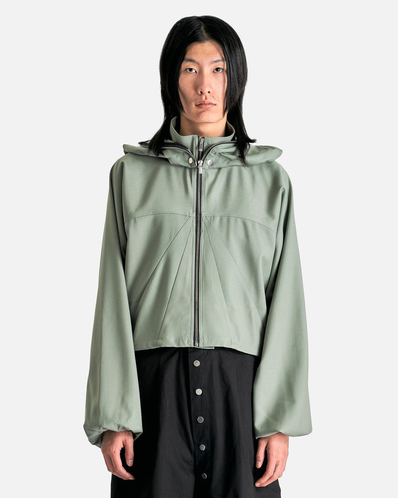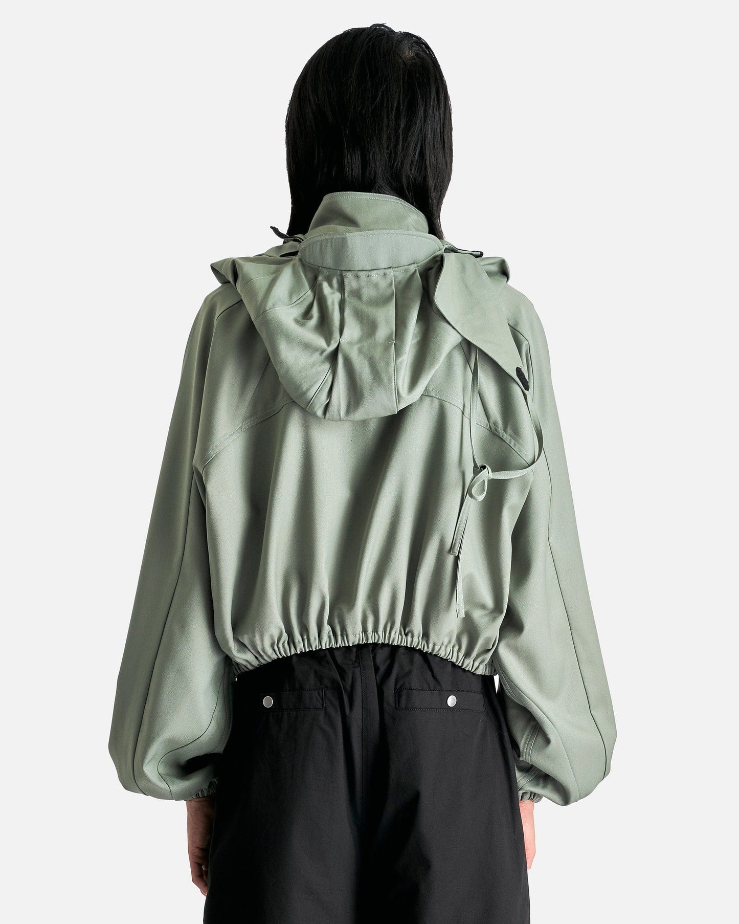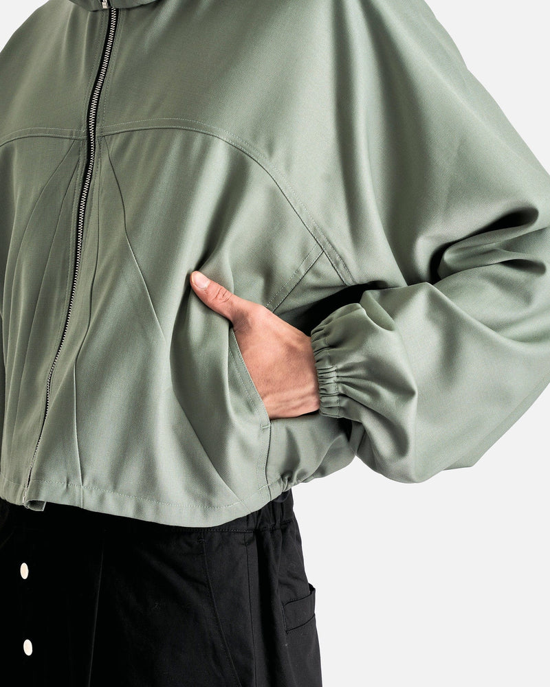 FFFPOSTALSERVICE Hooded Parachute Cropped Jacket in Tokyo Green. The jacket features a detachable, partially zipped hood, front zip closure, side seam pockets and elasticated back hem.