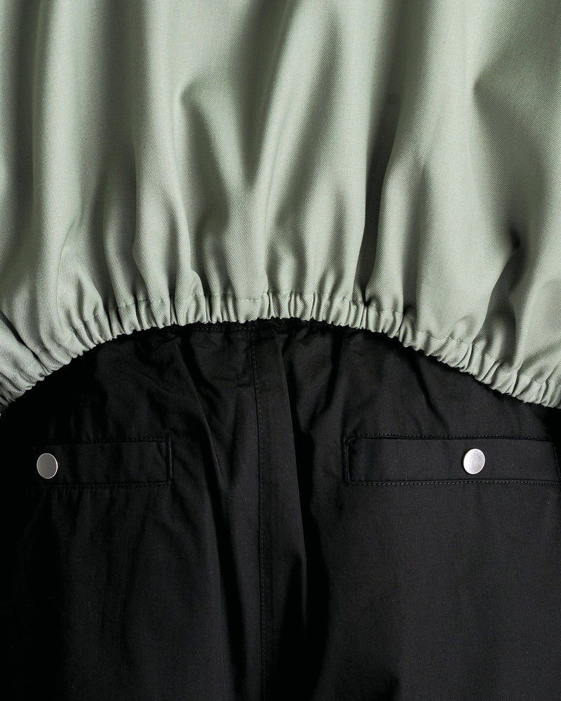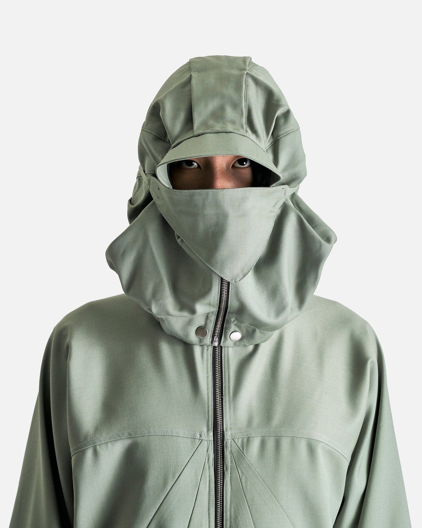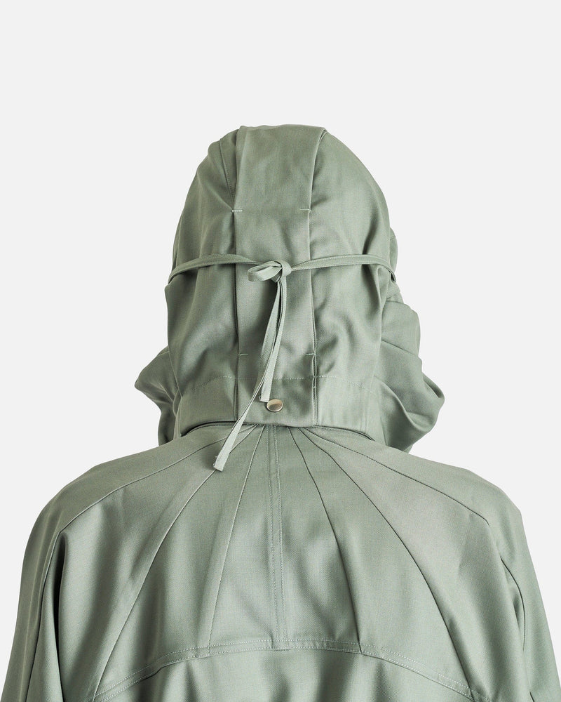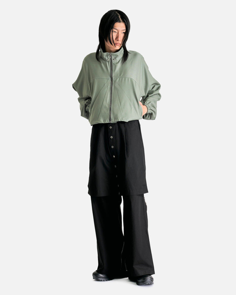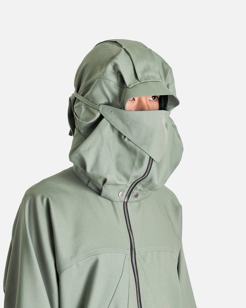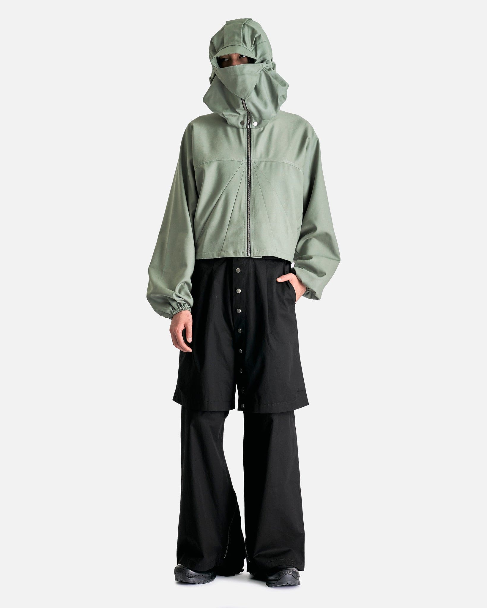 FFFPOSTALSERVICE Hooded Parachute Cropped Jacket in Tokyo Green. The jacket features a detachable, partially zipped hood, front zip closure, side seam pockets and elasticated back hem.