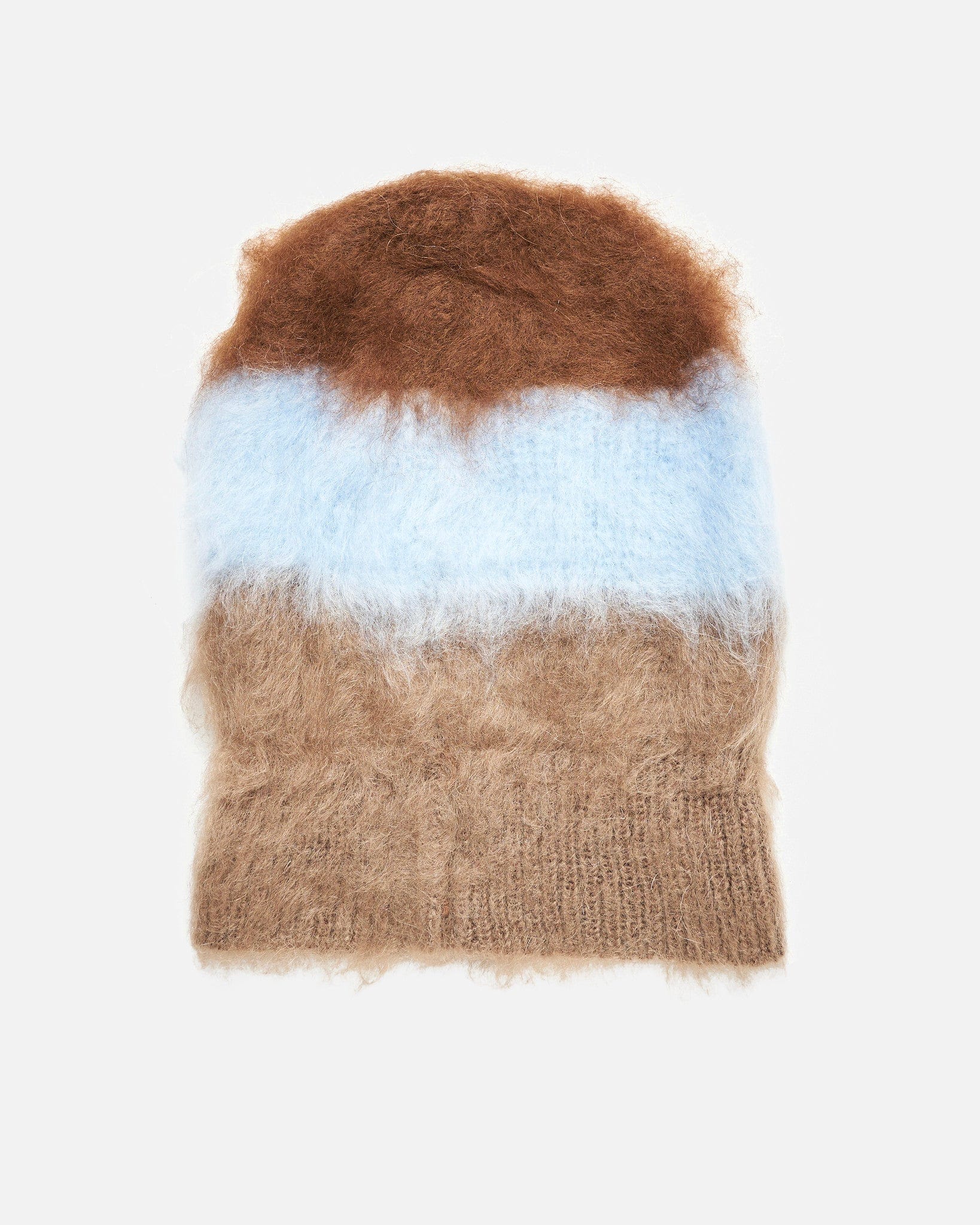 Edward Cuming men's fuzzy mohair knit hat in light brown and blue. This hat has a soft, hairy texture, stripes throughout the body.