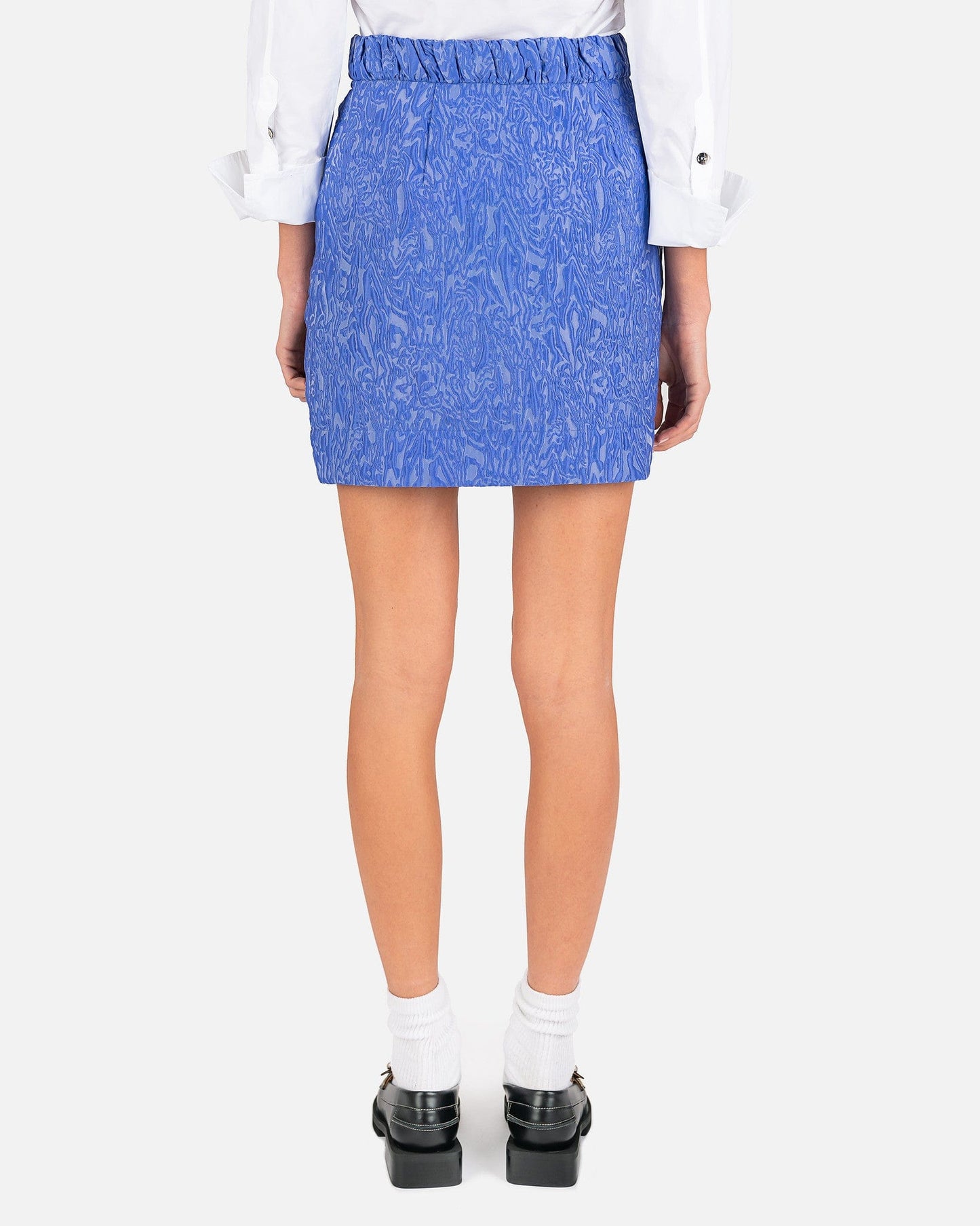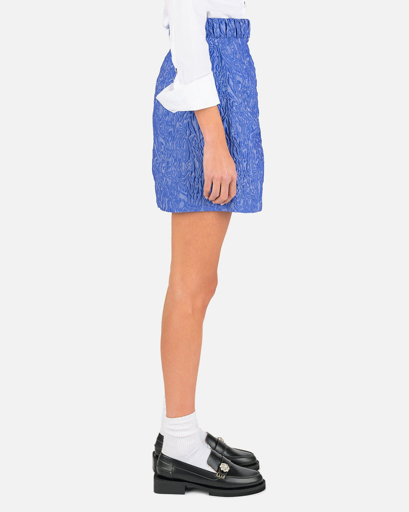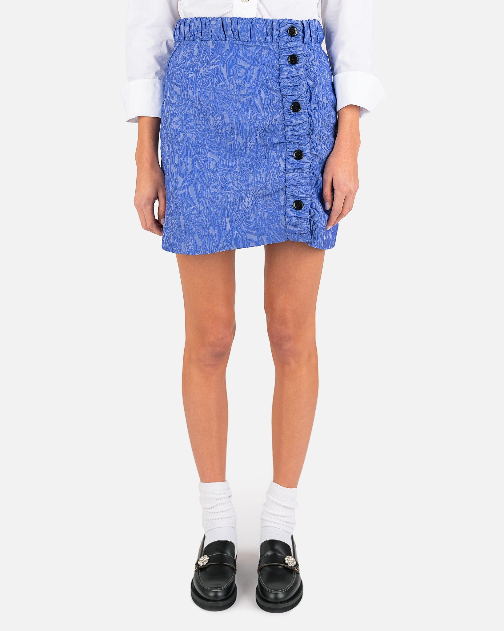 Ganni women's jacquard print mini skirt in periwinkle. This skirt features an asymmetrical button placket across the front and an elasticized waistband. These is an allover texturized jacquard pattern.