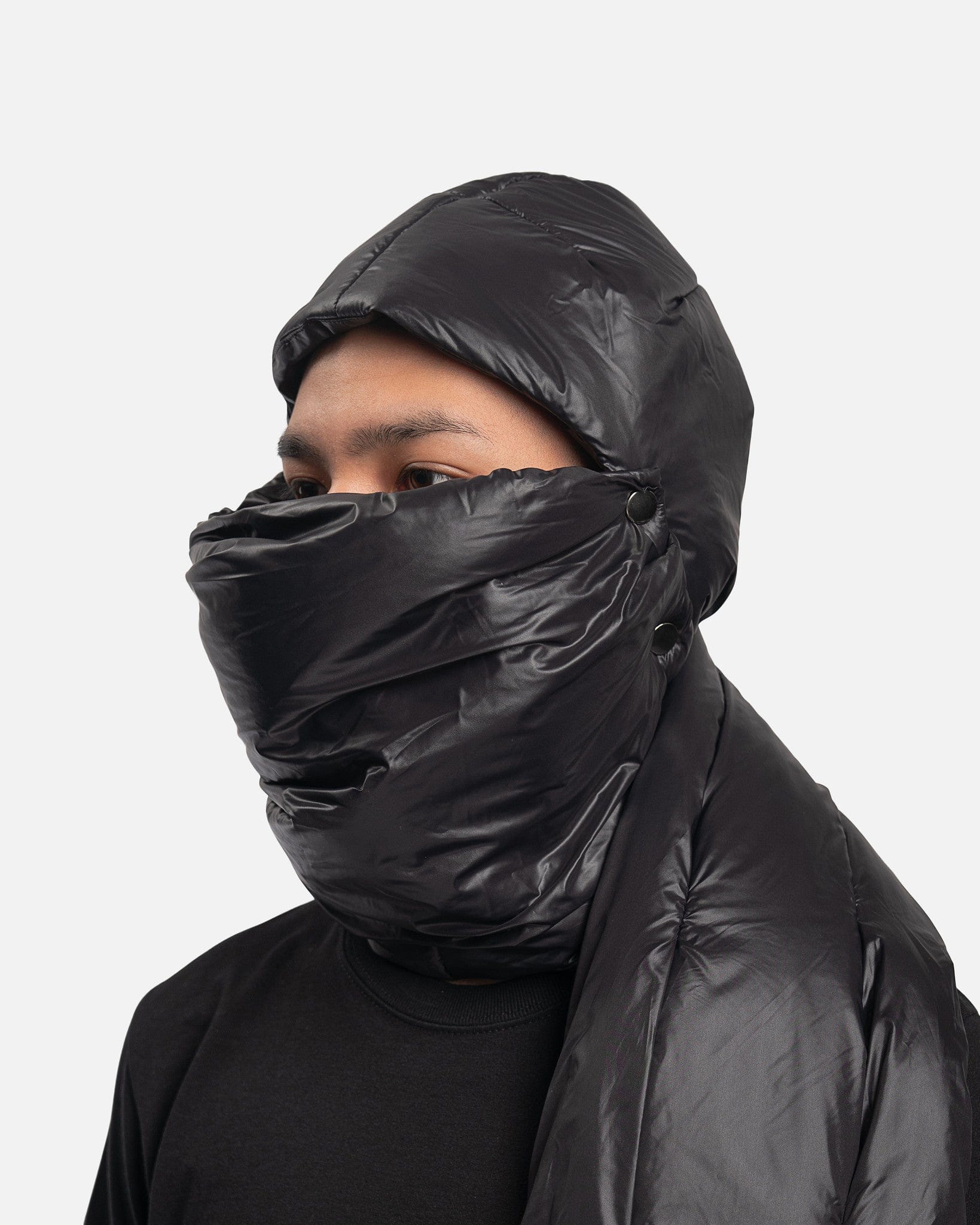 GOOMHEO men's puffer balaclava in black. This balaclava has an attached scarf that wraps around the shoulder.