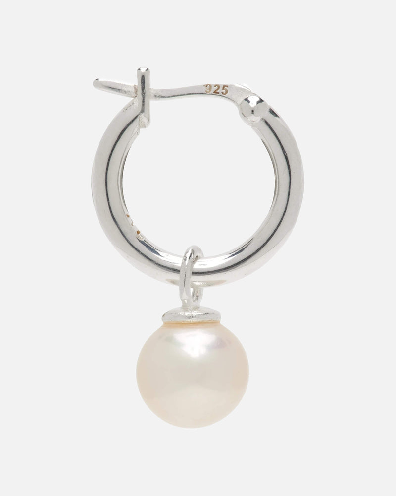 Hatton Labs pearl hoop earrings. These handcrafted earrings are made of sterling silver and have a pearl pendant at the drop.