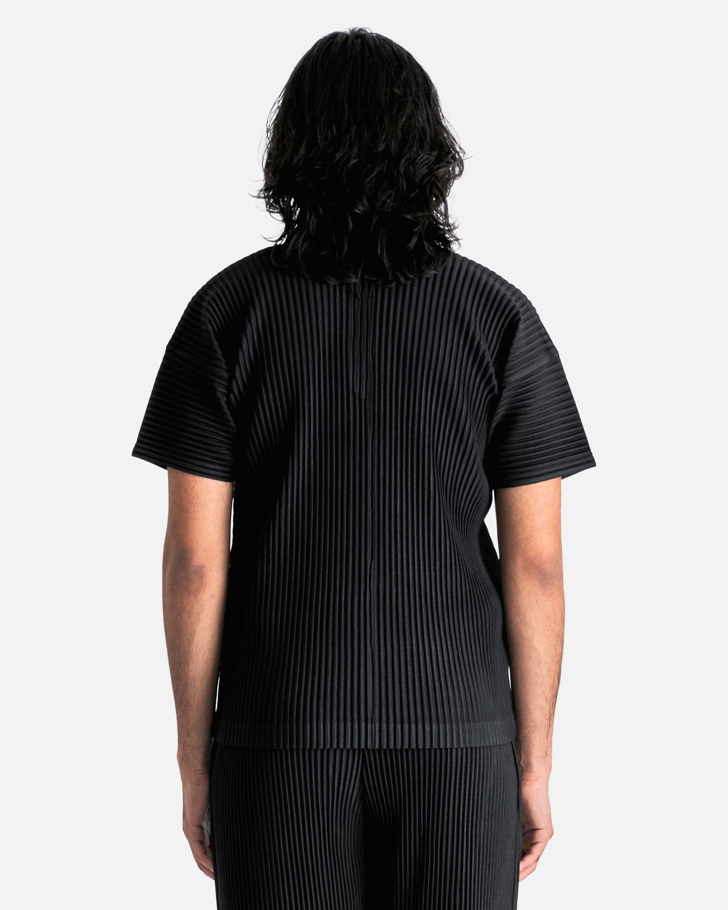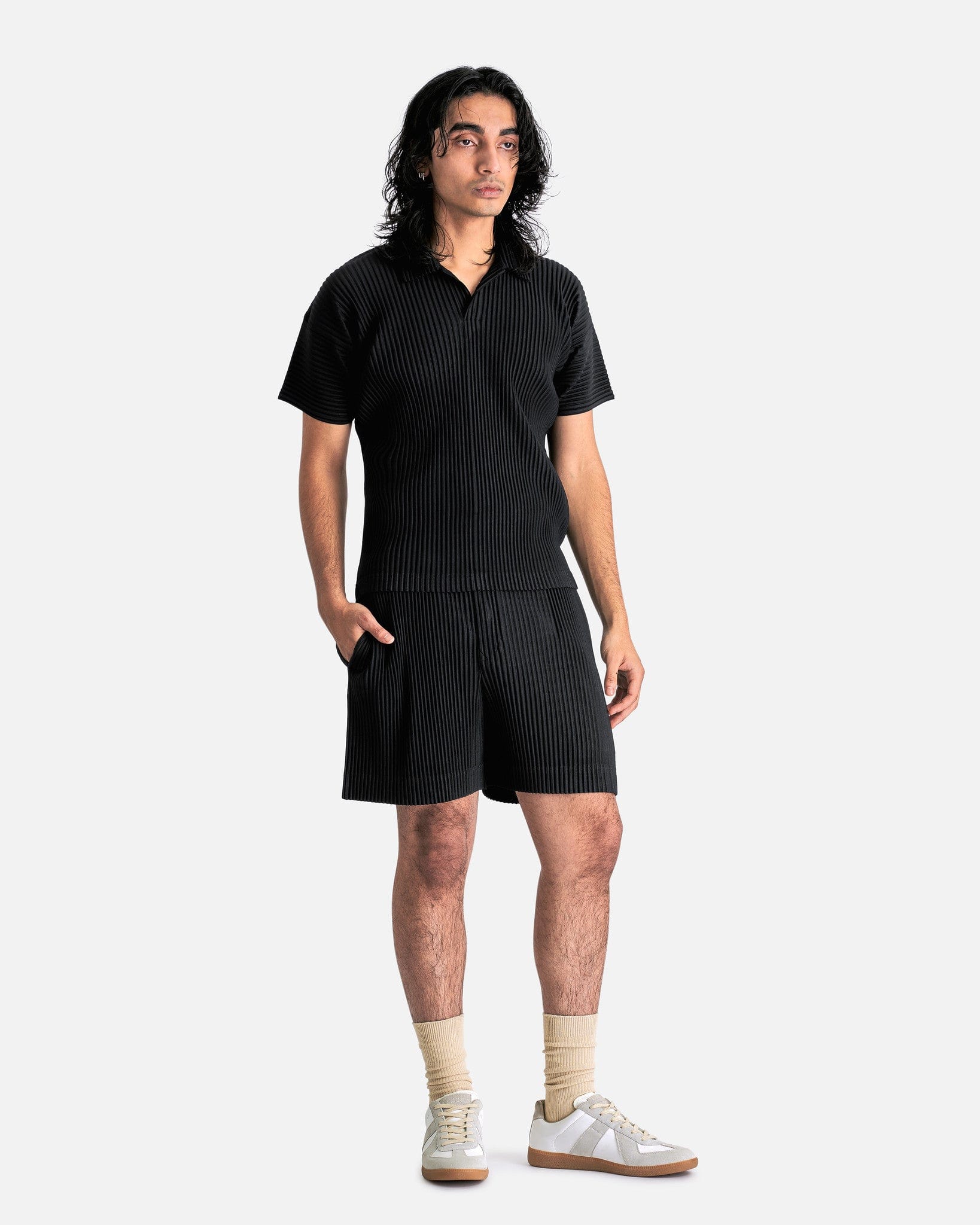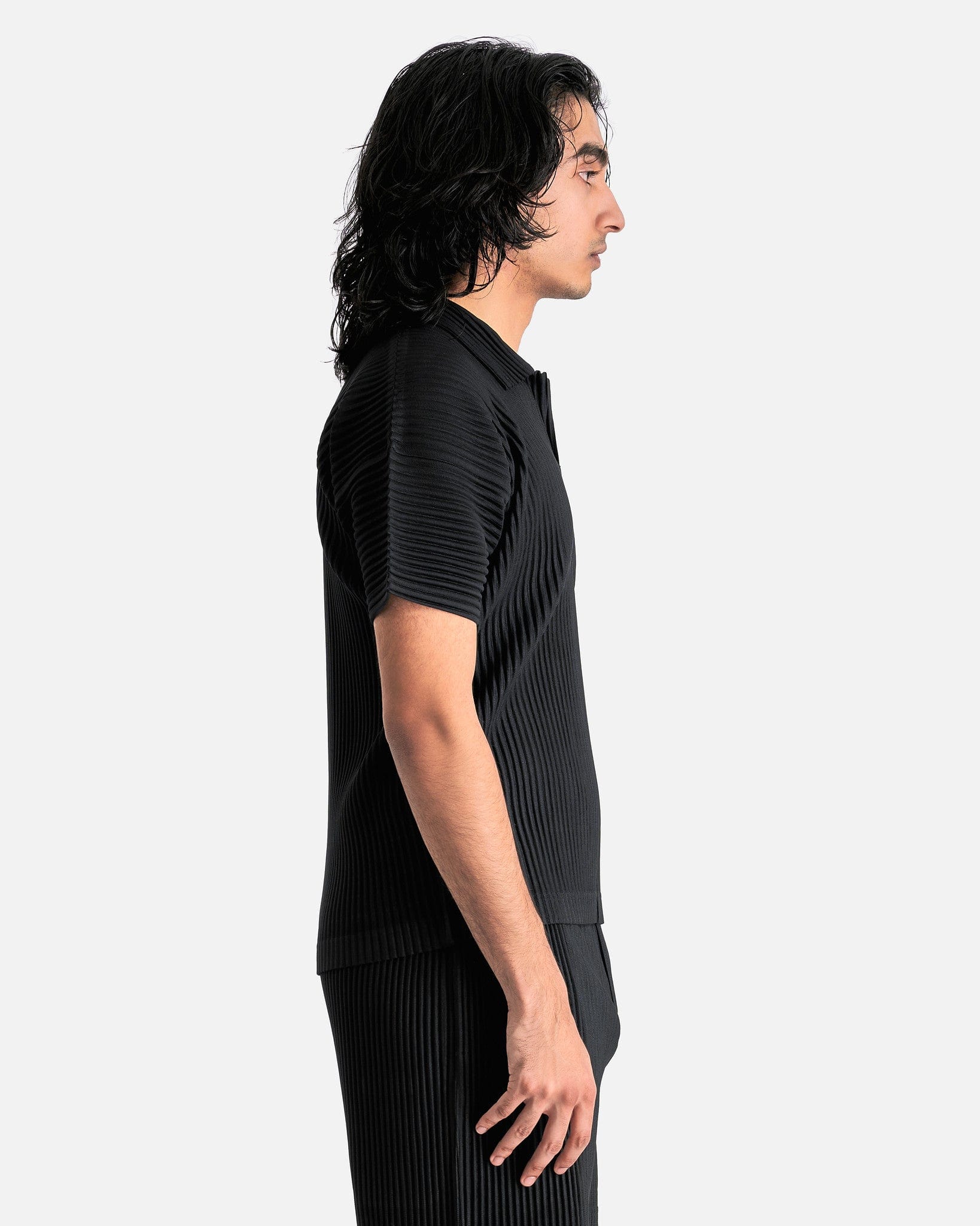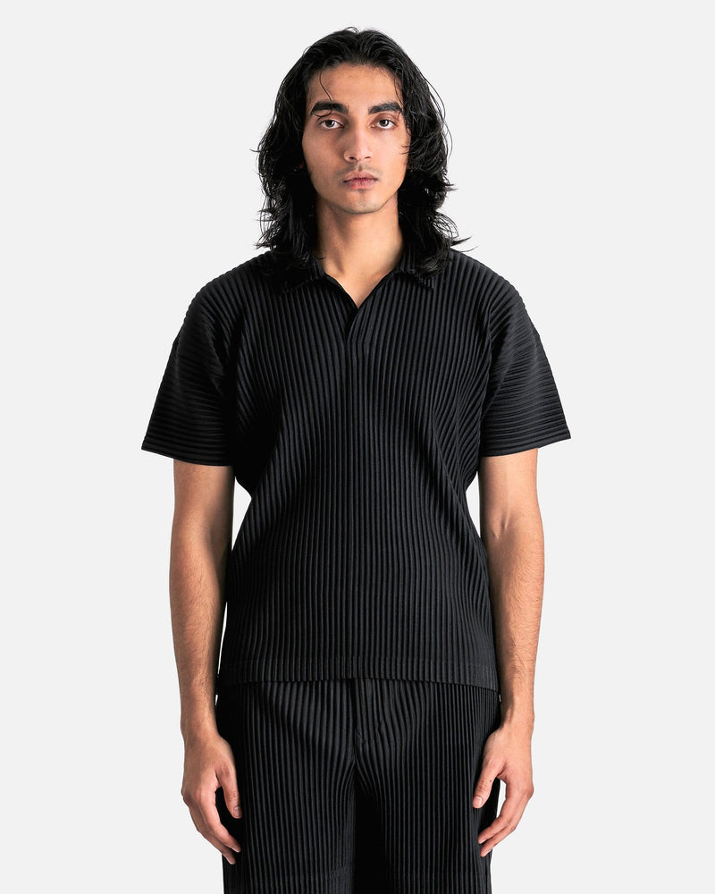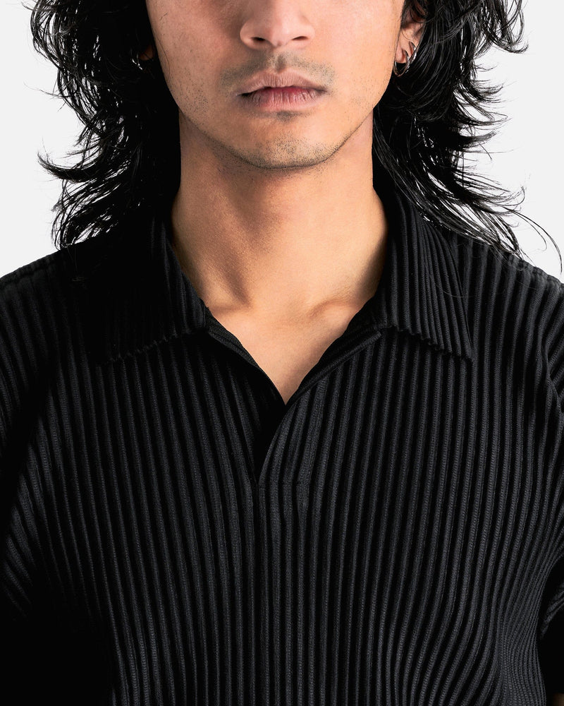 Homme Plissé Issey Miyake Basics Pleated Polo Shirt in Black. This pleated polo features a spread collar, dropped shoulder seams and a straight hem.