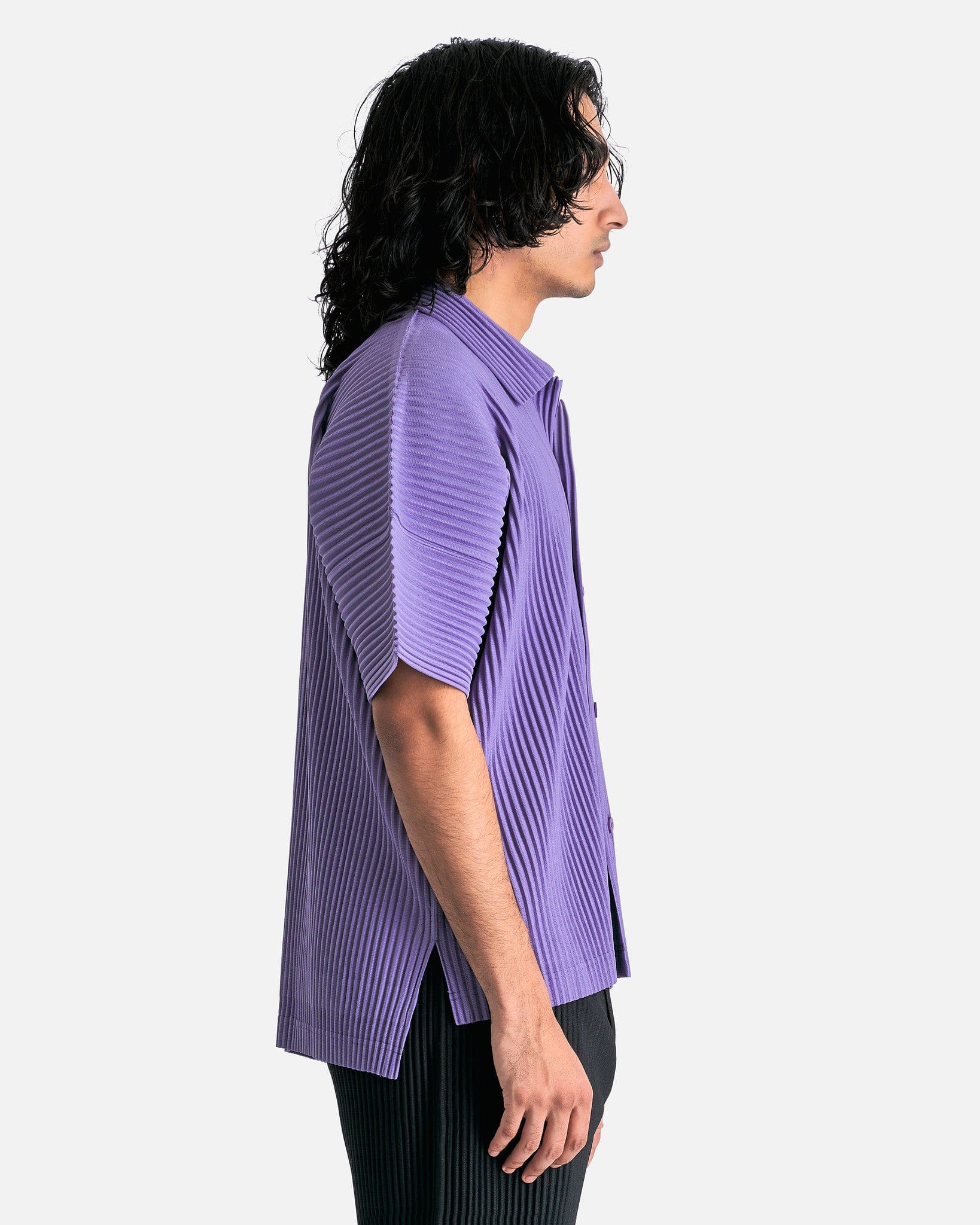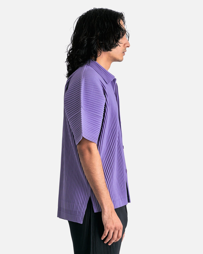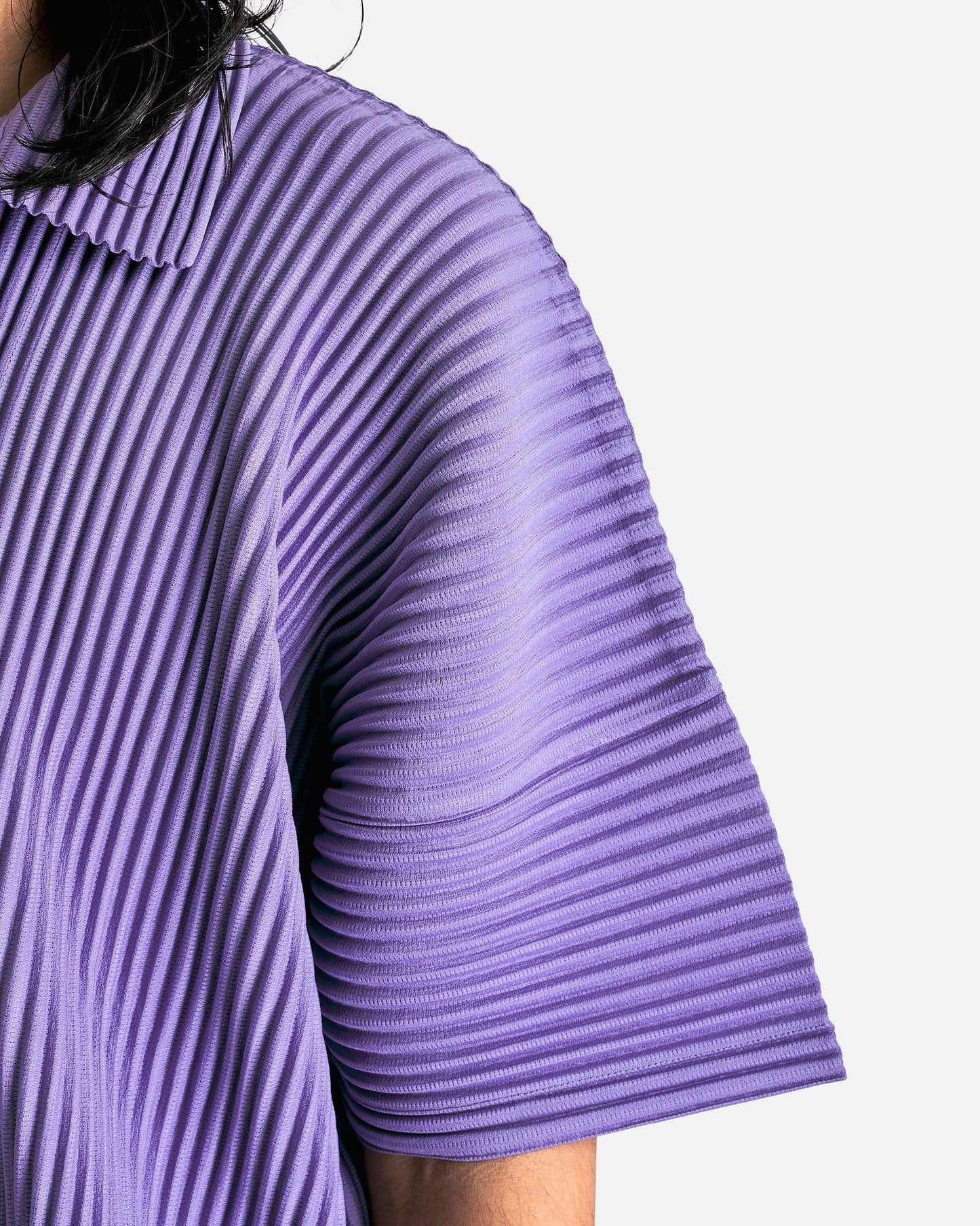 Homme Plissé Issey Miyake MC July Shirt in Gray Purple. This pleated shirt features a spread collar, dropped shoulder seams and a front button closure.