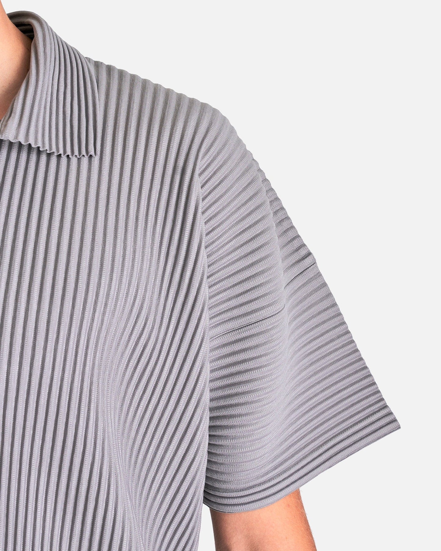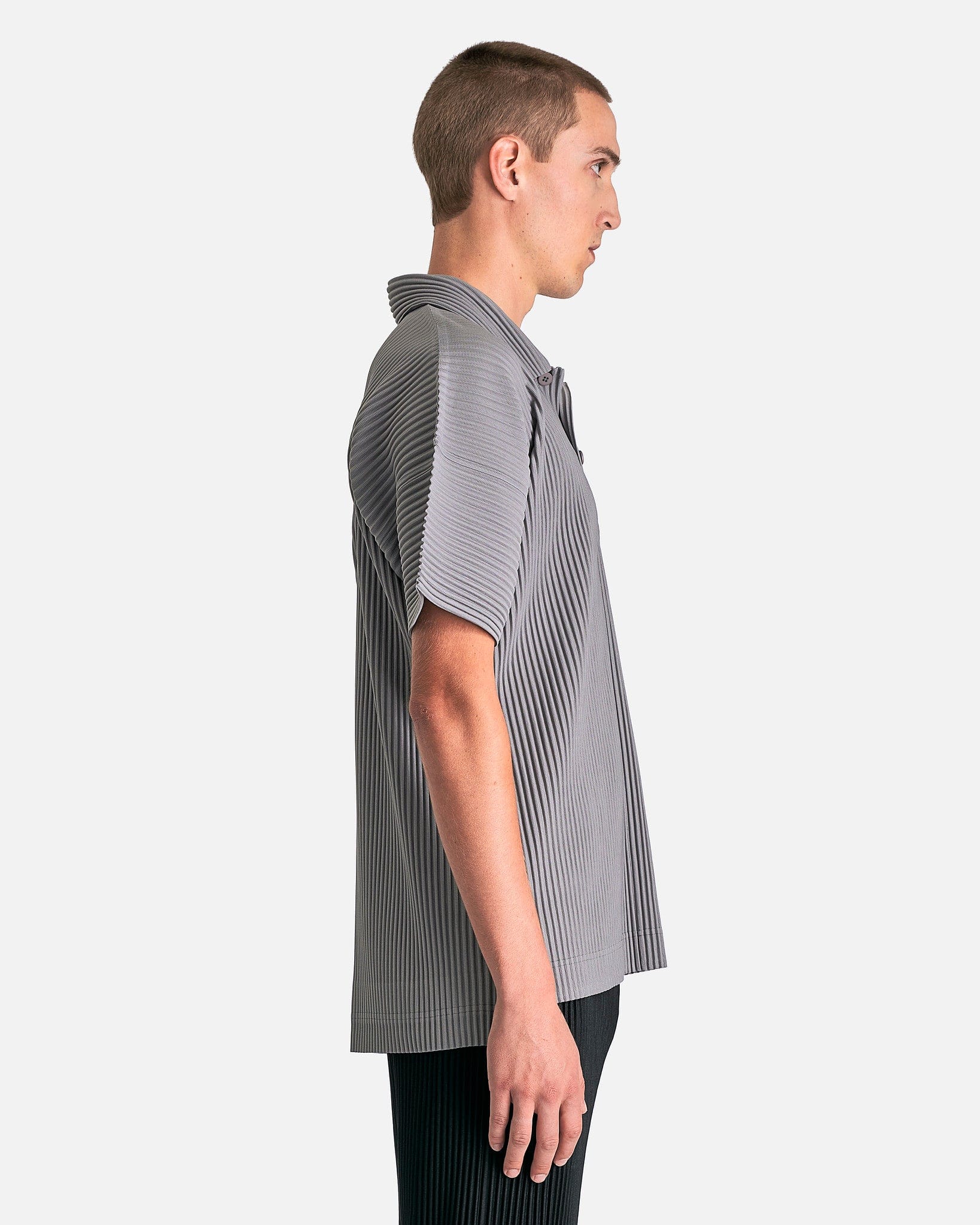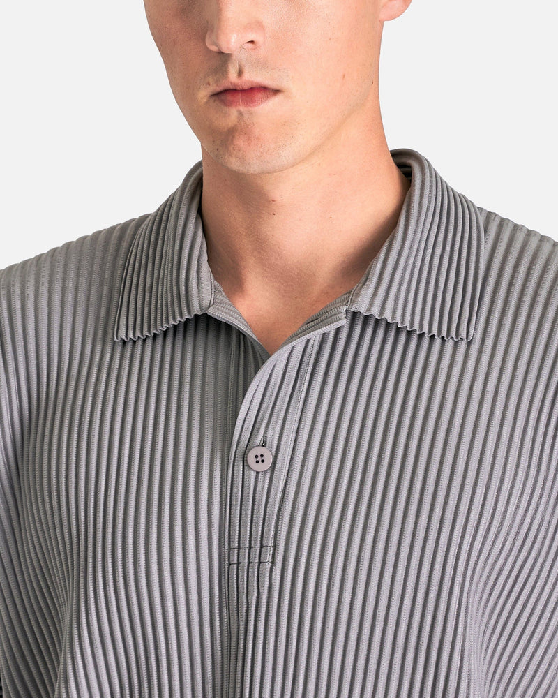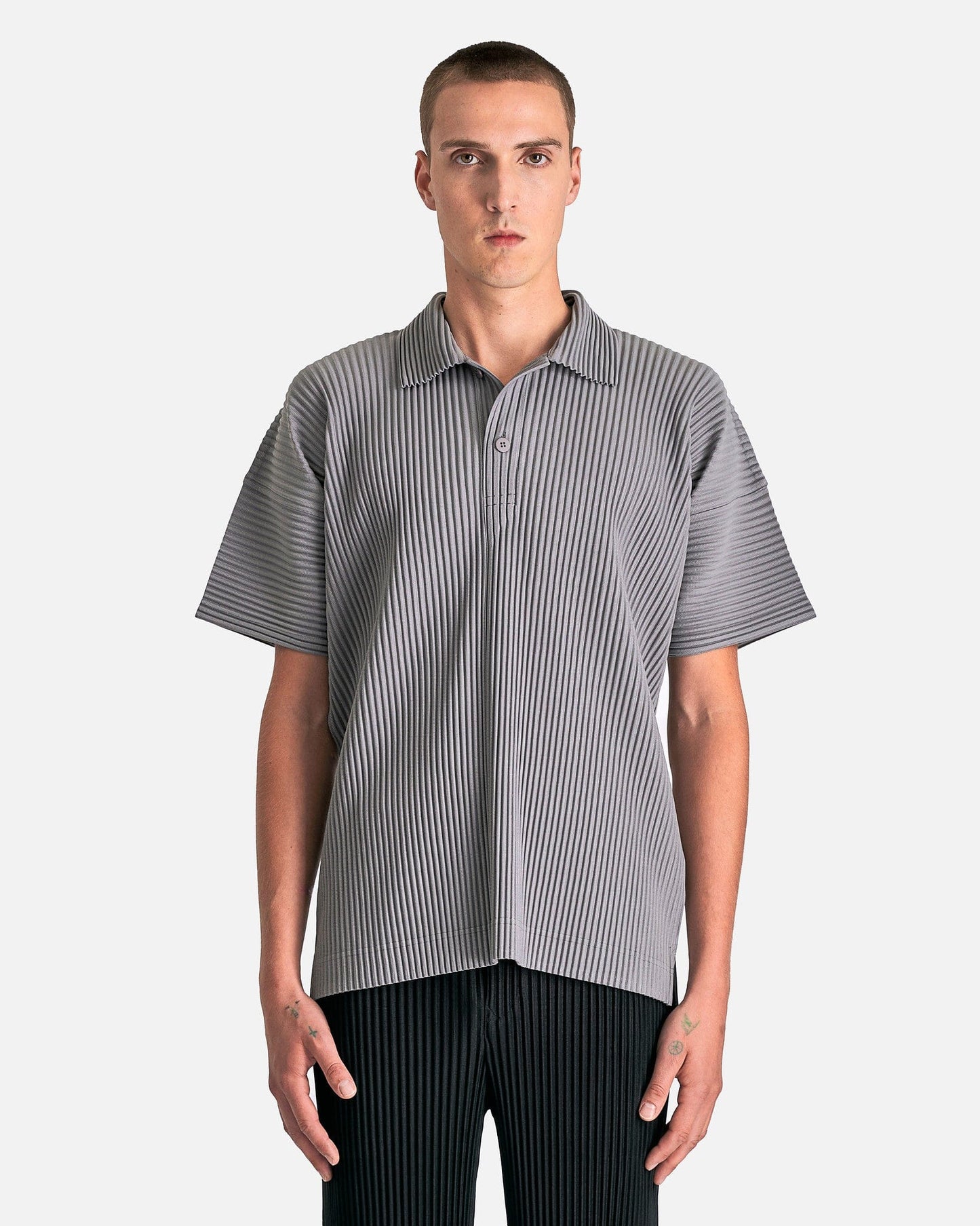 Homme Plissé Issey Miyake MC May Polo Shirt in Warm Gray. This polo shirt features a spread collar, two-button closure, pinched seams at the shoulder and a straight hem.