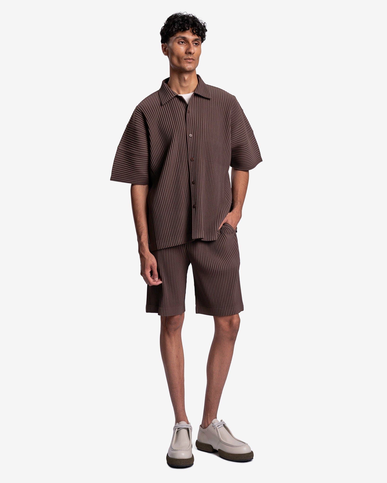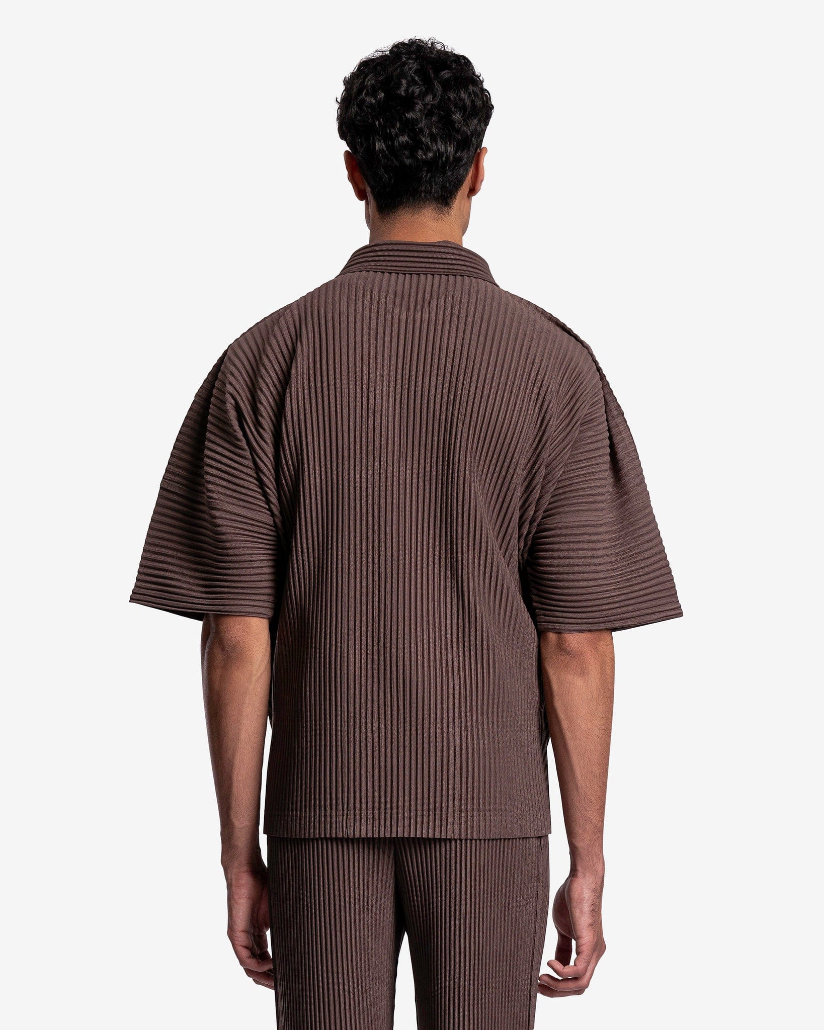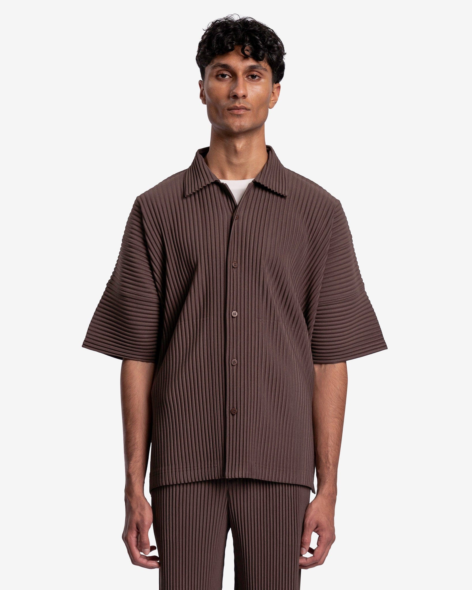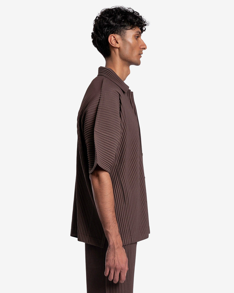 Homme Plissé Issey Miyake brown pleated button up shirt. This top has a spread collar and uses front button closure.