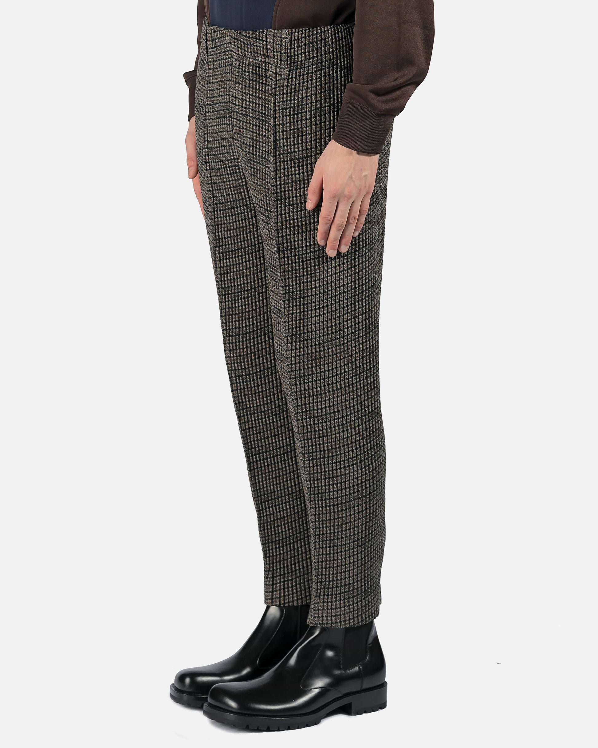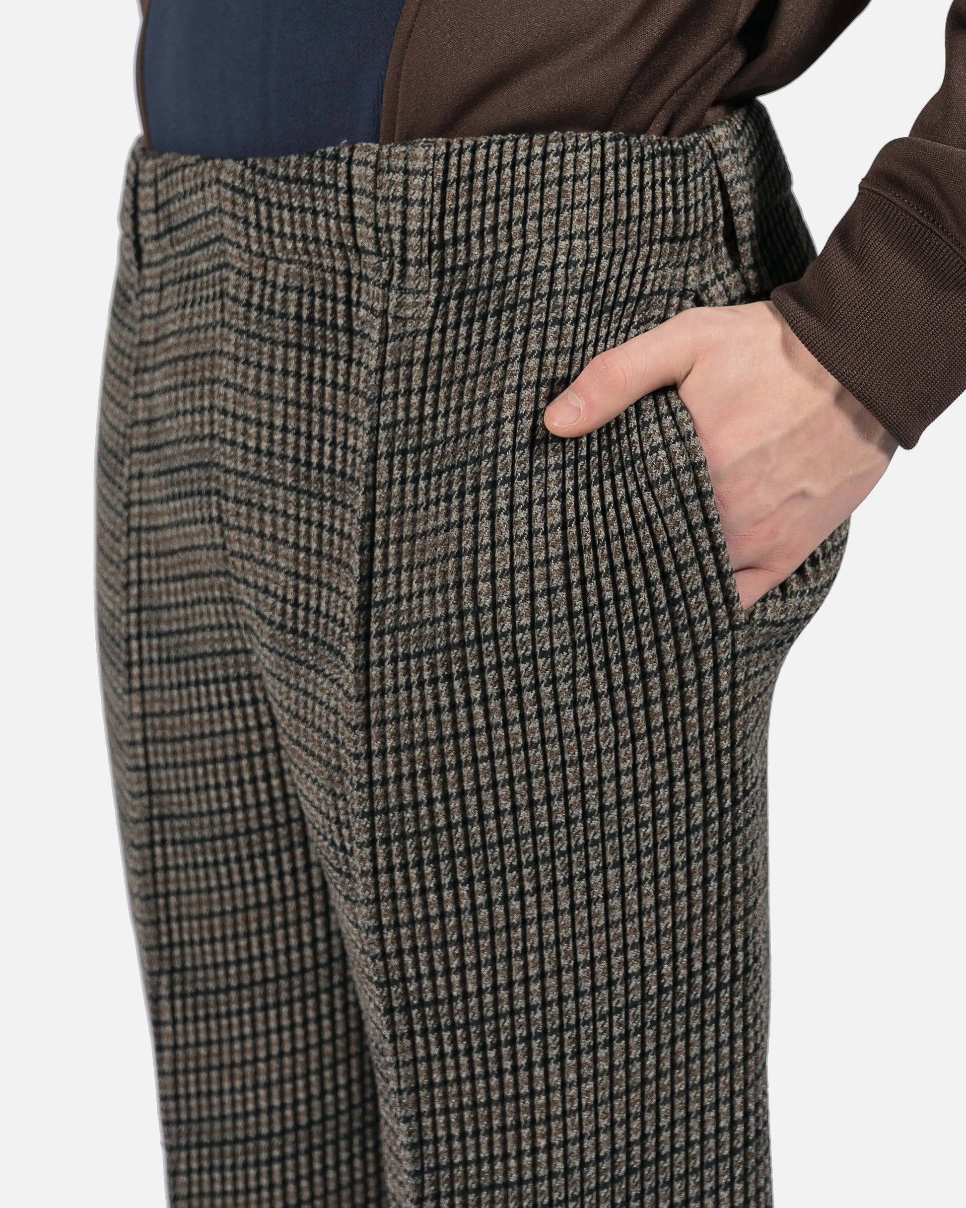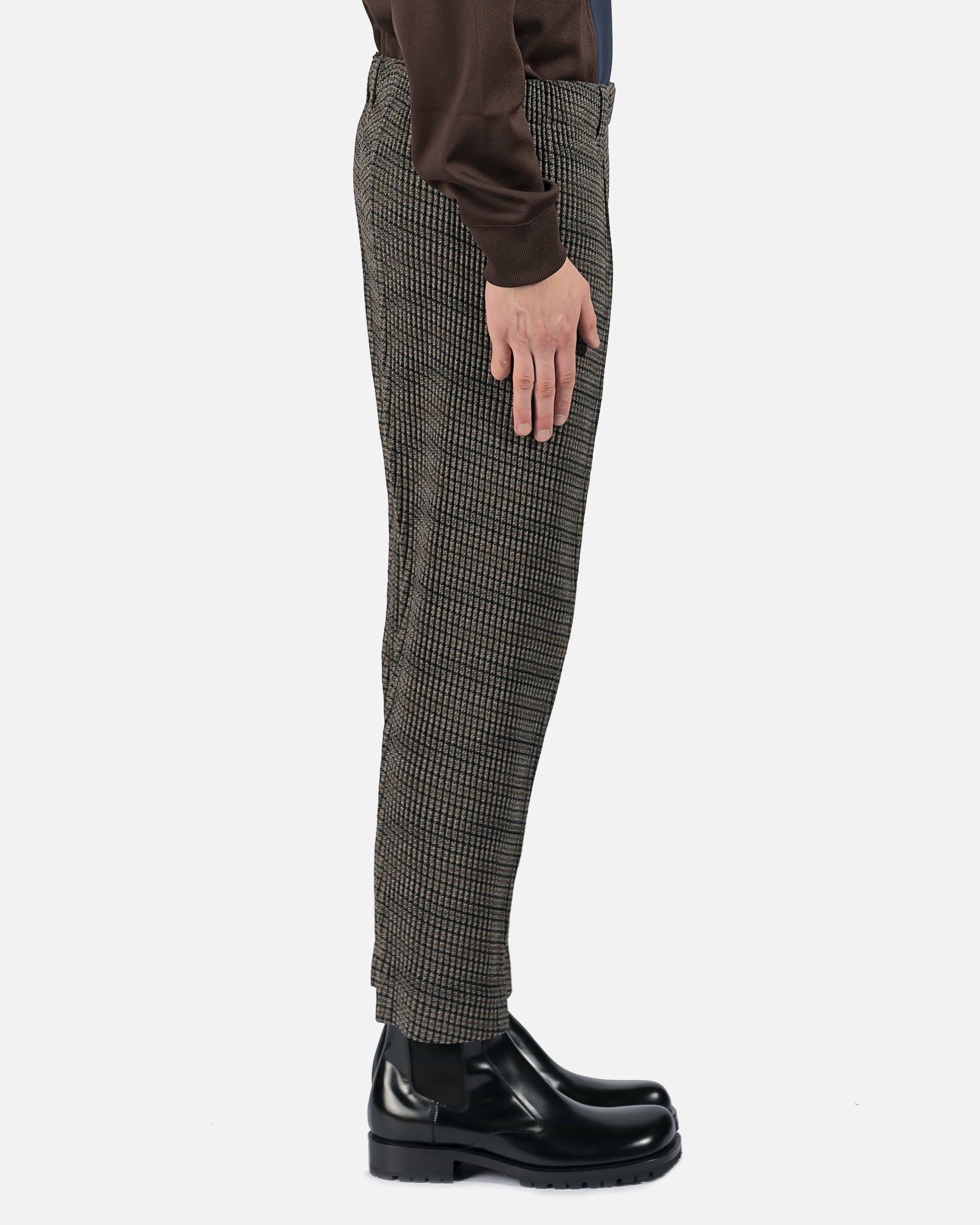 Slim-fit grommet pleated tweed trousers featuring houndstooth pattern in brown, black, and grey.