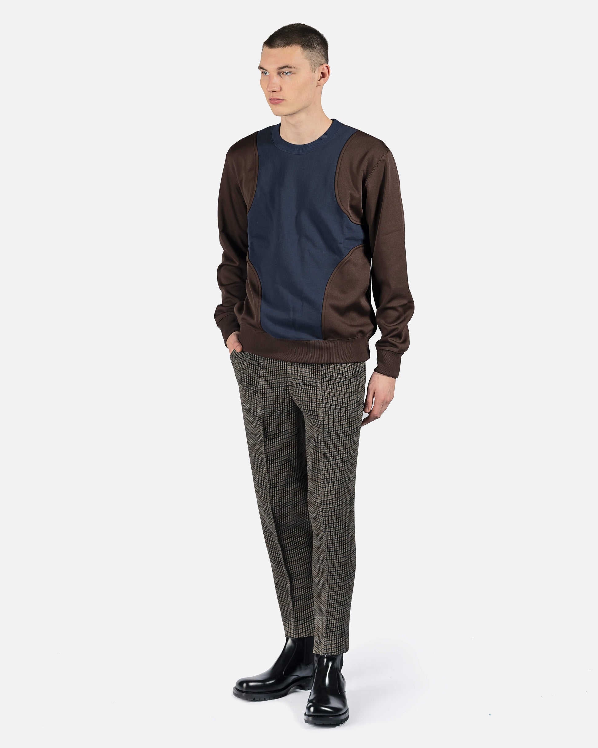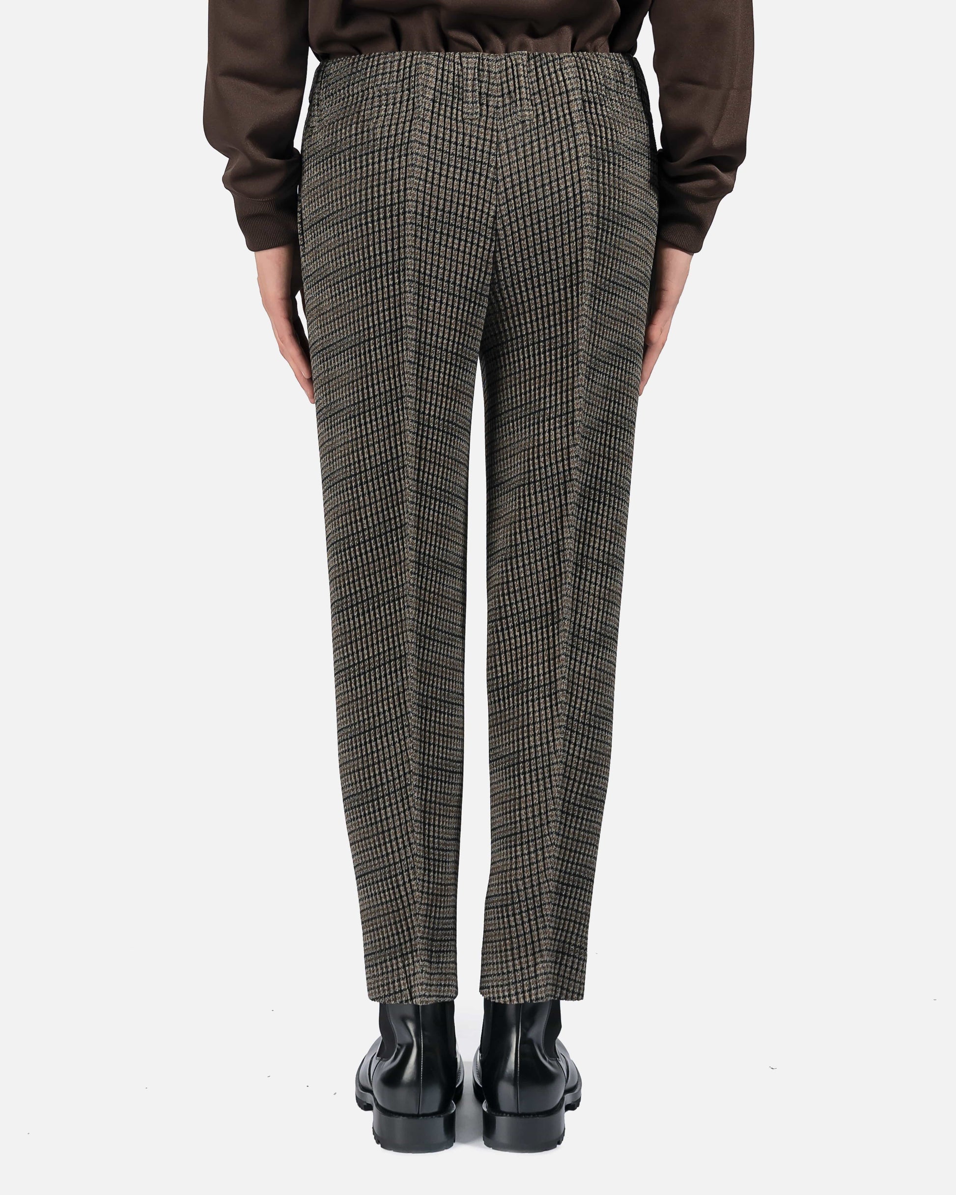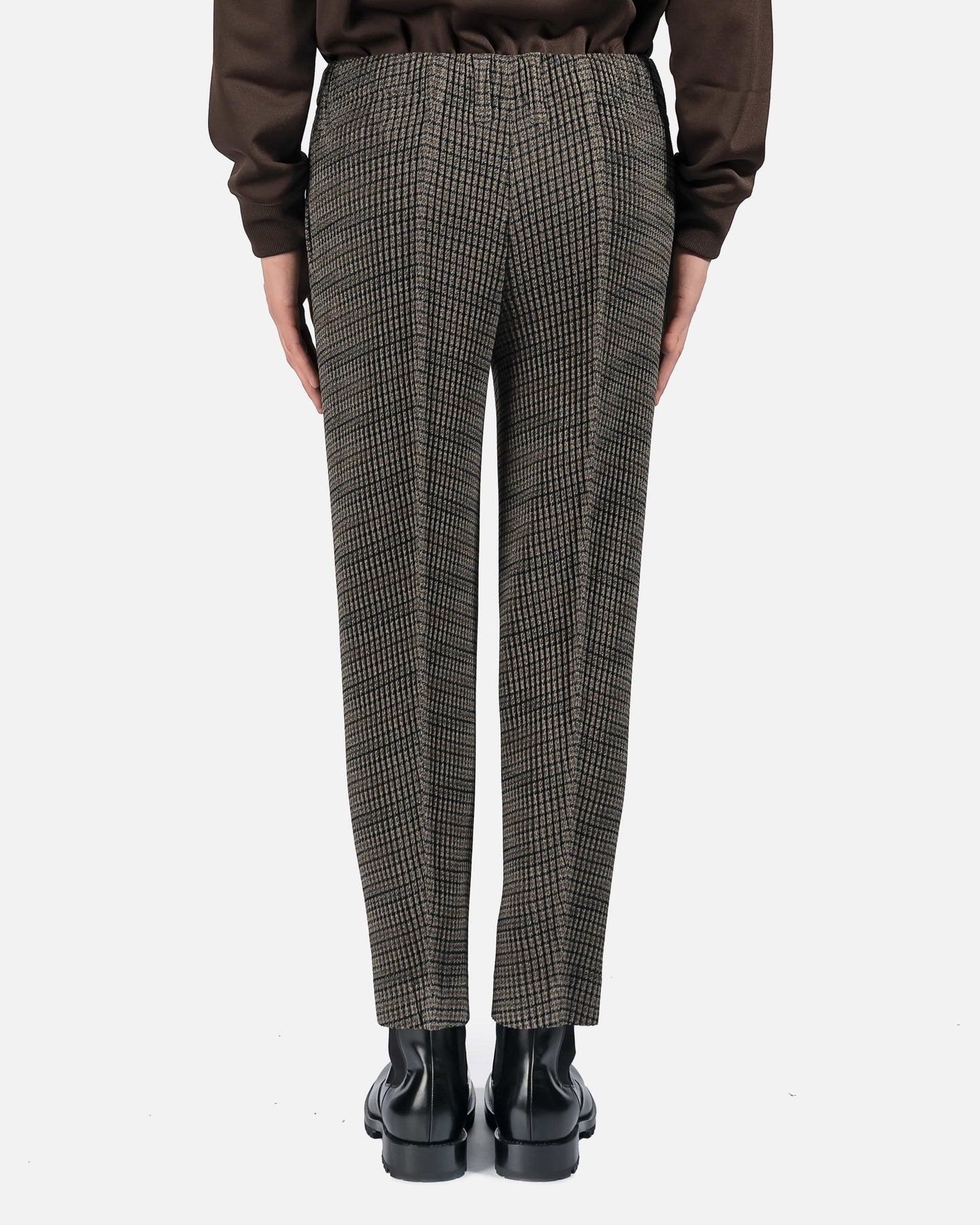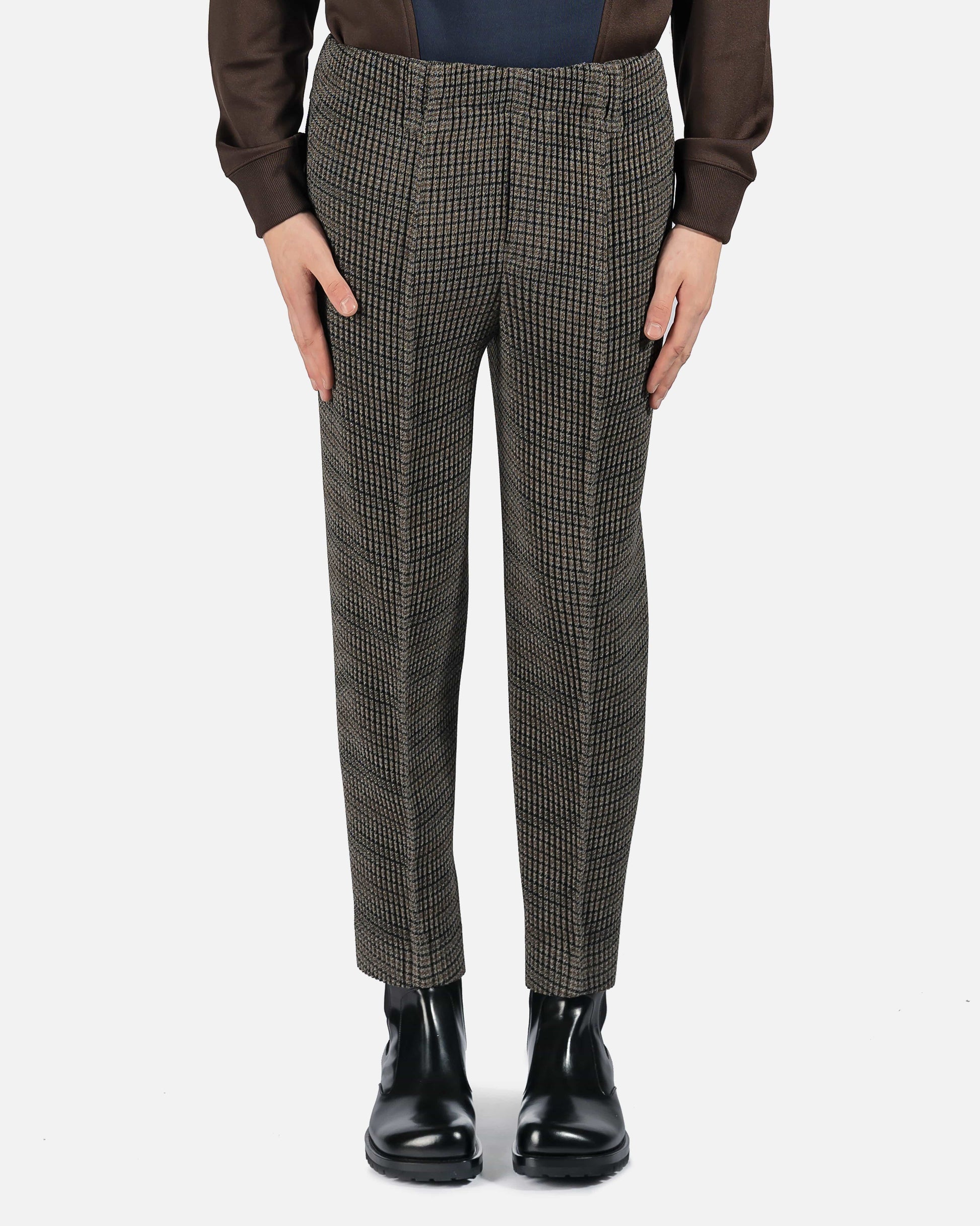 Slim-fit grommet pleated tweed trousers featuring houndstooth pattern in brown, black, and grey.