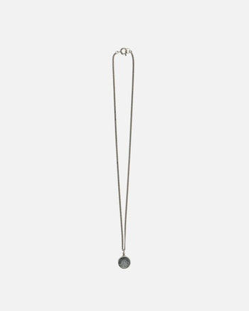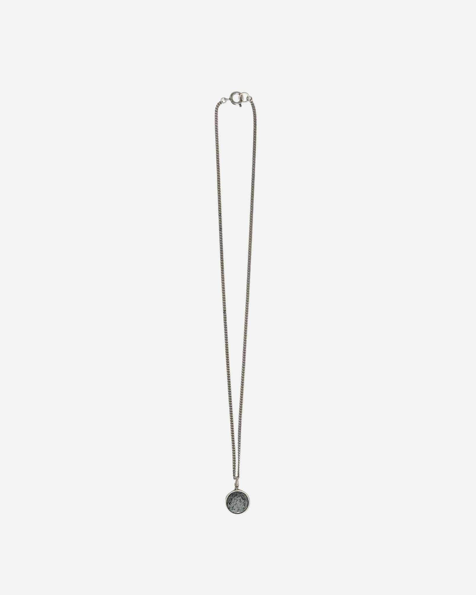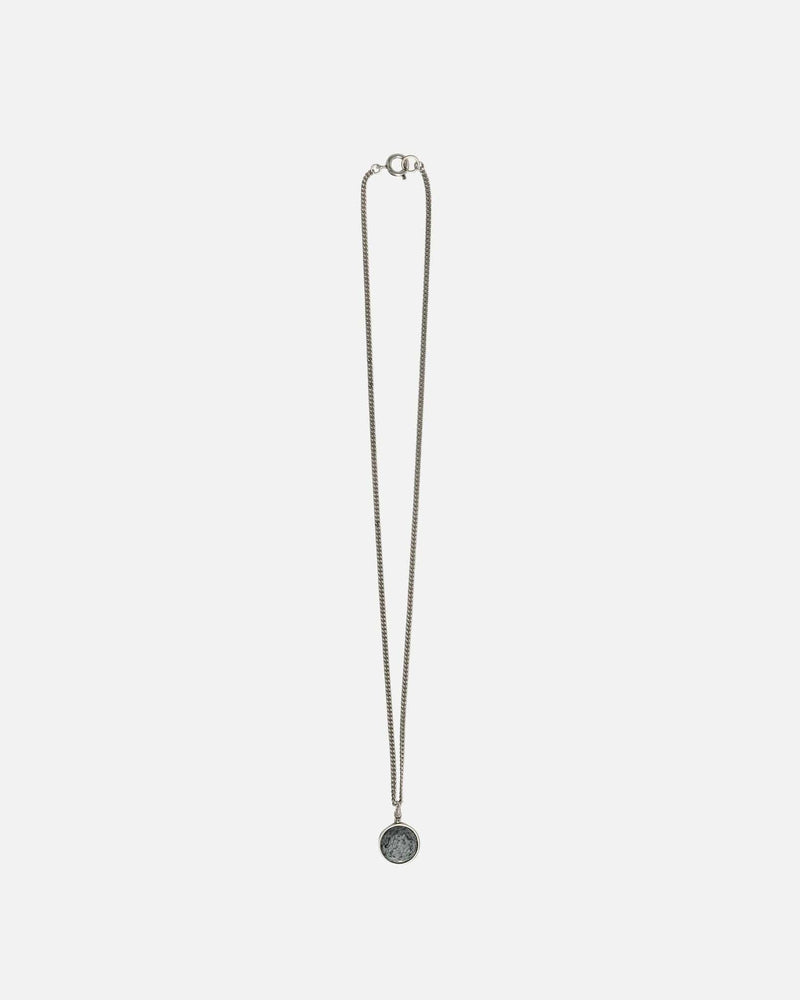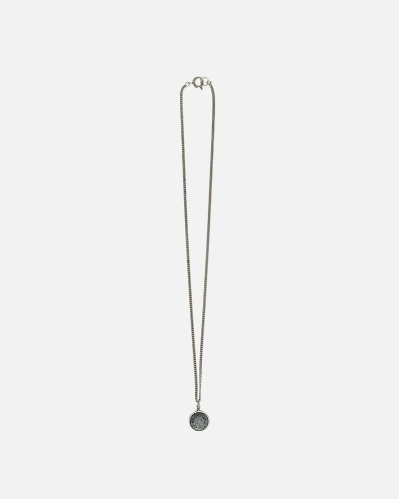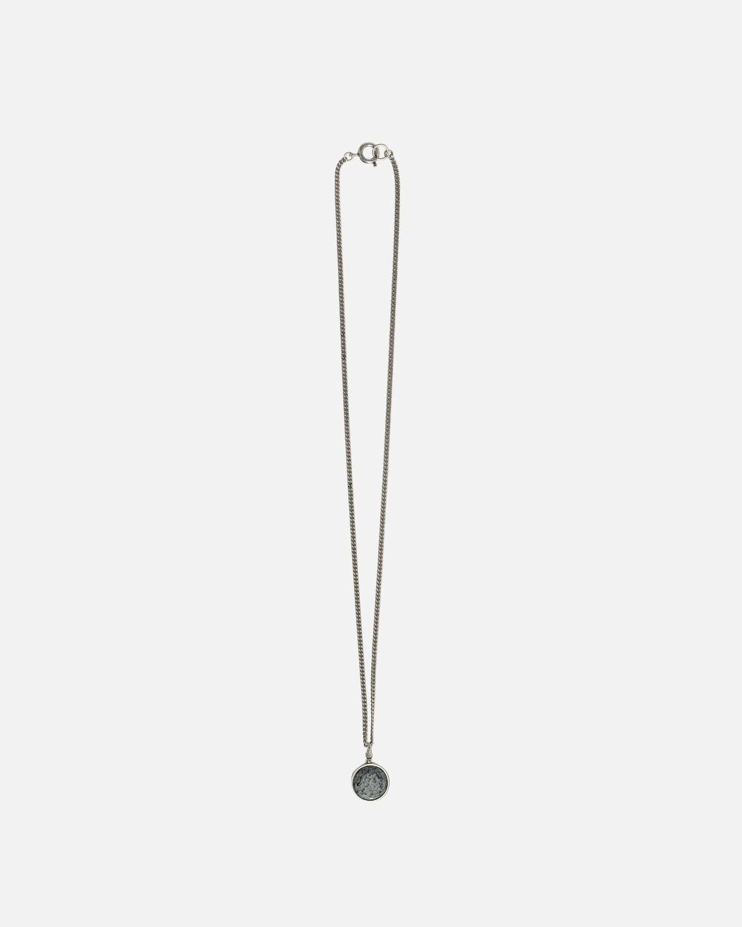 Isabel Marant Homme stone necklace in faded black. This necklace features a silver chain with clasp closure and a circular blue stone pendant.