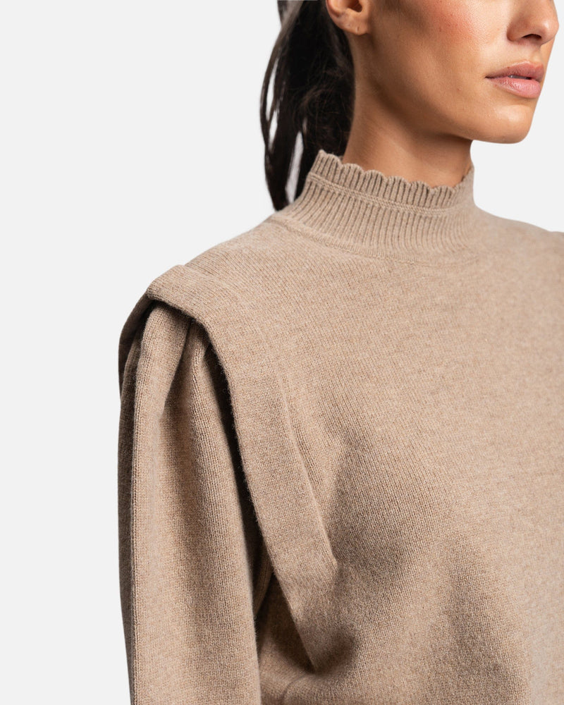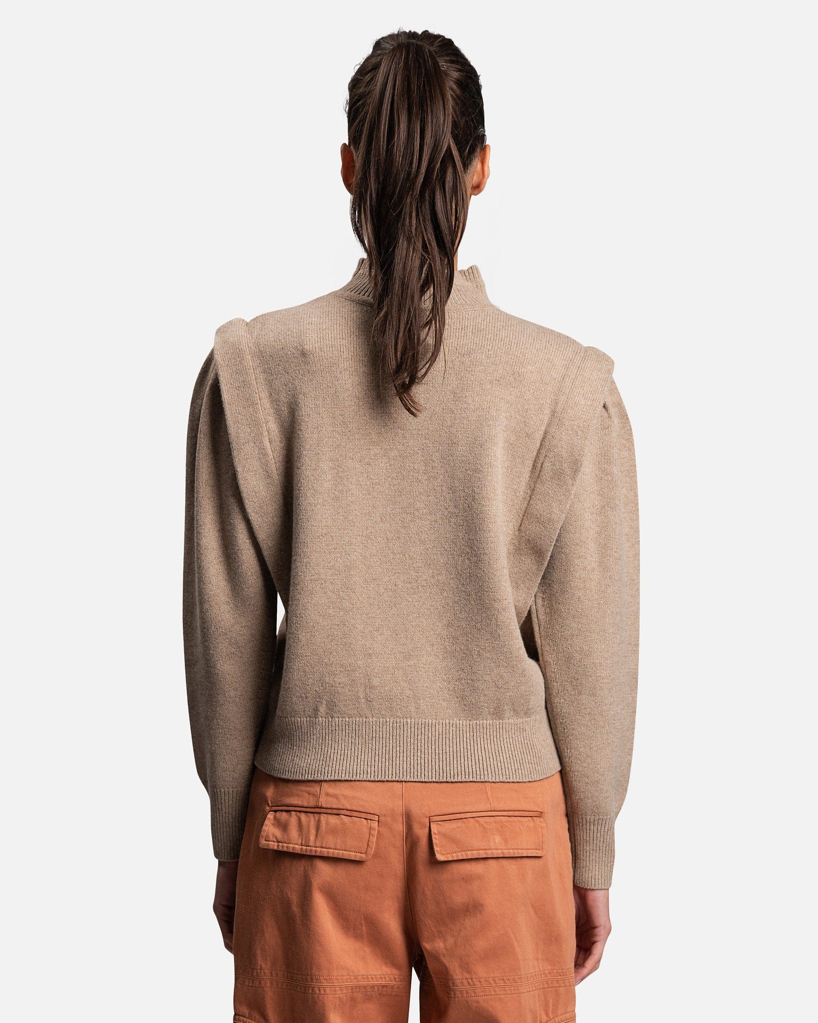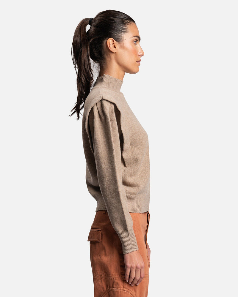 Isabel Marant Etoile Lucile Sweater in Beige. This sweater features a ruffle neck design with a layered sculptural shoulder.