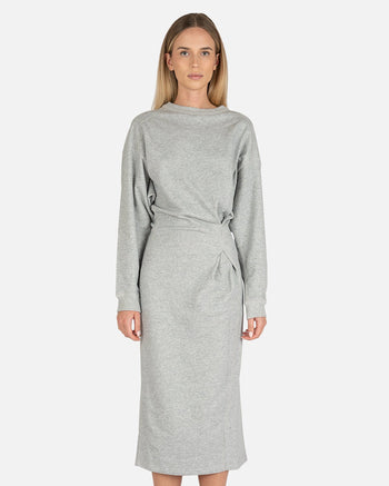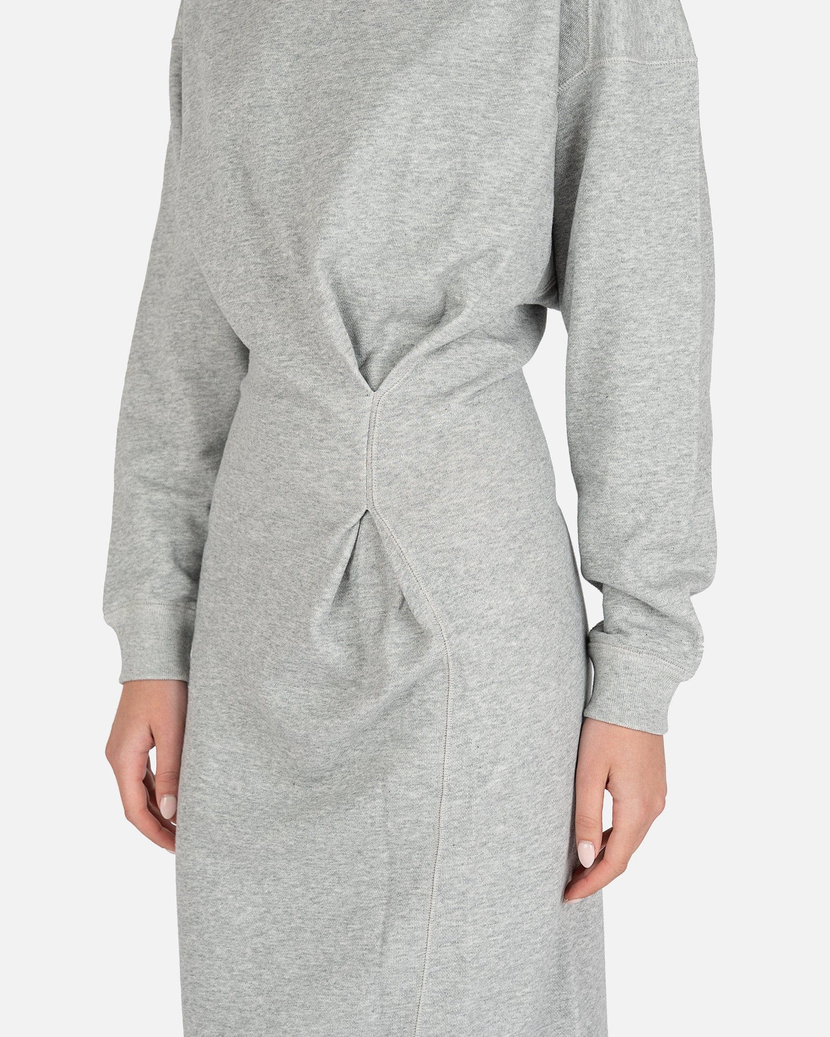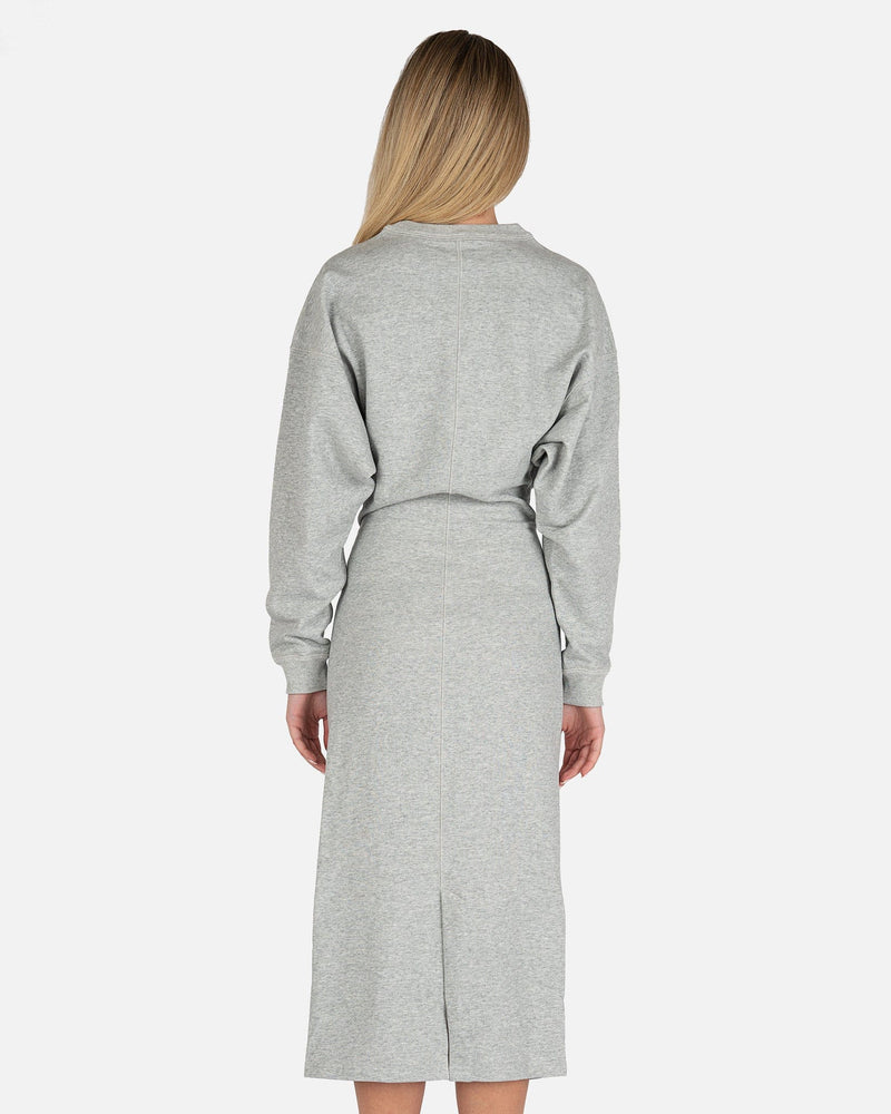 Isabel Marant Etoile women's sweater dress in grey. This comfortable midi dress features a crew neckline and dropped shoulders. There is cinched detailing at the waist.