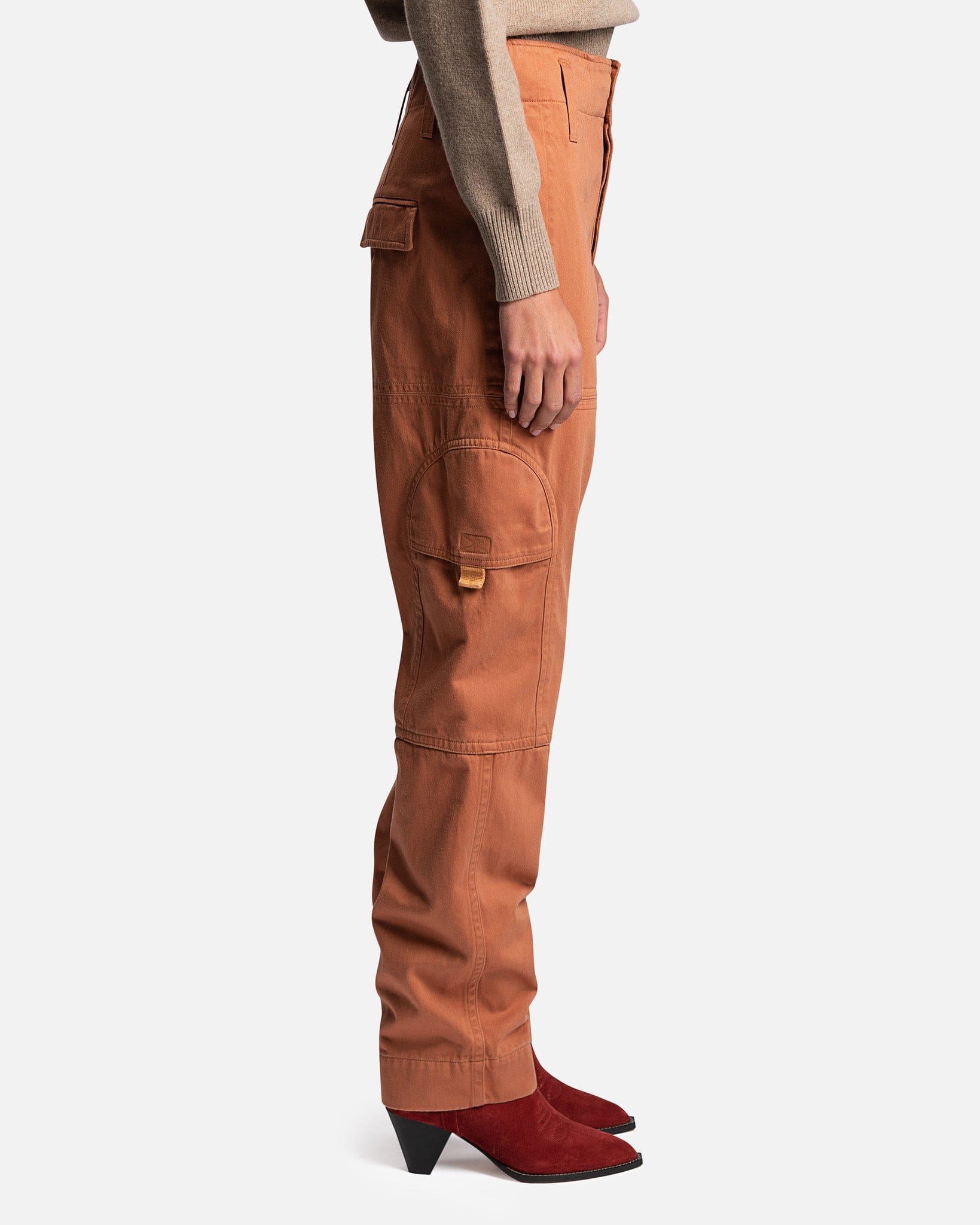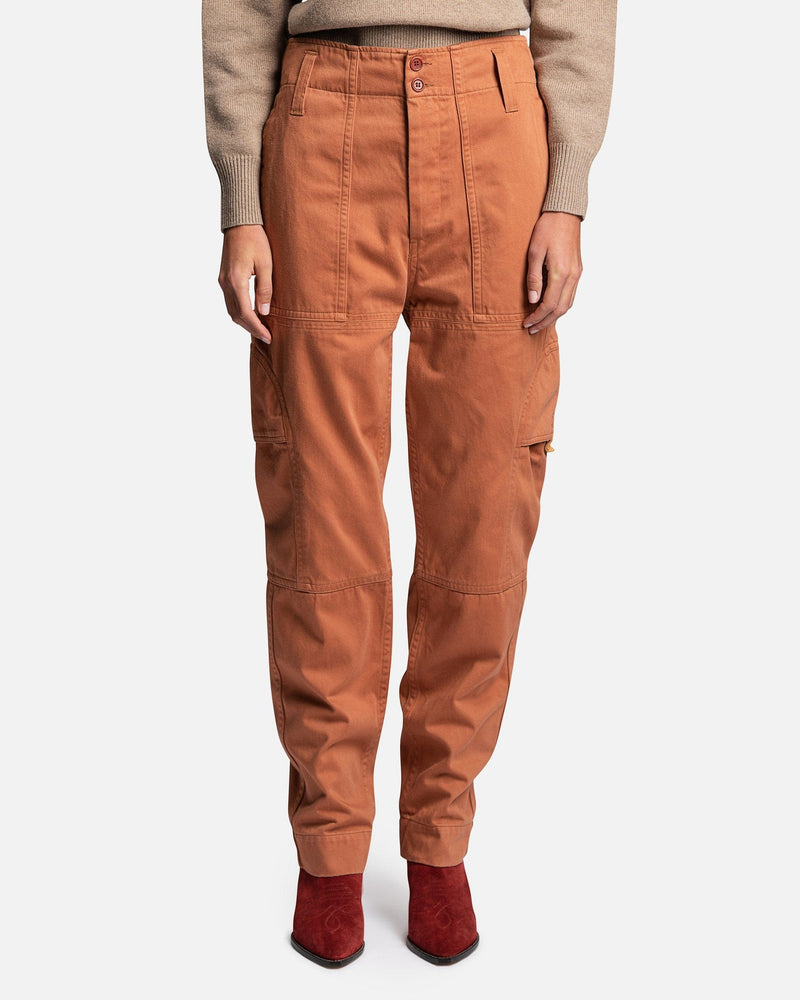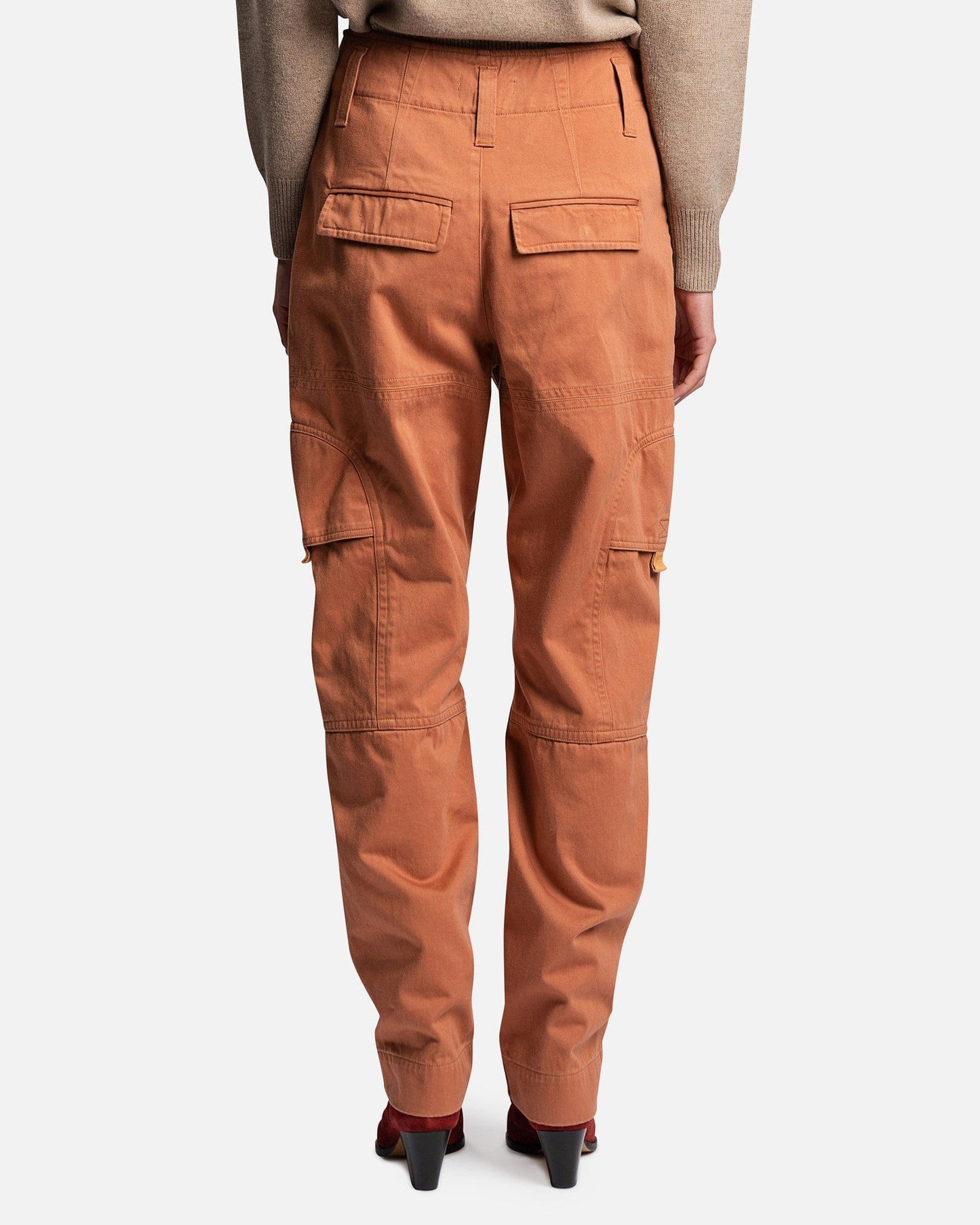 Isabel Marant women's cargo pants in orange. These pants feature a high waist with a tapered cargo silhouette.