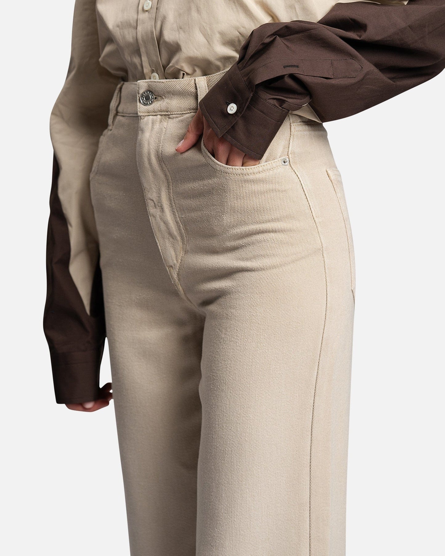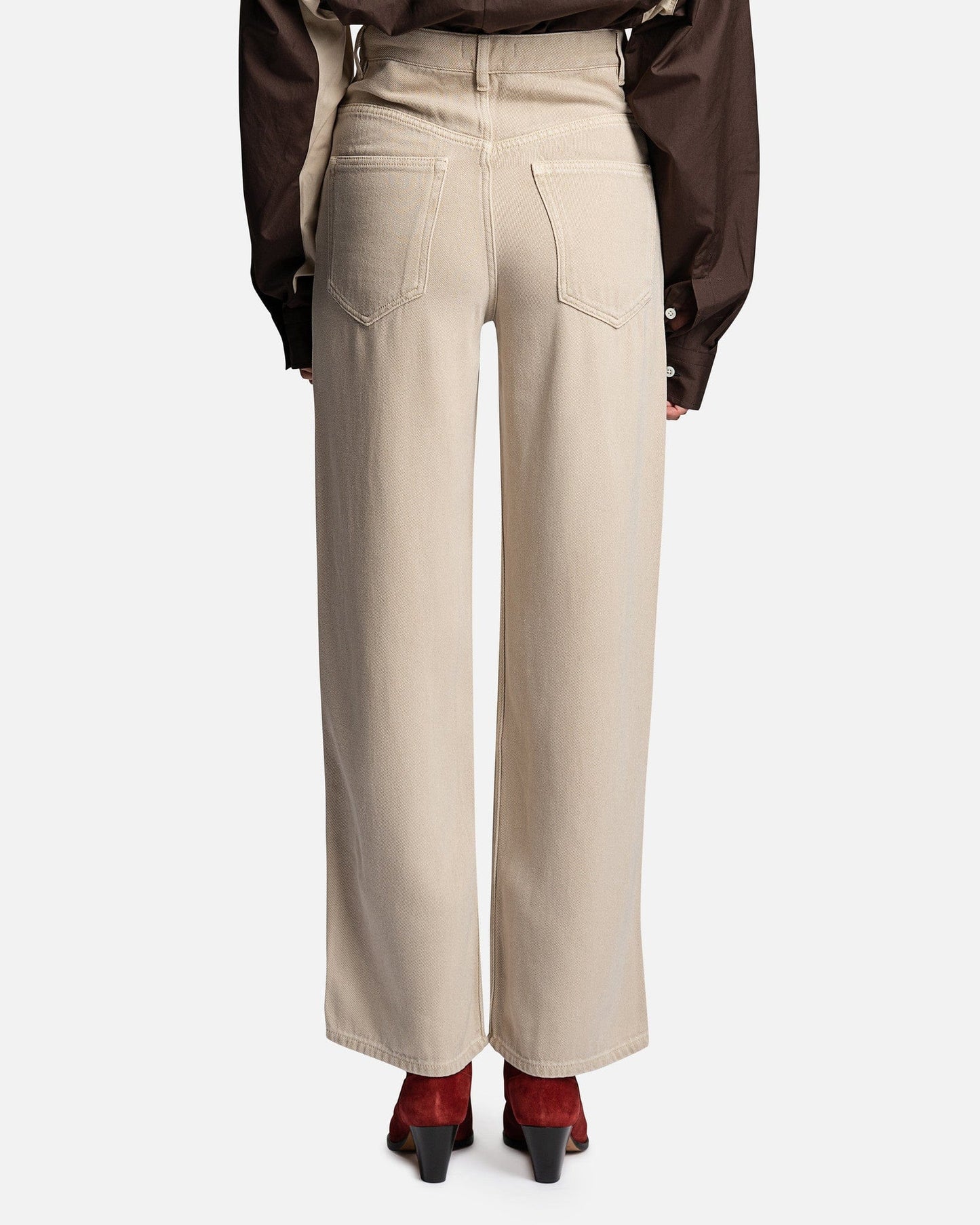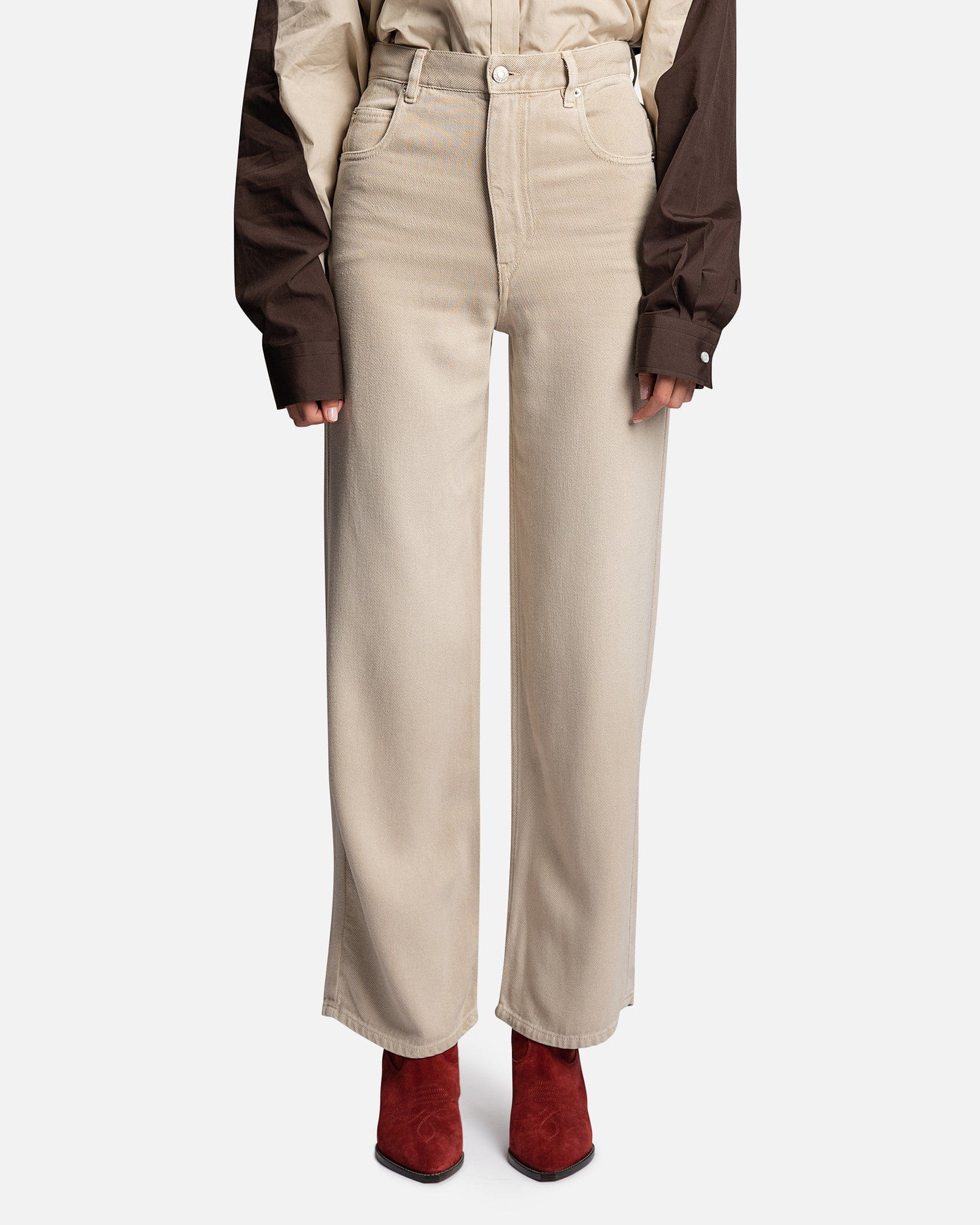 Isabel Marant Etoile high waisted denim pants in ecru. These pants follow the five pocket composition and have a wide leg silhouette. They have a soft feel and are meant to be worn baggy.