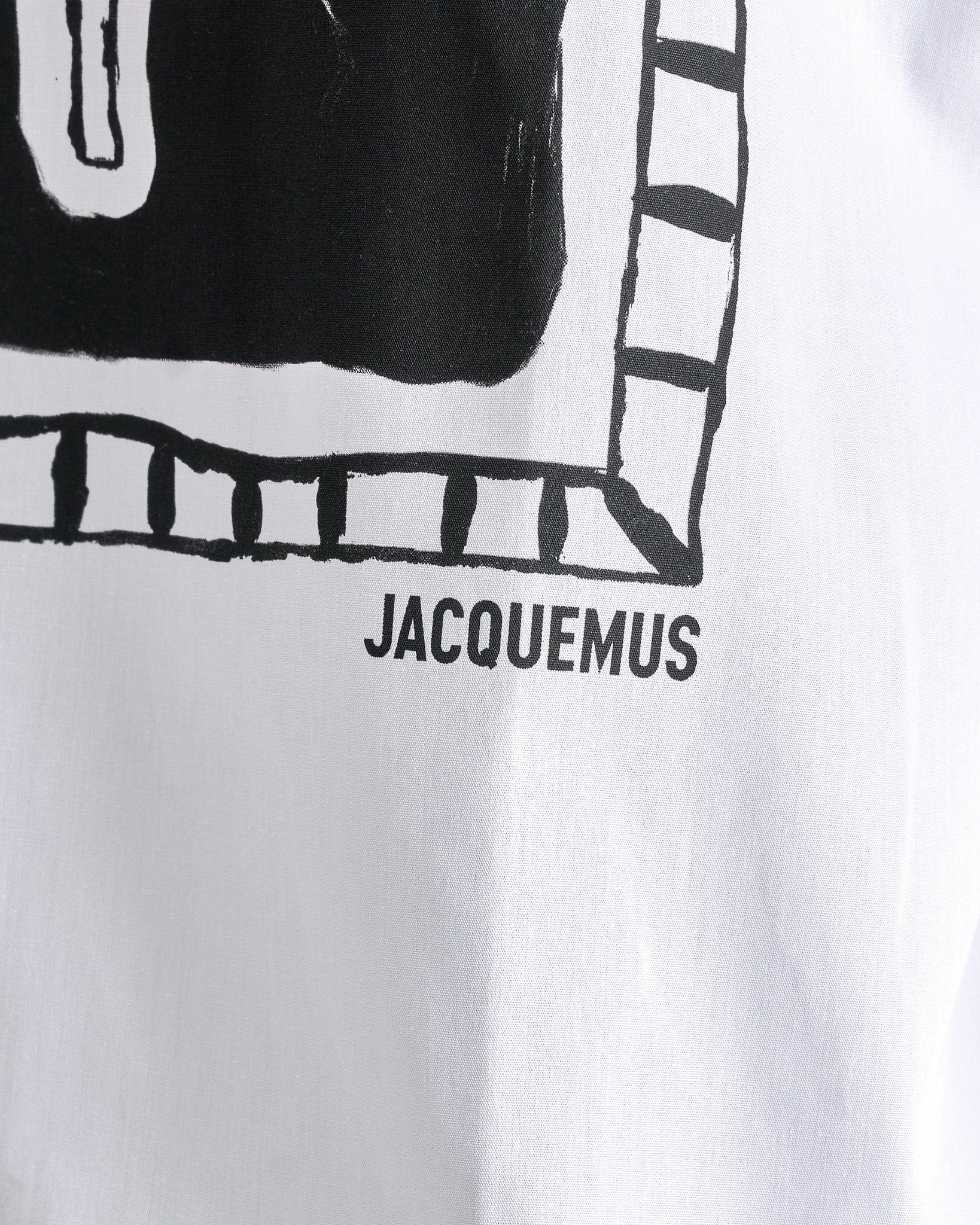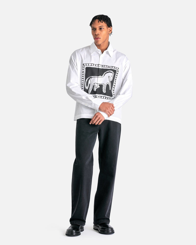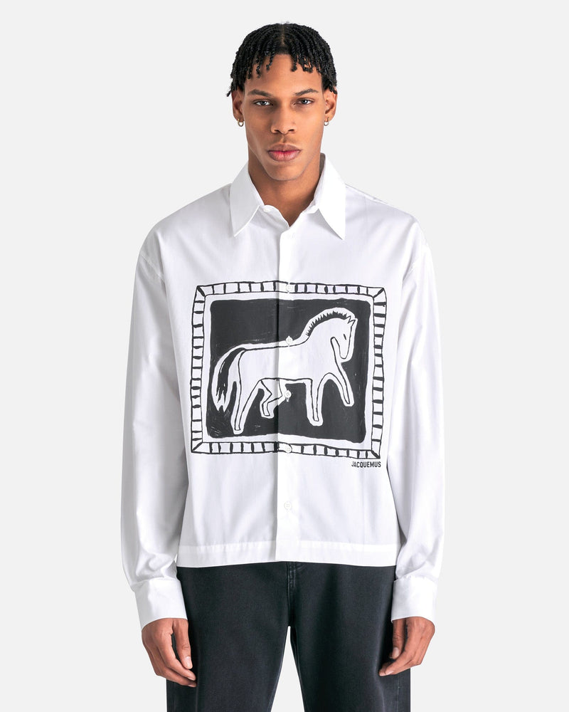 Jacquemus La Chemise Papier in Print Black & White Horse. This shirt features a monochrome print horse on the front, front button closure, a classic collar, square button cuffs and a straight hem.