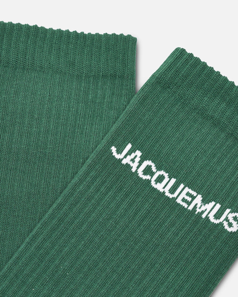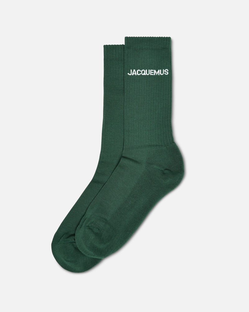 Jacquemus Les Chaussettes Jacquemus in Dark Green. These socks feature a mid calf fit, organic stretch cotton and a contrasting logo at the rib-knit cuffs.