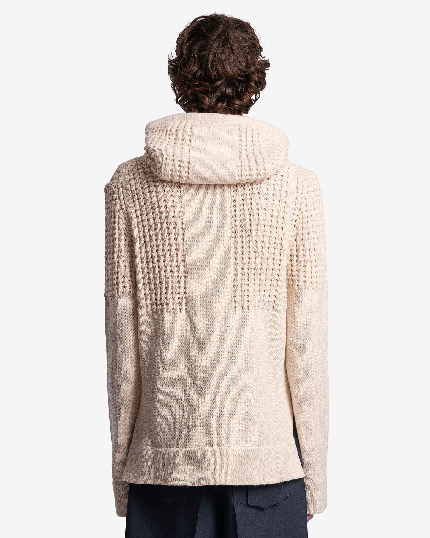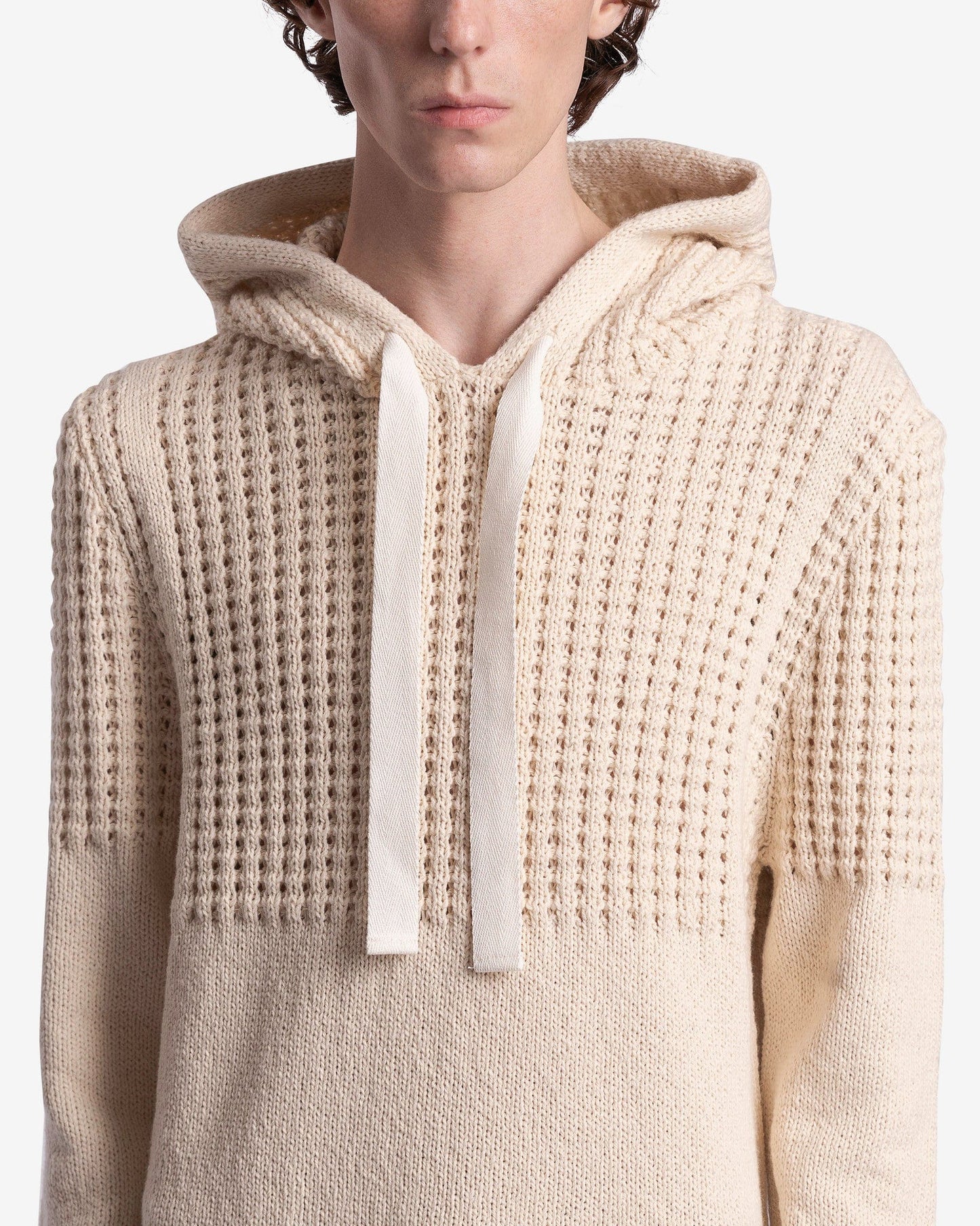 Jil Sander men's chunky knit hoodie in natural. This hoodie features drawstrings at the neckline and a waffle knit texture along the top half.