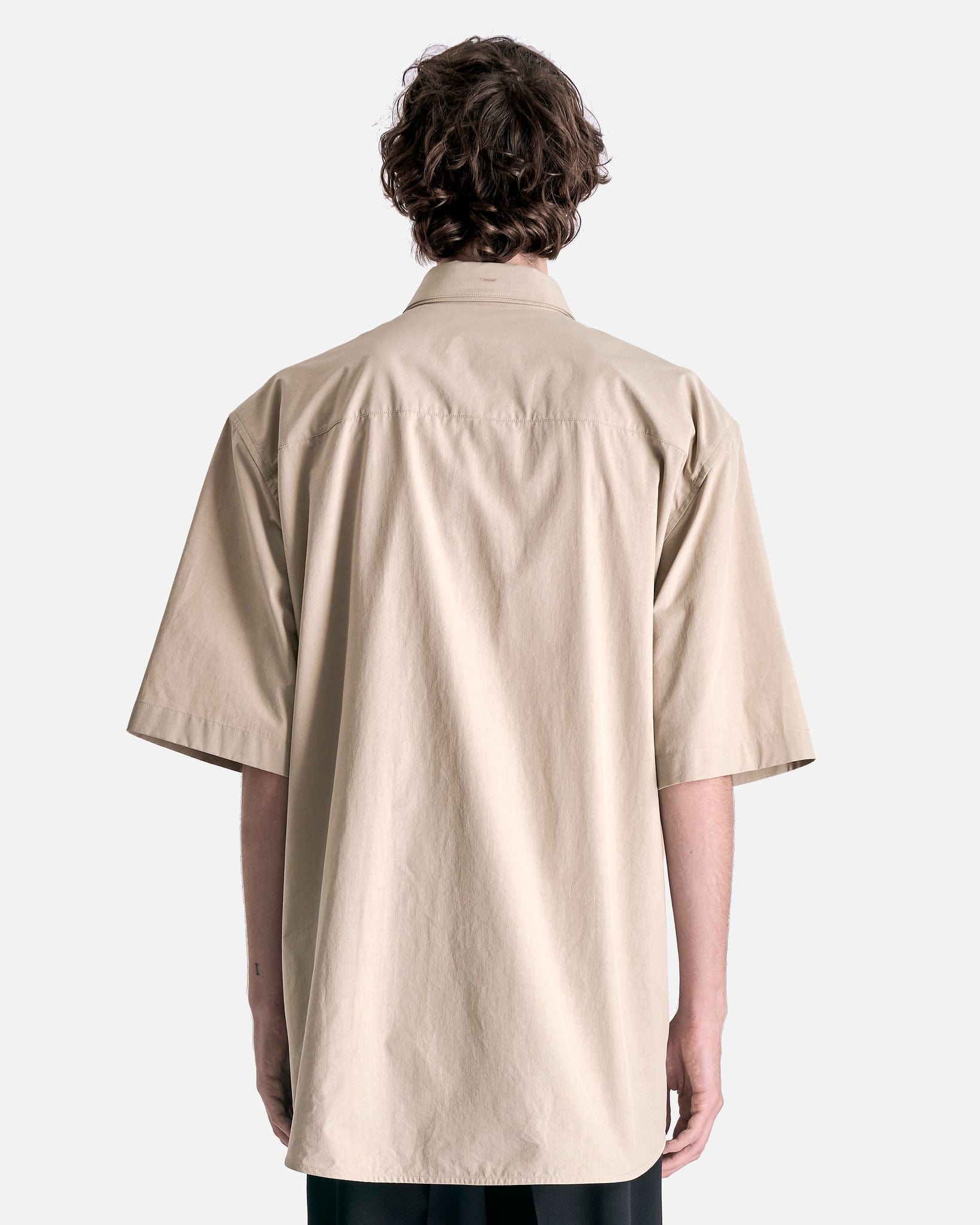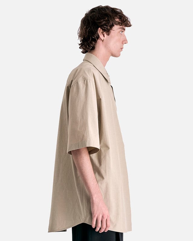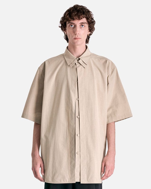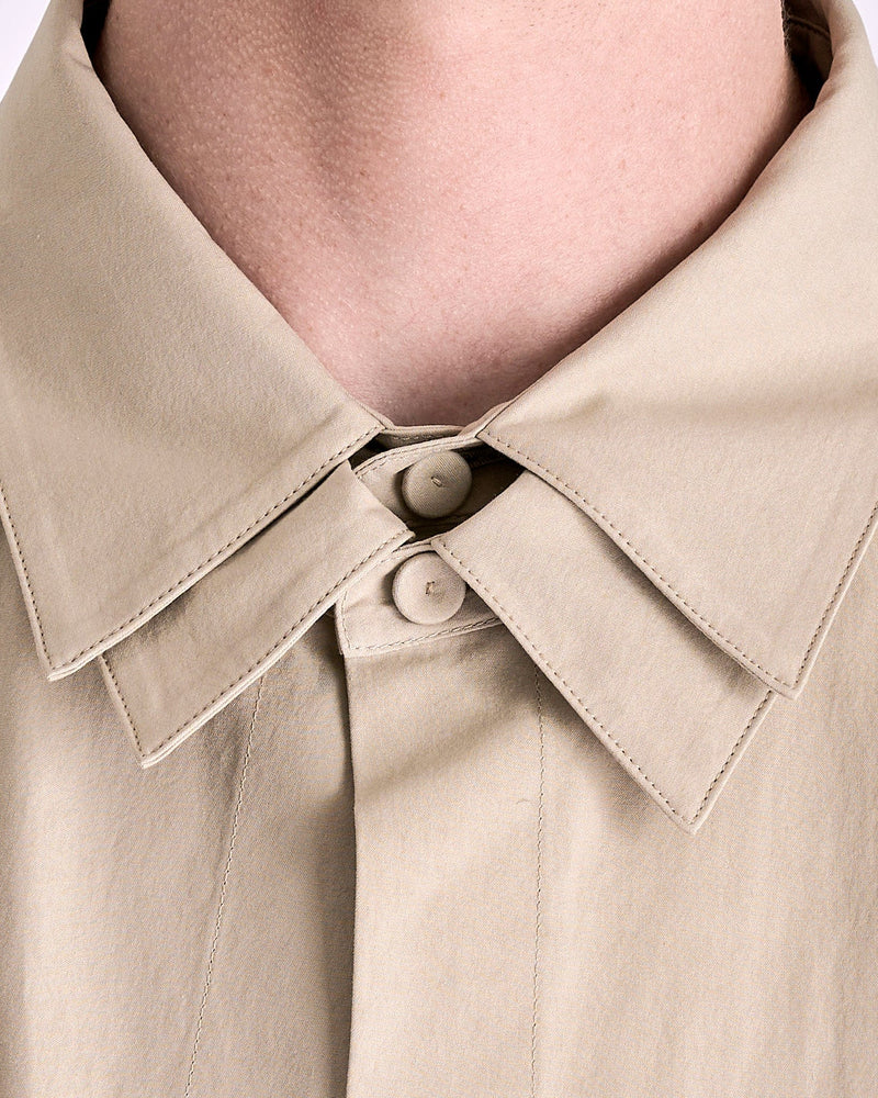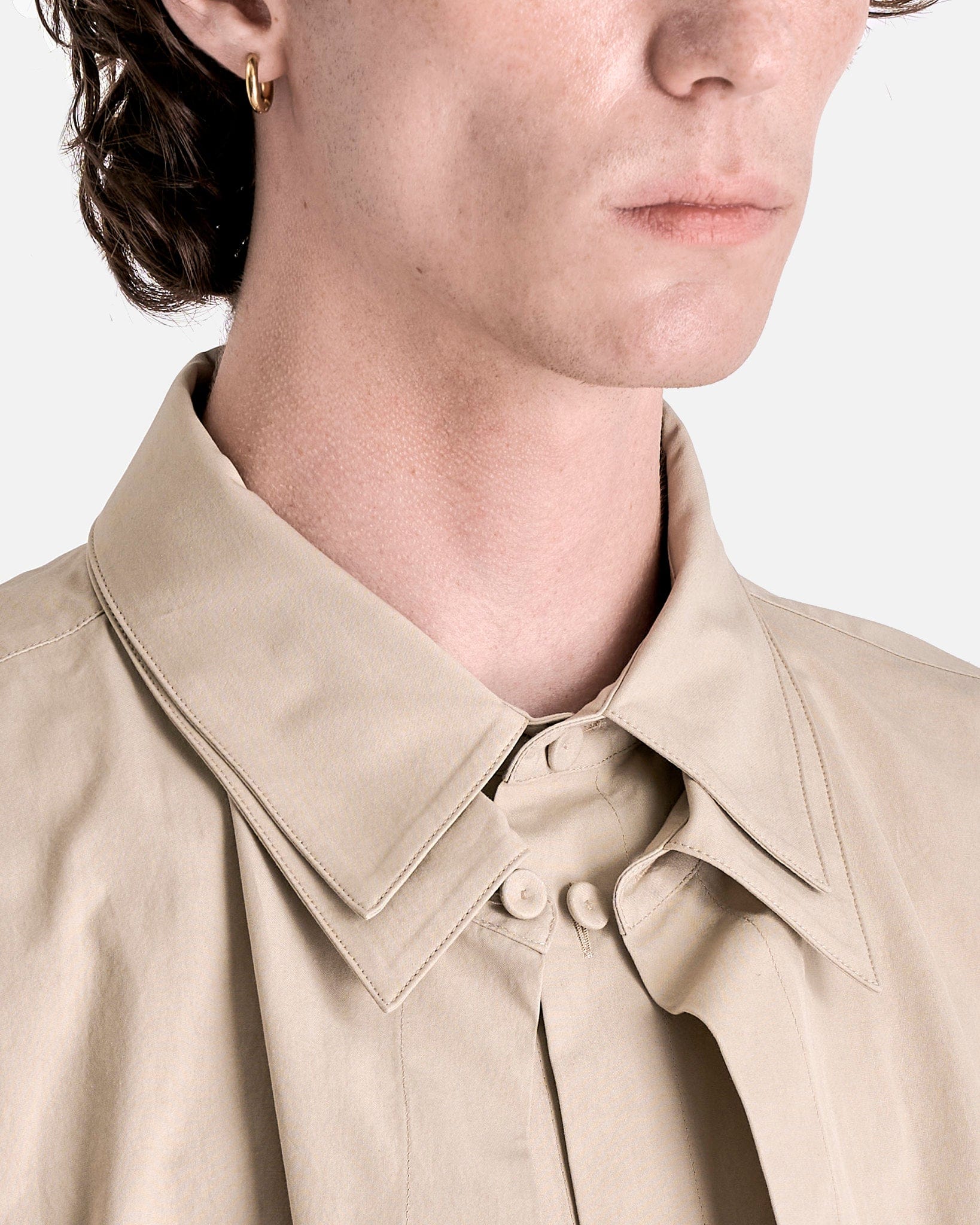 Jil Sander Double Layer Cotton Poplin Shirt in Powder Green. This shirt features a unique double collar and a double front layer while the shirt cuffs rest below the elbow. The shirt has a back yoke, dropped shoulder seams and a logo engraved jeweled clasp to be attached at the back of the collar.