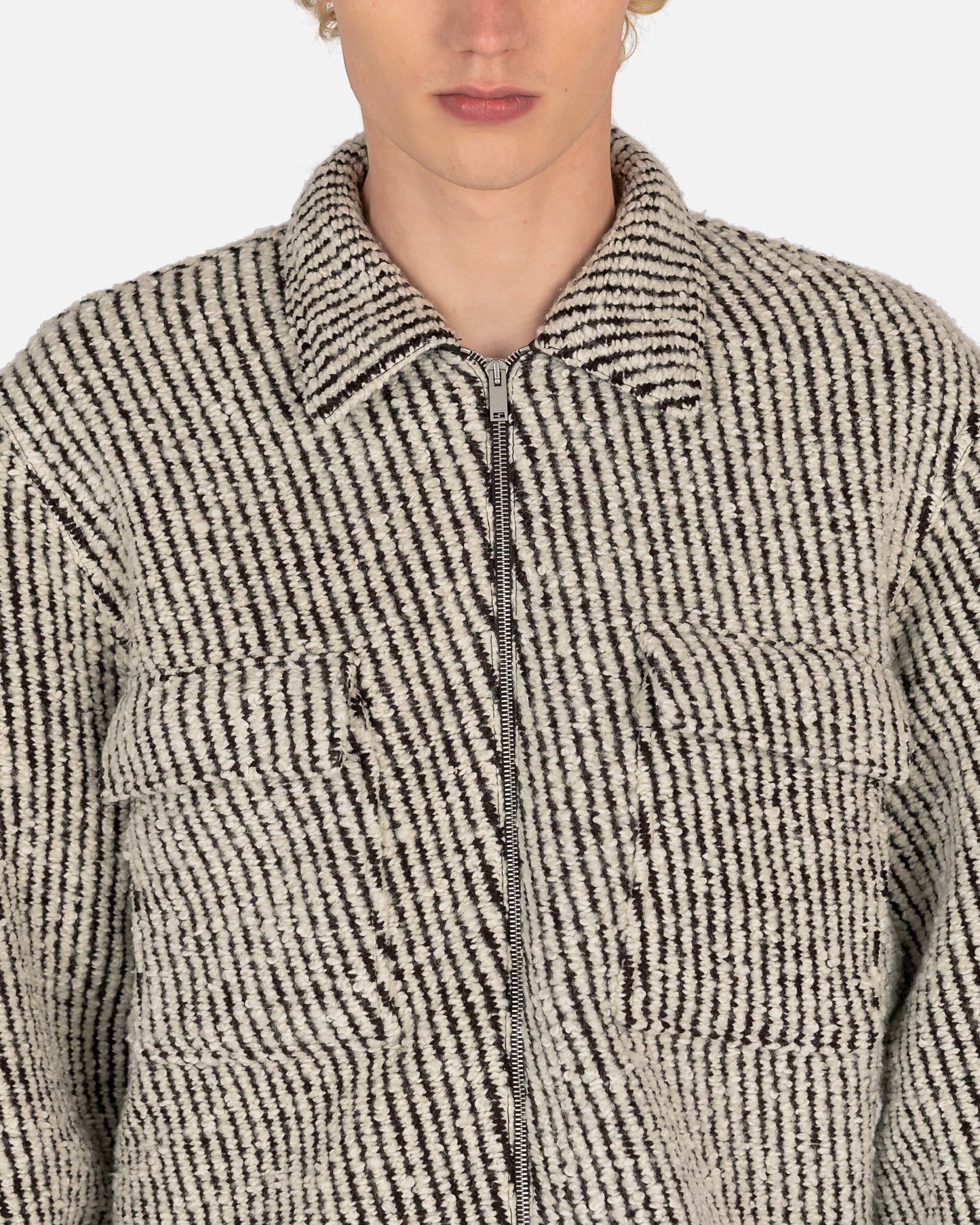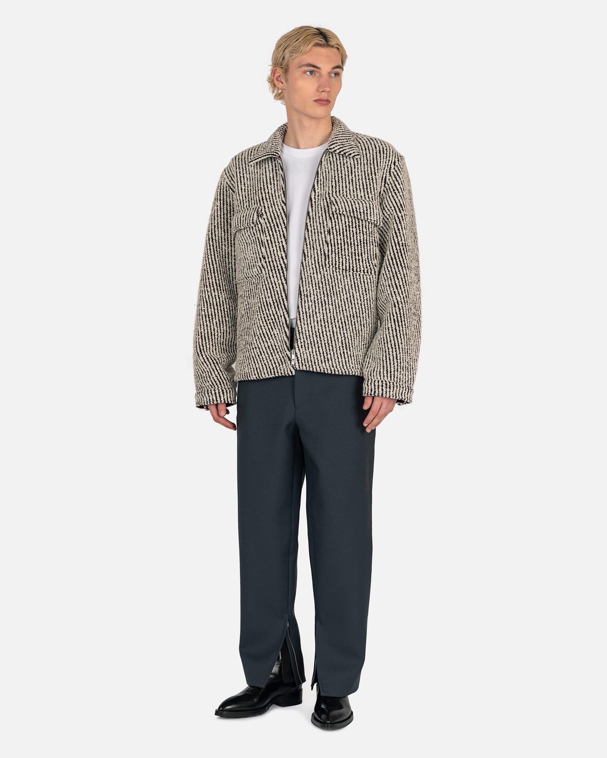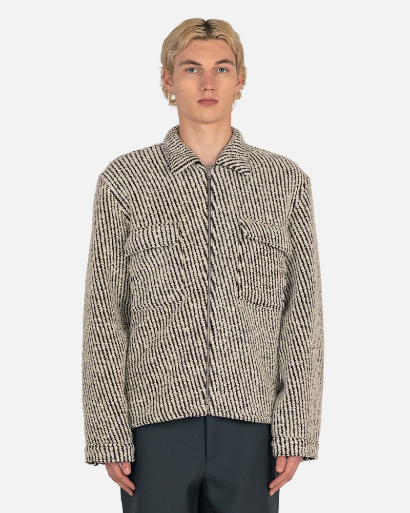 Jil Sander men's zip up jacket in off-white. This jacket features a spread collar and front zip closure with flap pockets on the chest.