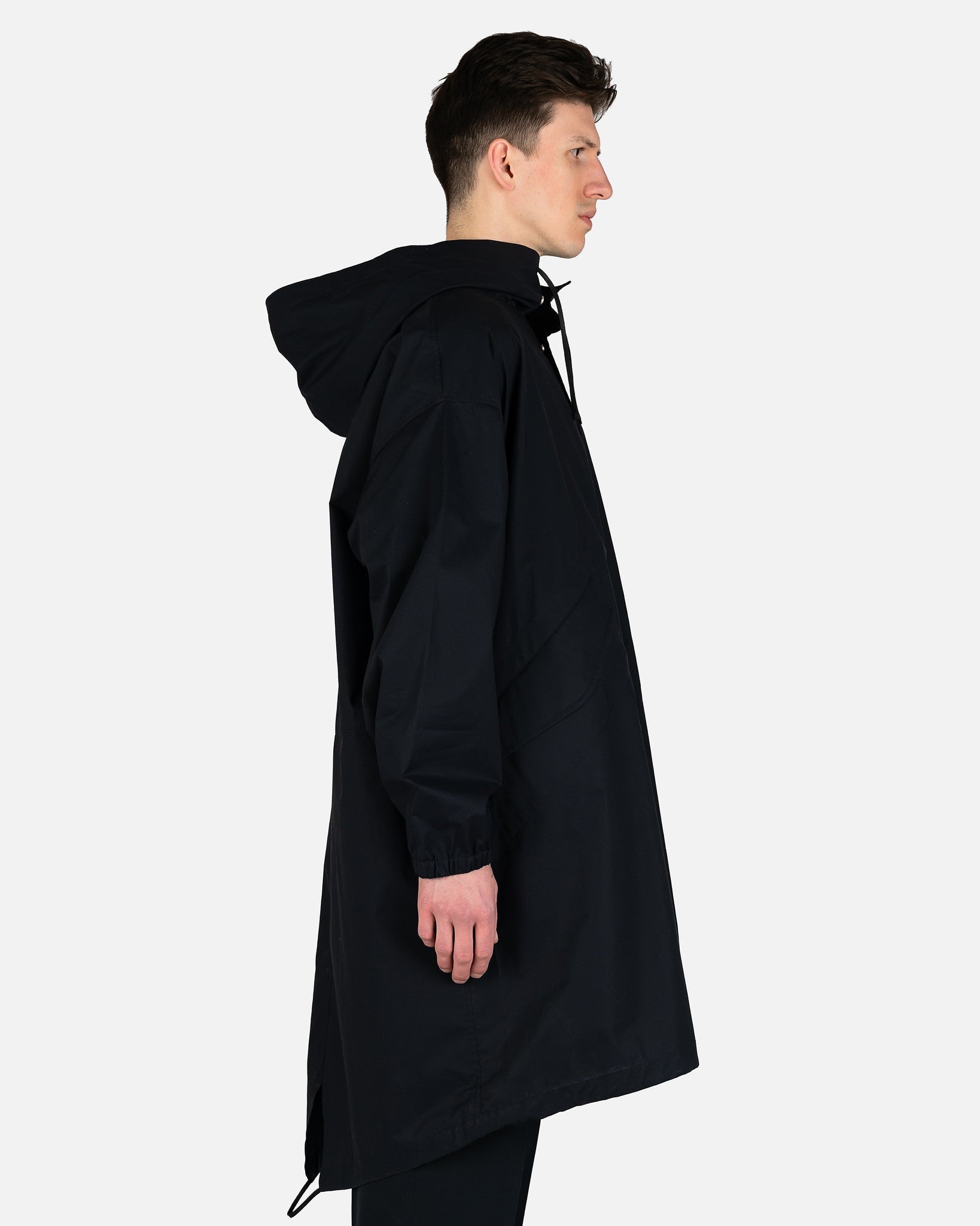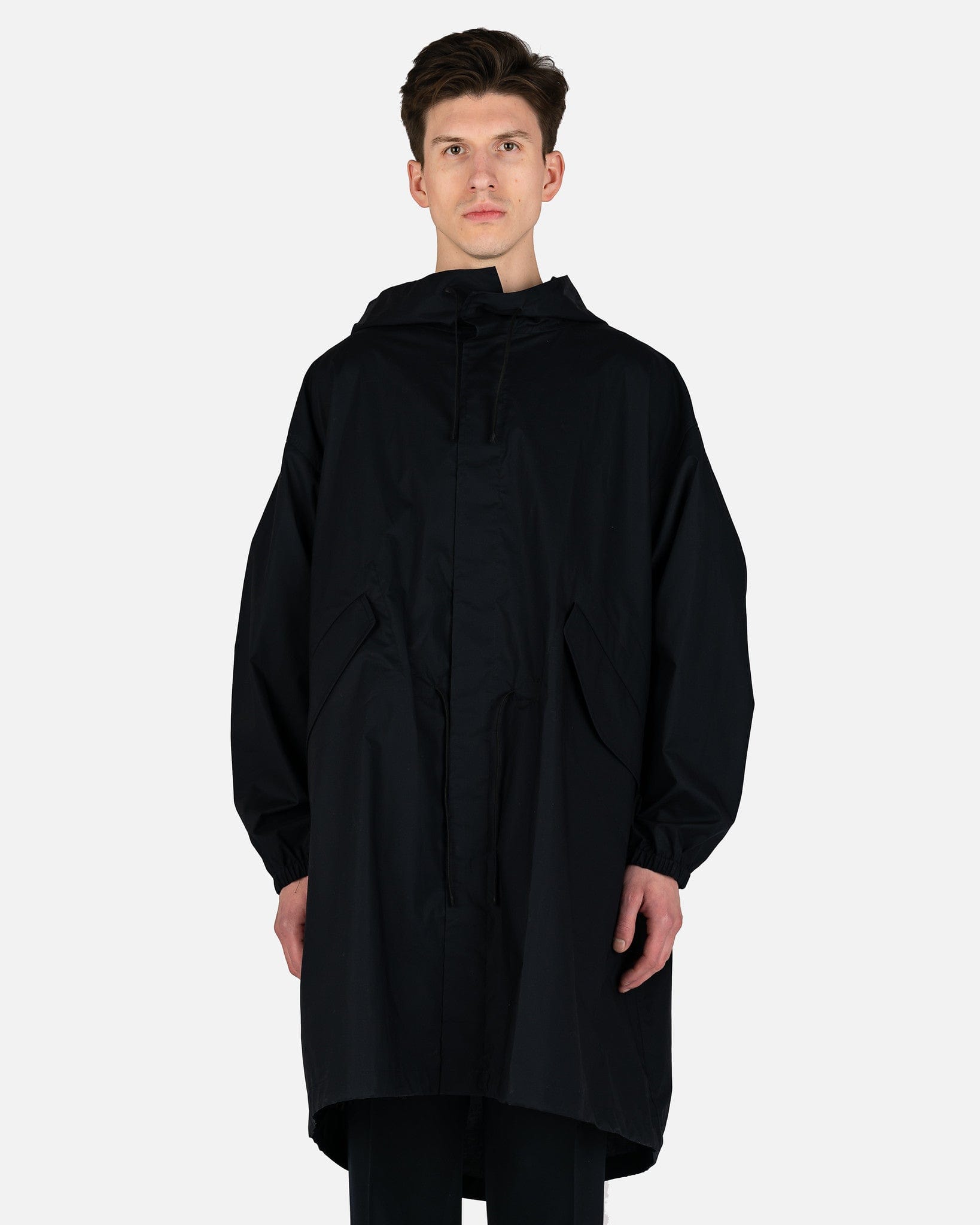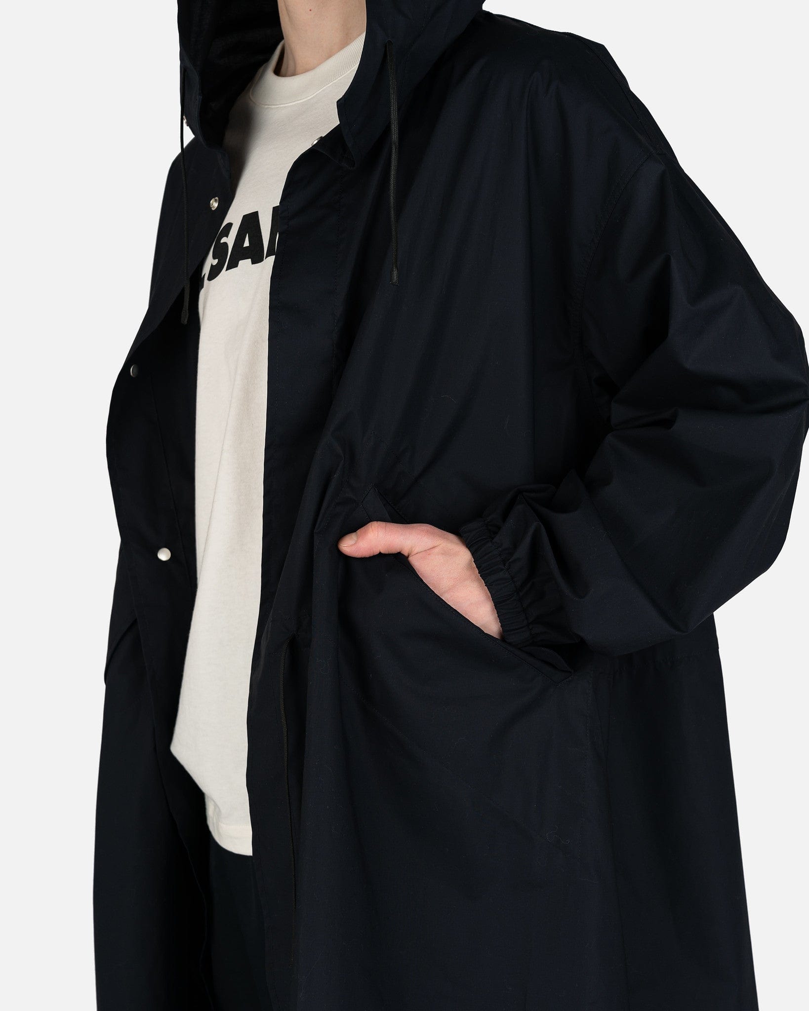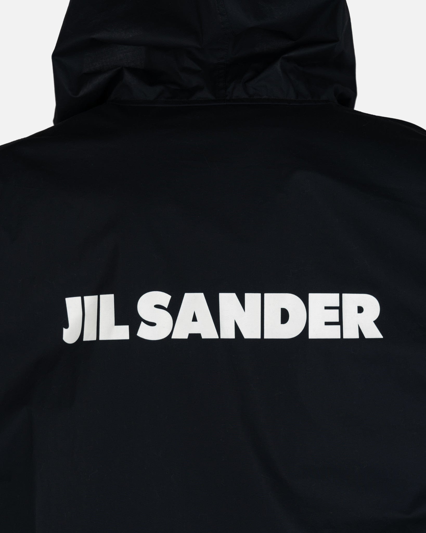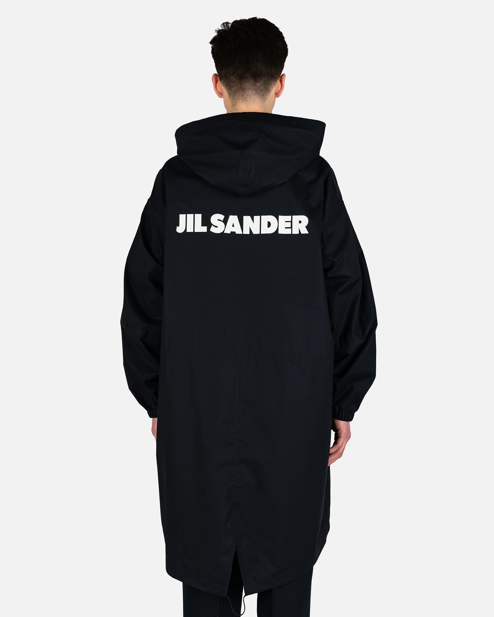 Jil Sander men's water repellent jacket in navy blue. This jacket has a logo print to the rear and a classic hood. The parka utilizes front snap button and zip closure, with two side flap pockets and a drawstring fastening waist.