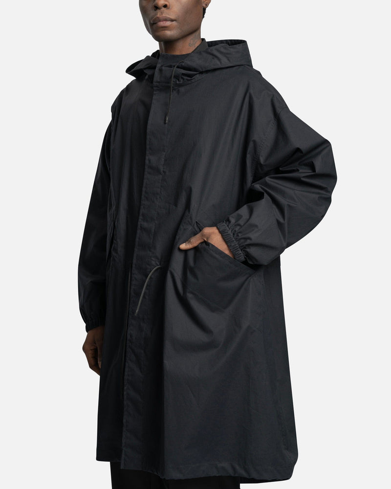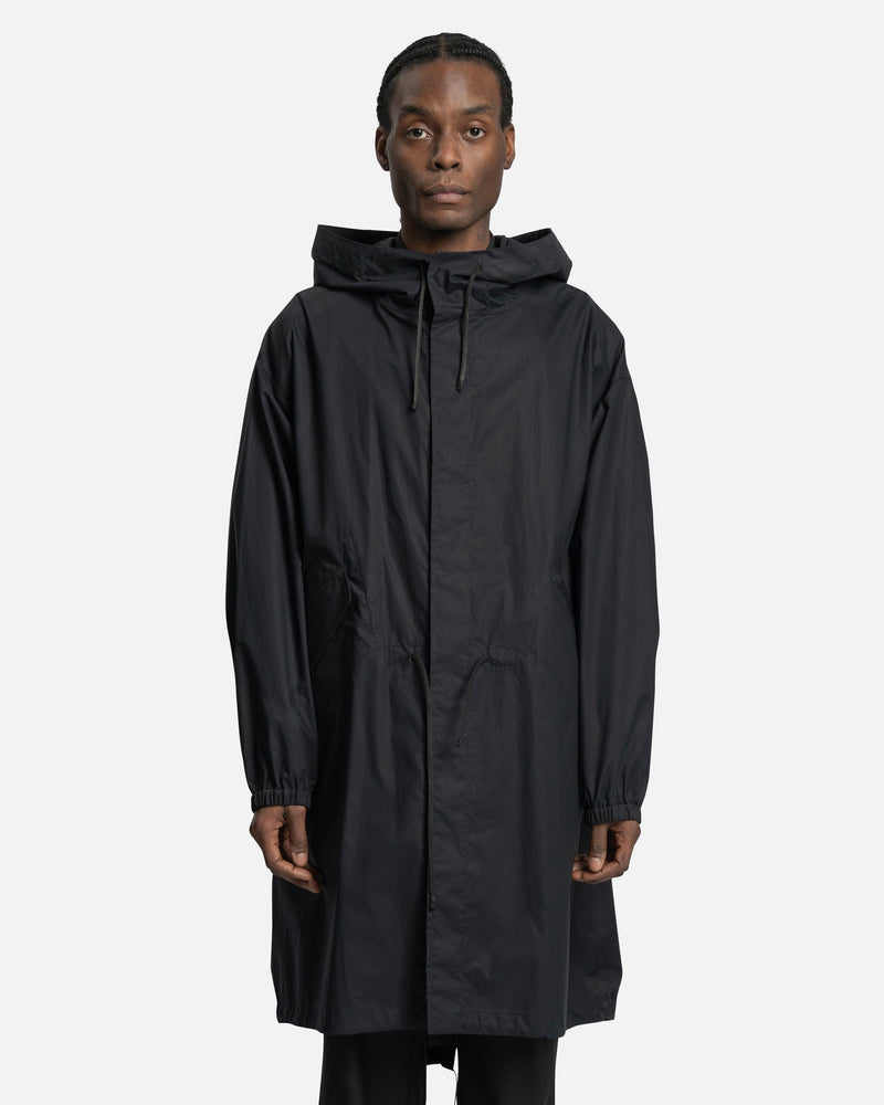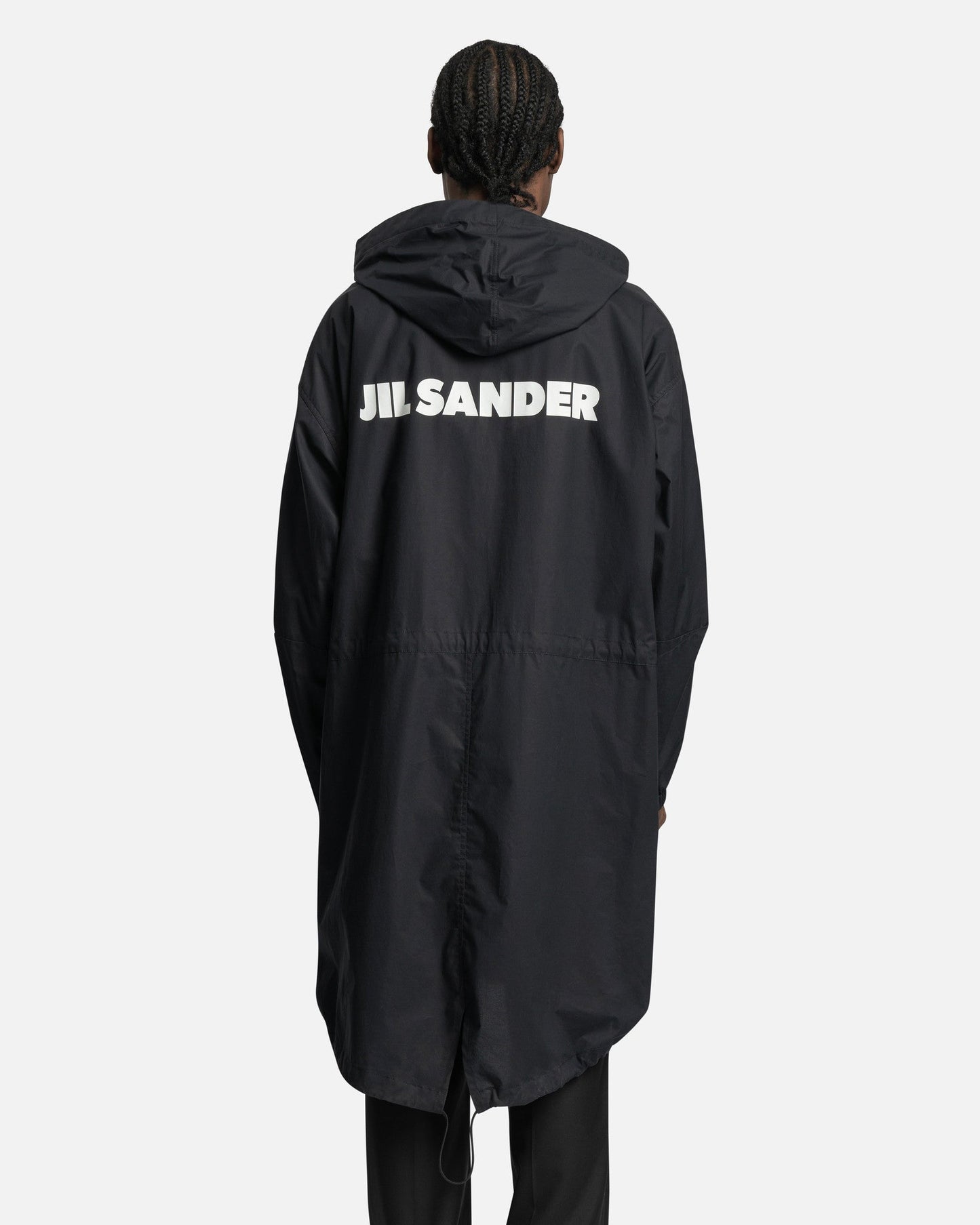Jil Sander men's water repellent jacket in navy blue. This jacket has a logo print to the rear and a classic hood. The jacket utilizes front snap button and zip closure, with two side flap pockets and a drawstring fastening waist.