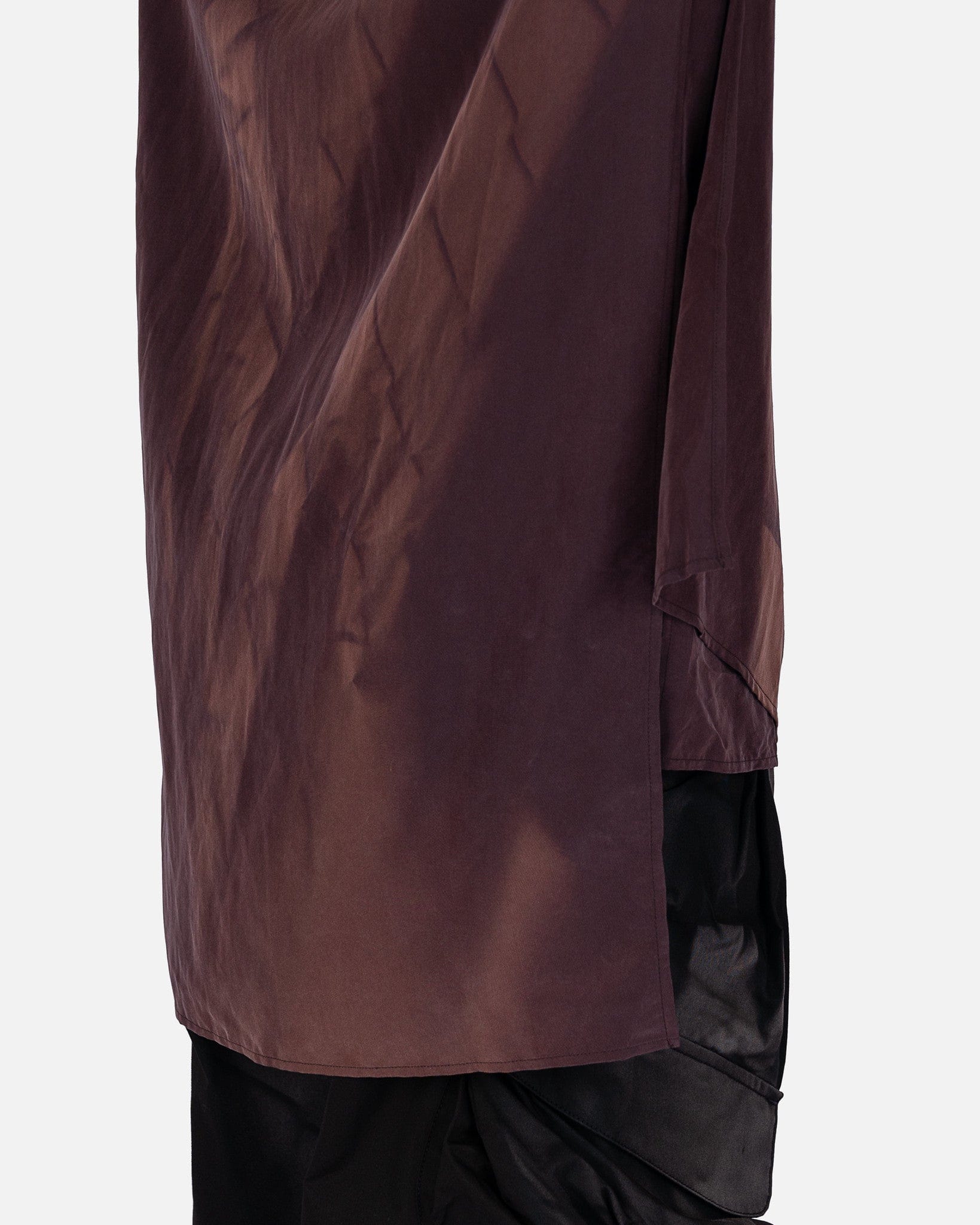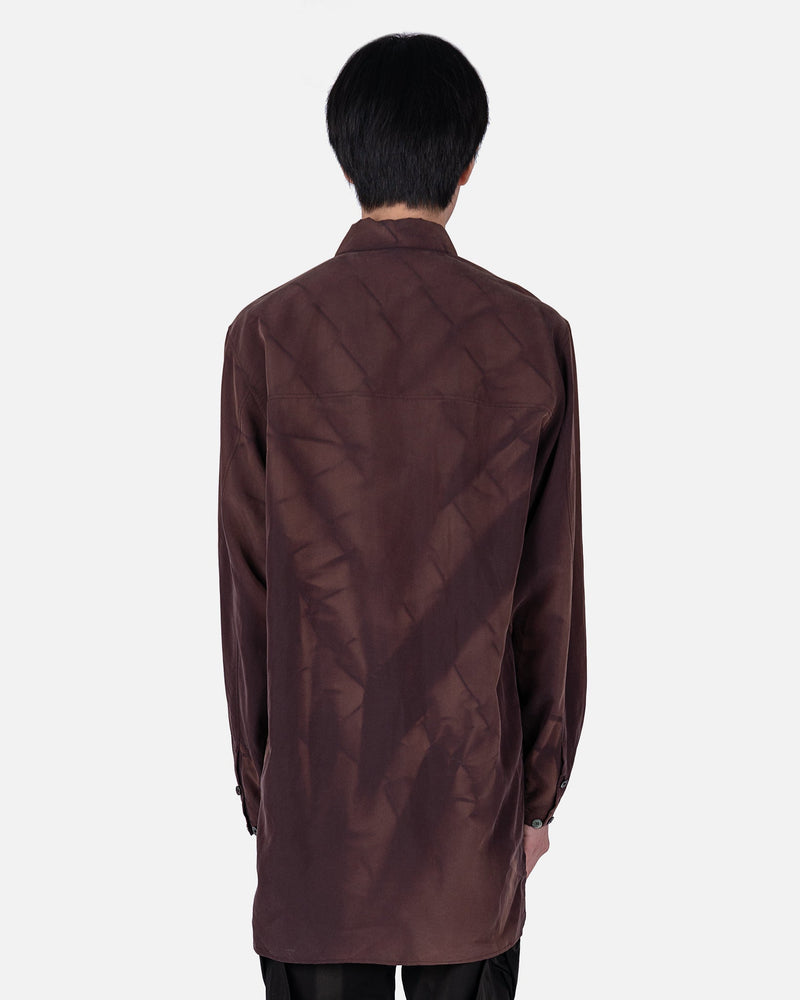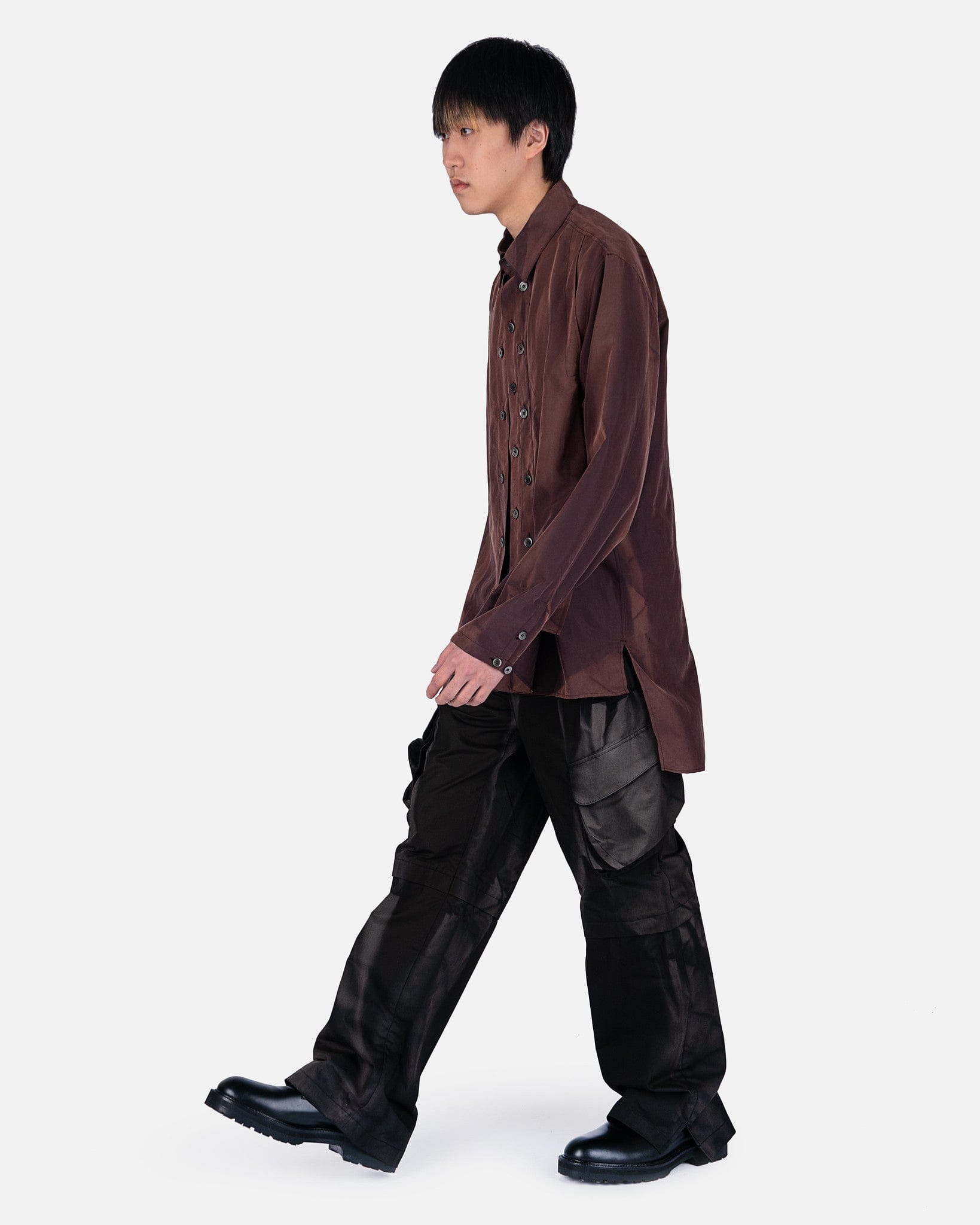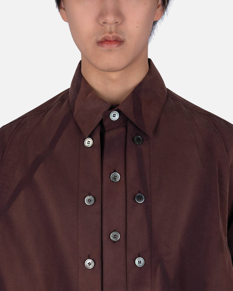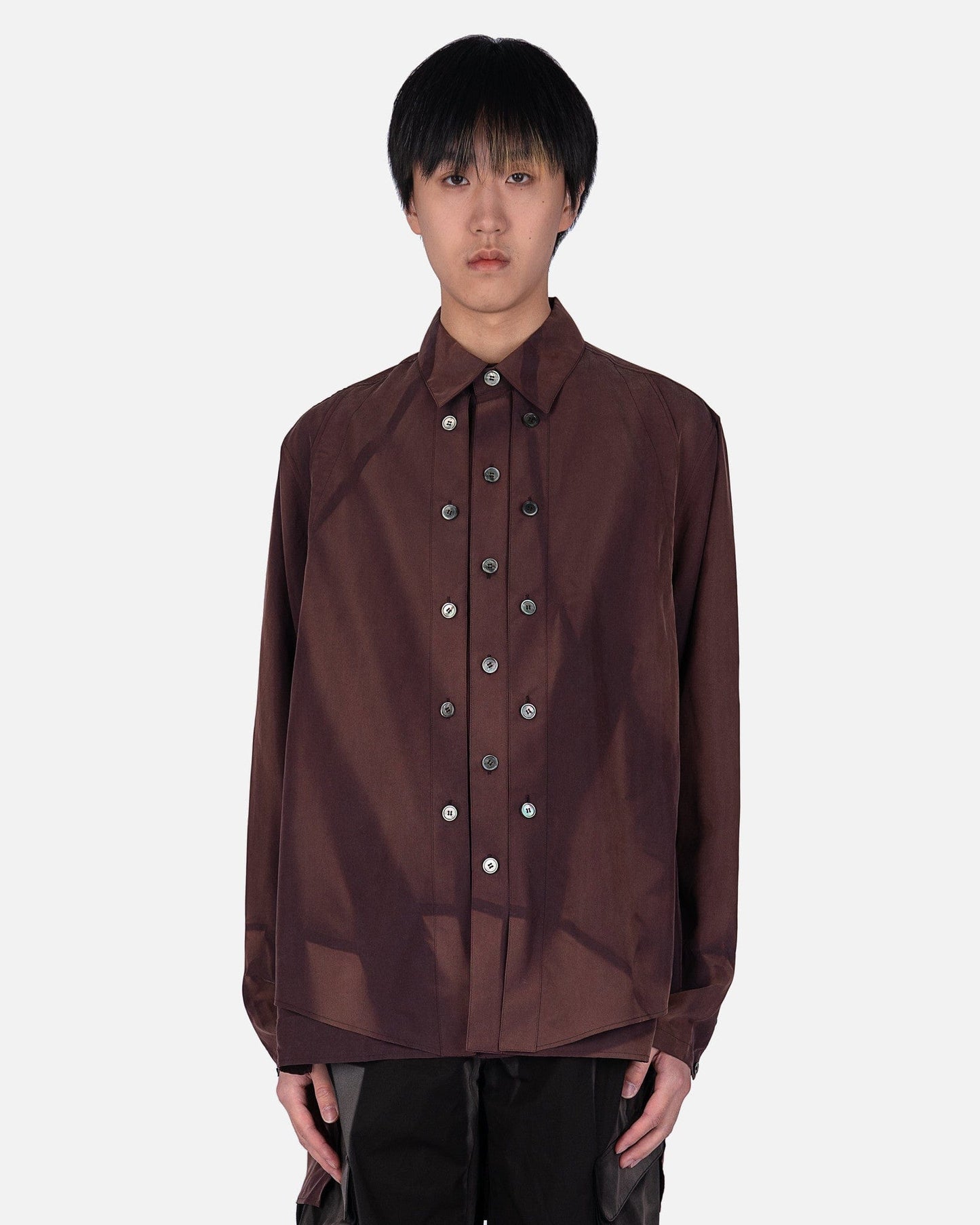 JiyongKim men's layered multi-button shirt in brown. This top has a spread collar and front button closure. There are two extra plackets with buttons surrounding the main closure. The shirt also has a layered silhouette.