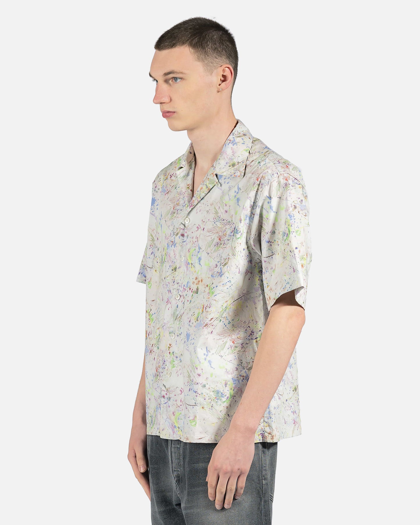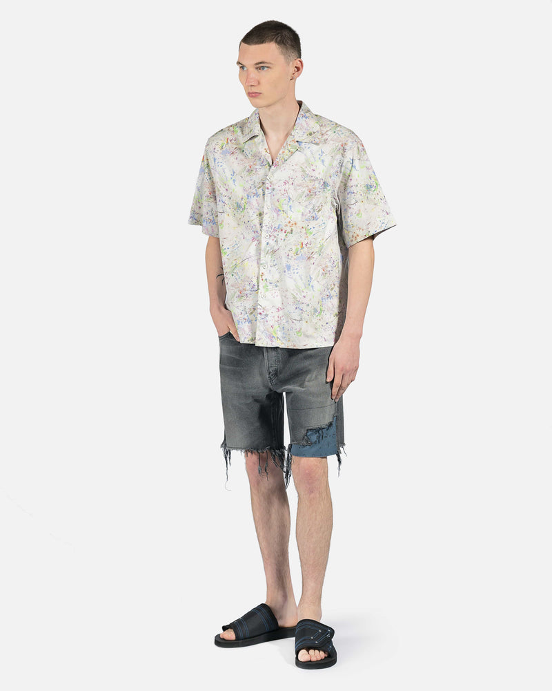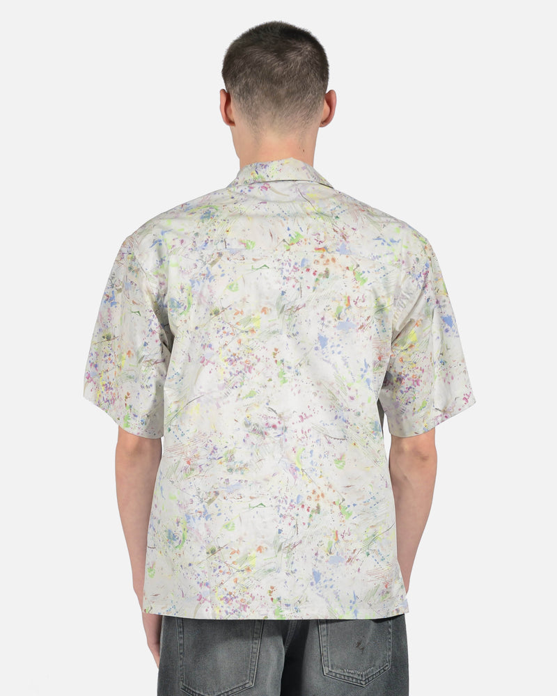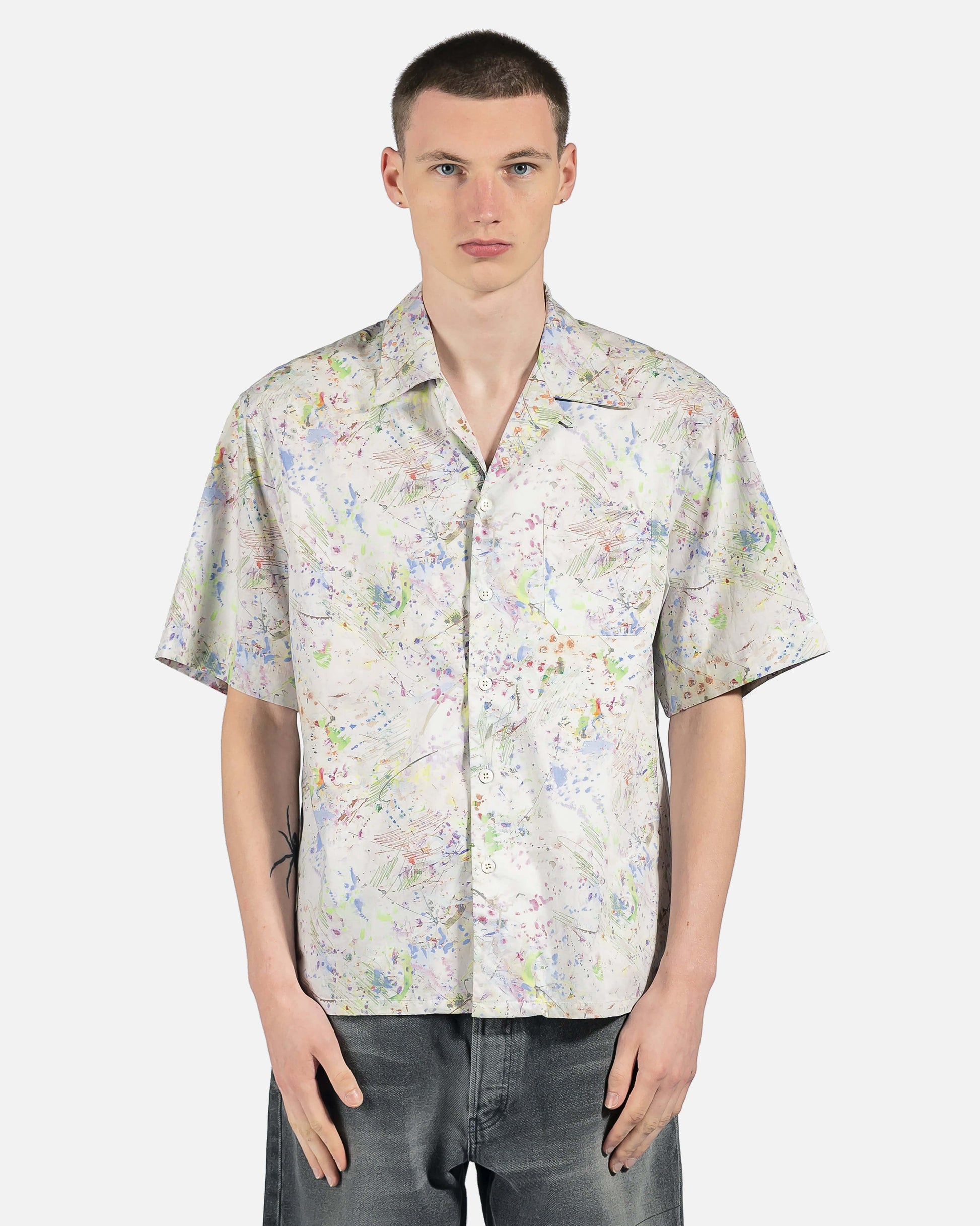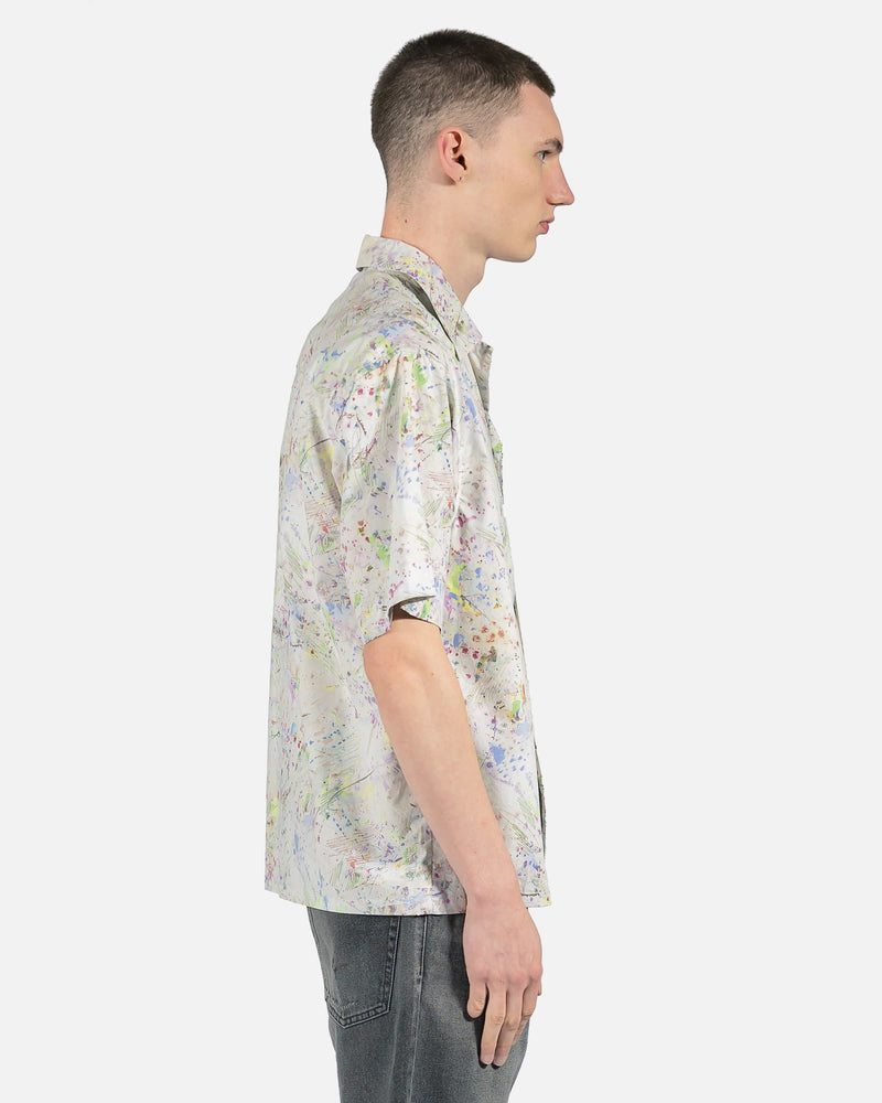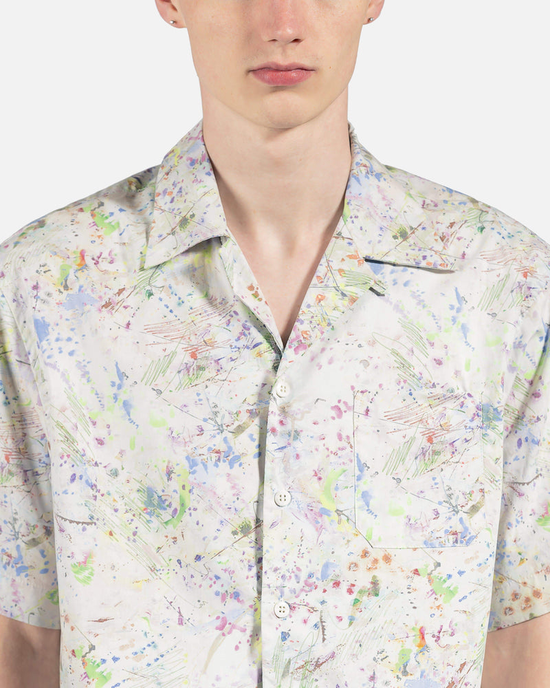 Relaxed fit button up in custom 'Studio Floor' print. This shirt features a button placket, chest pocket, and point collar. Similar to Pollock denim, this print drew inspiration from the floor of a painter's studio. Multi-colored strokes, splashes, and pen marks cover an all-white canvas.