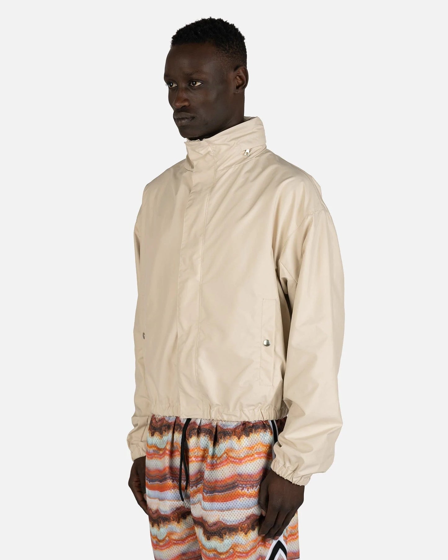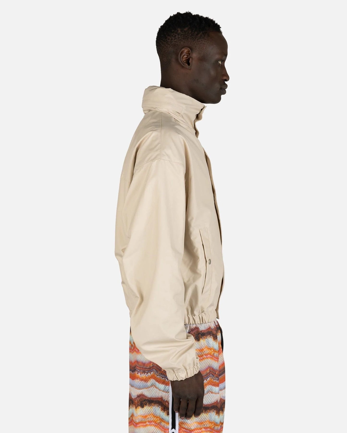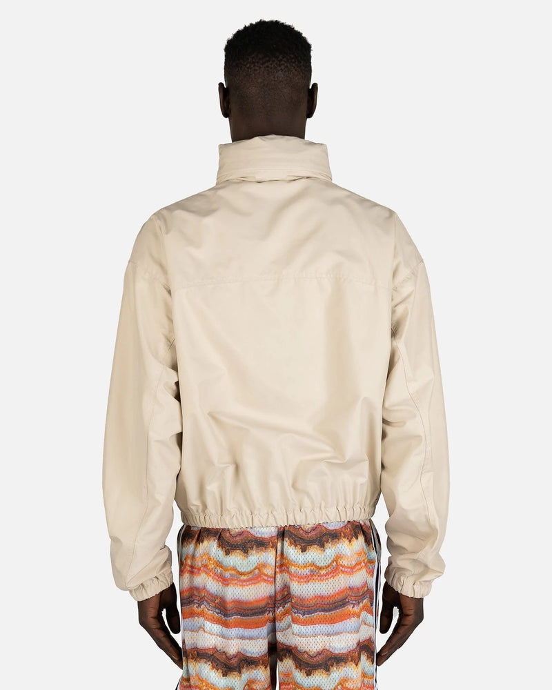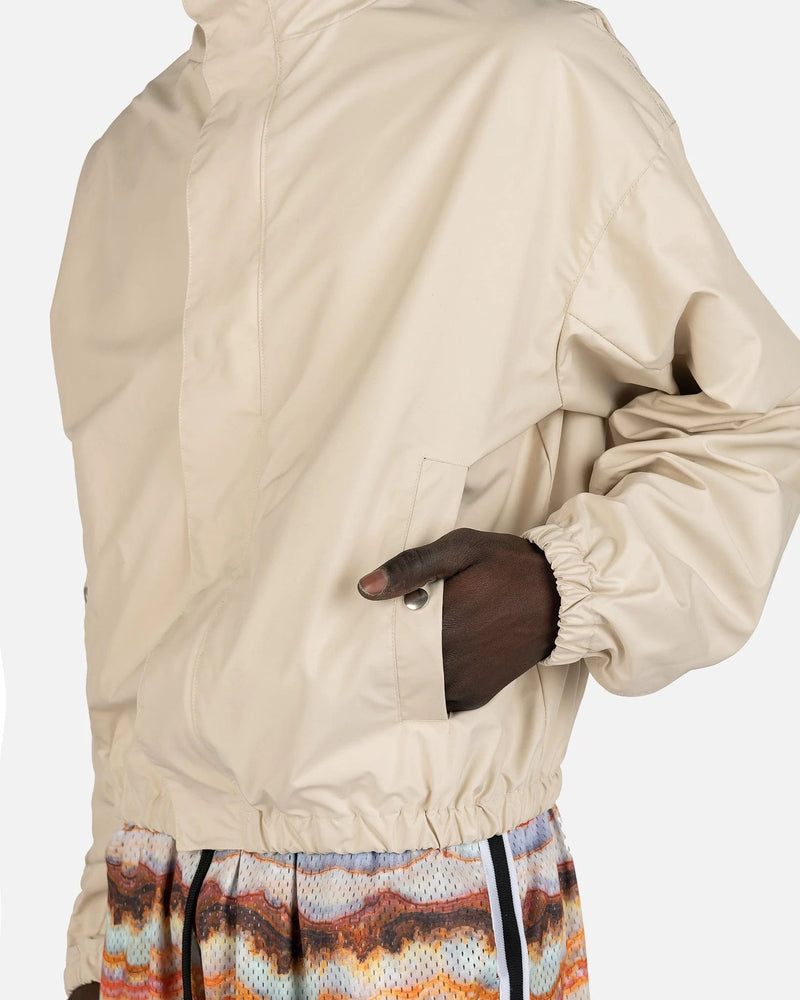 John Elliott men's jacket in ivory. This jacket features a classic club jacket silhouette with a stand collar.