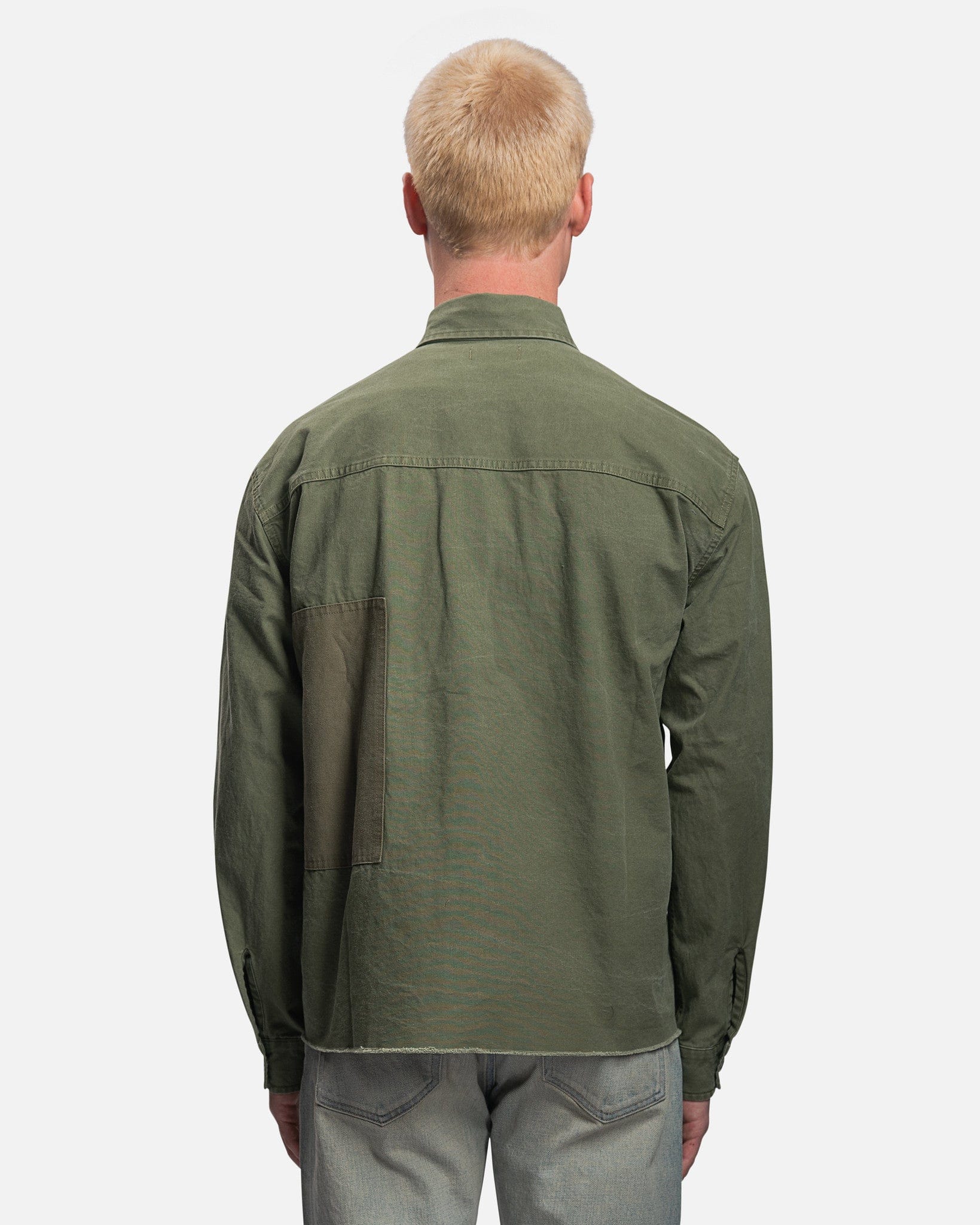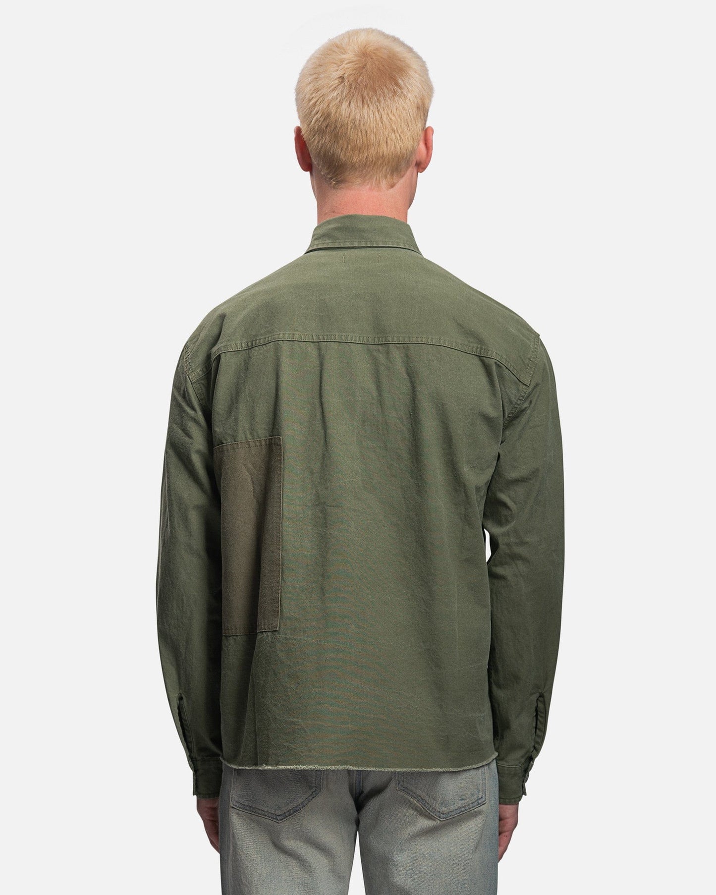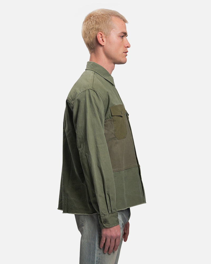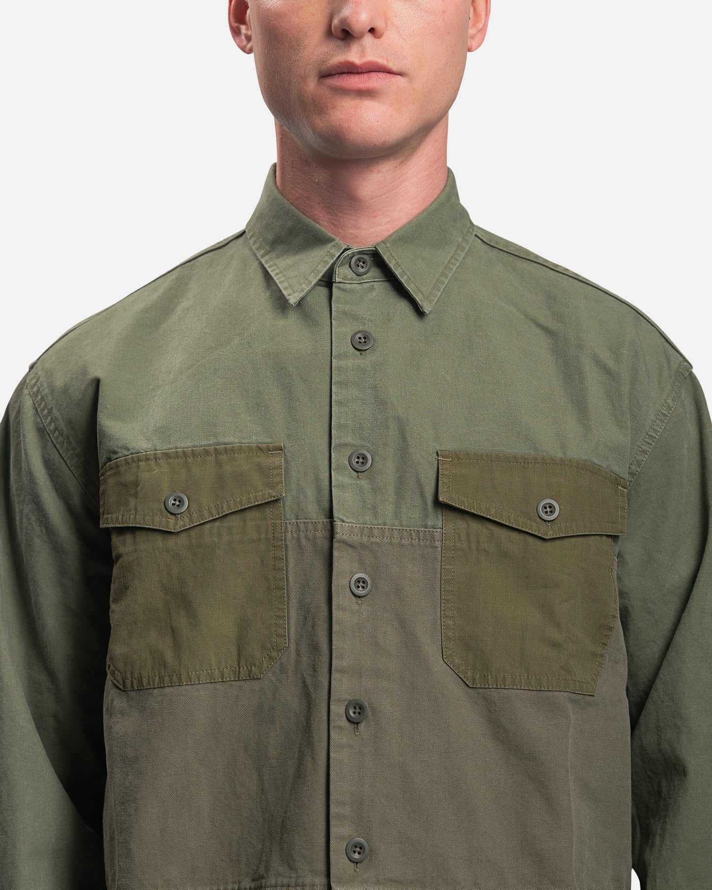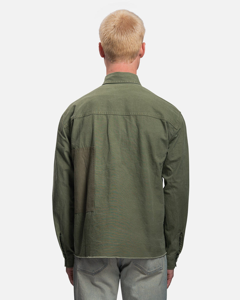 John Elliott men's paneled shirt in olive green. This top features tonal panels and a stonewashed finish that creates softness and fading at the seams.