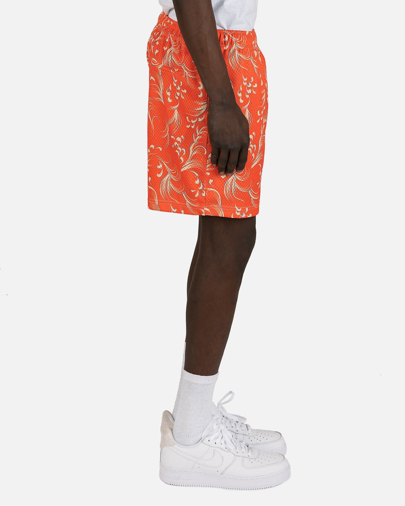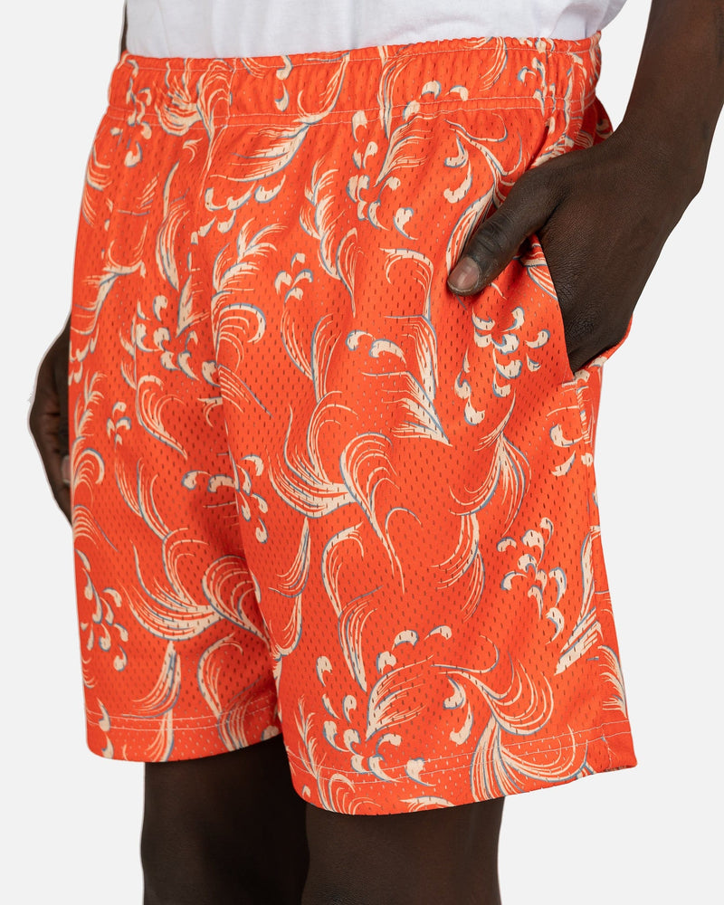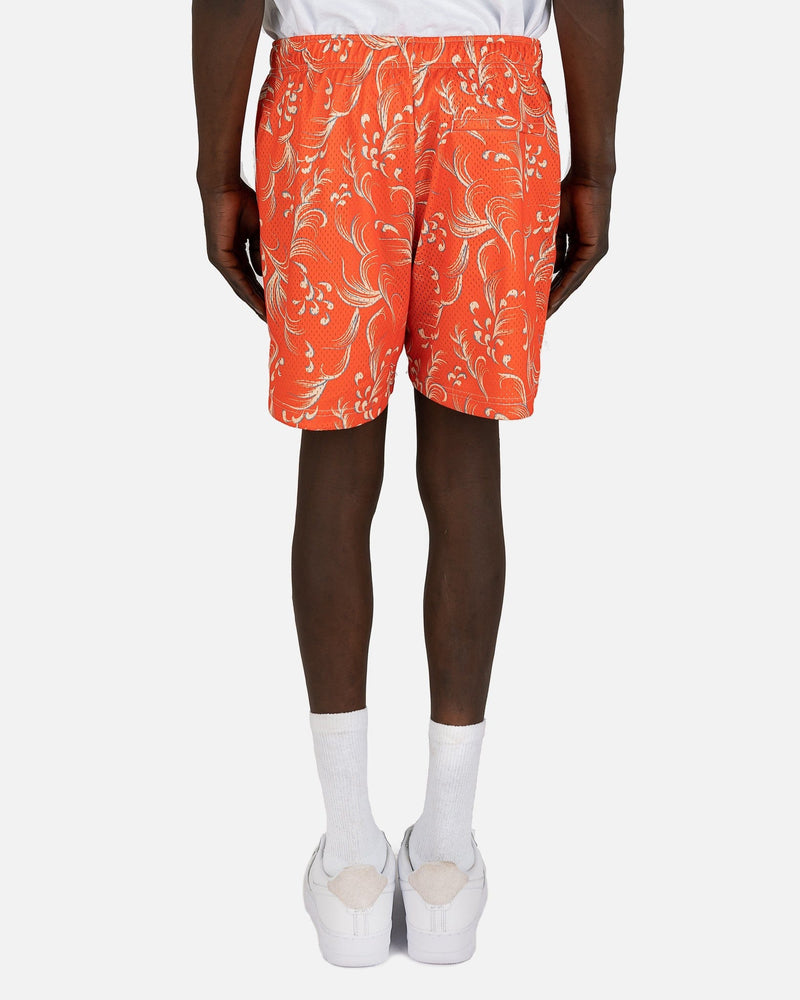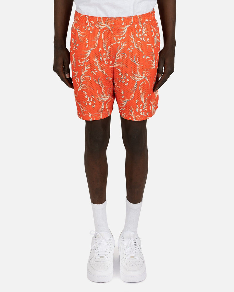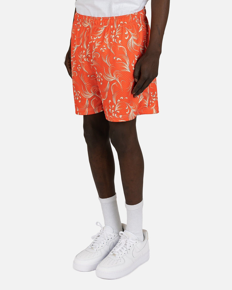 John Elliott men's relaxed fit mesh practice shorts in a an orange color. These shorts feature an all over floral inspired print and are slightly cropped. They feature a three-pocket design with a zippered pocket on the back right side. With a concealed drawstring closure at the waist, these shorts are also fully lined.