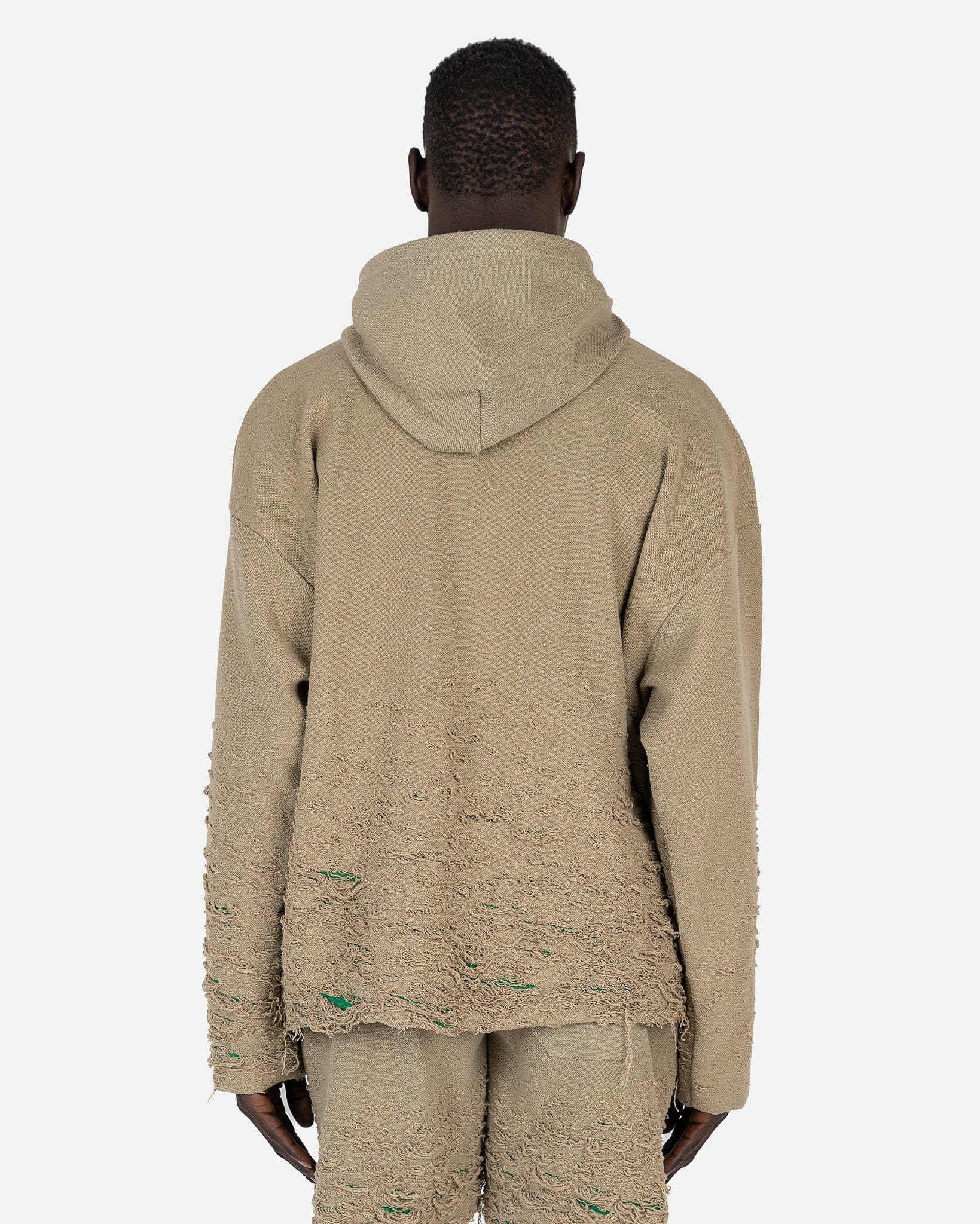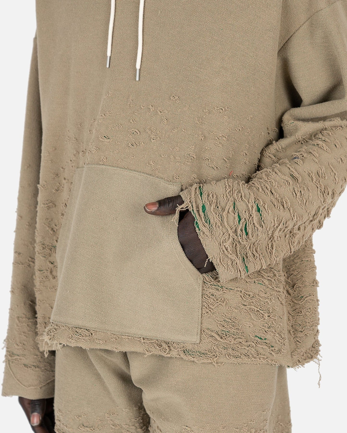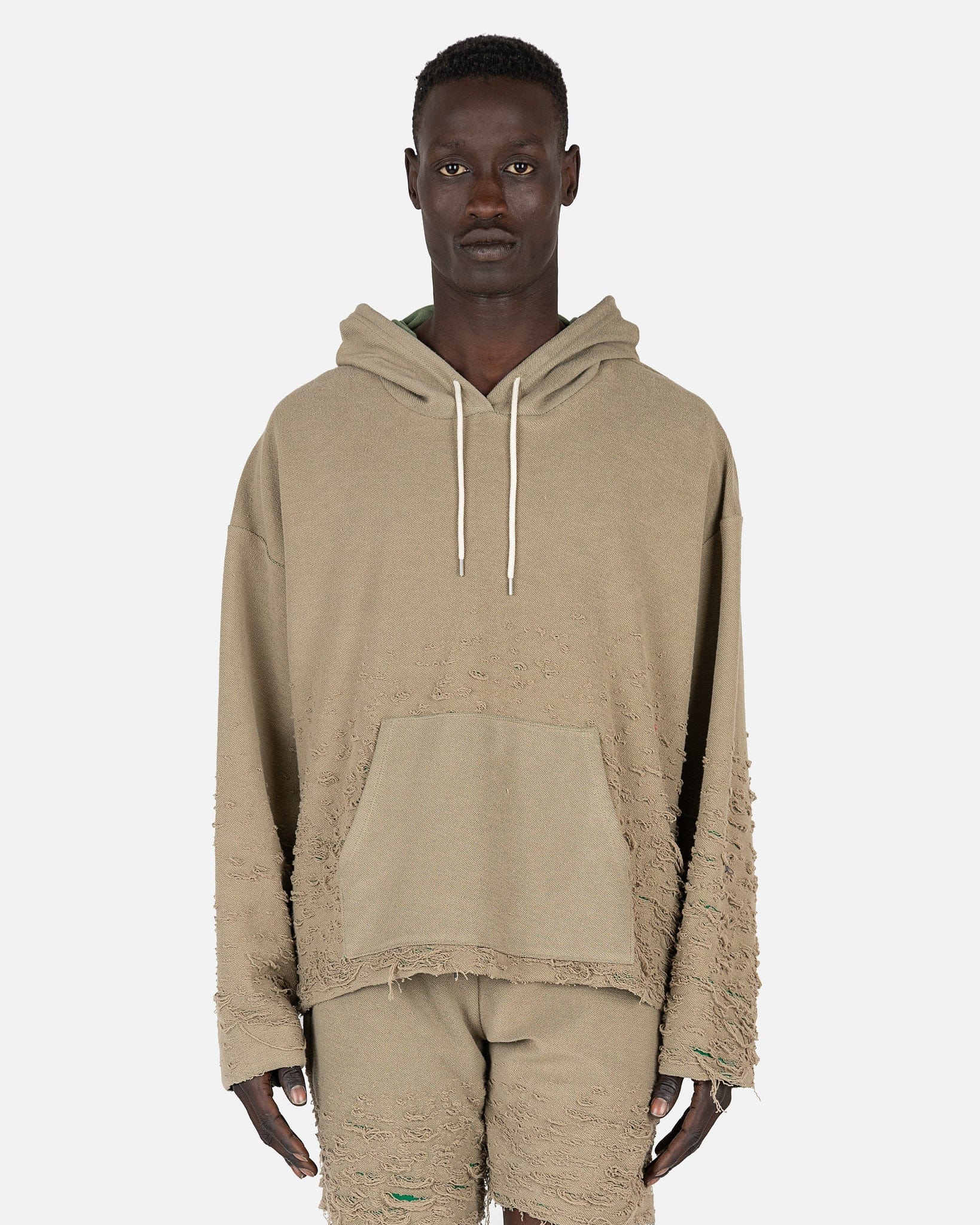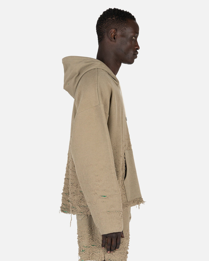 John Elliott men's distressed hooded sweatshirt in khaki green. This hoodie has drop shoulders and distressed detailing along the sleeves and hems.