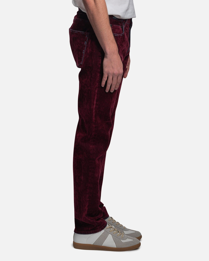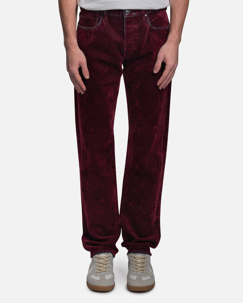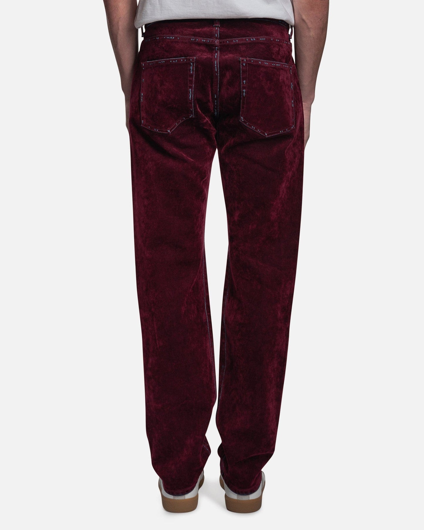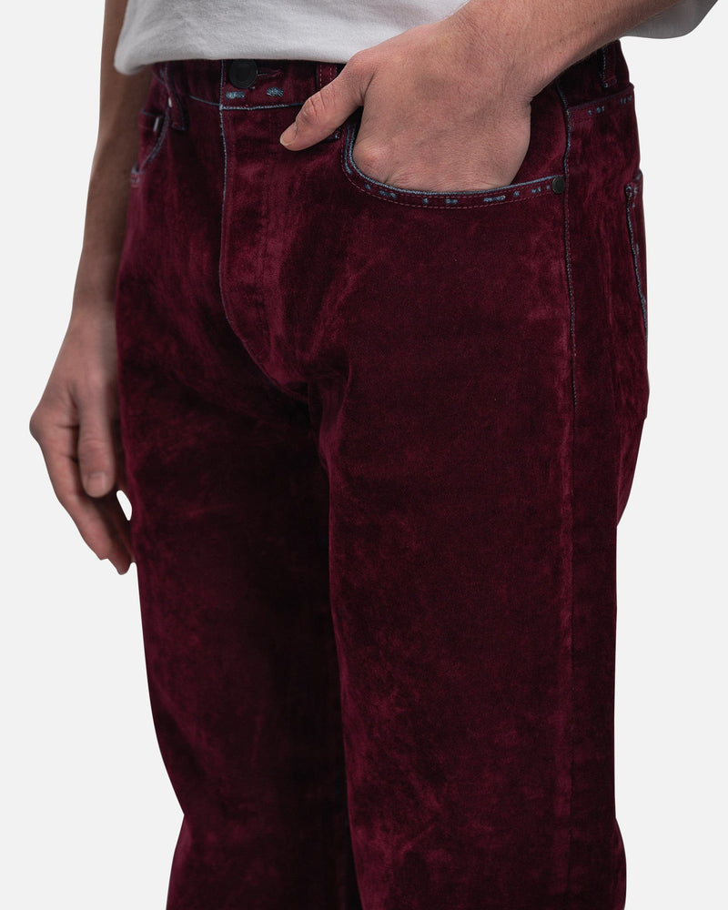 John Elliott men's Daze pants in crush flock burgundy. These pants follow the five pocket composition. The Crush Flock process involves small fibers applied to the denim and hand burnished edges, creating a unique character for each individual garment.