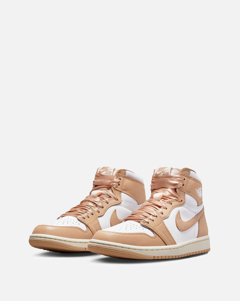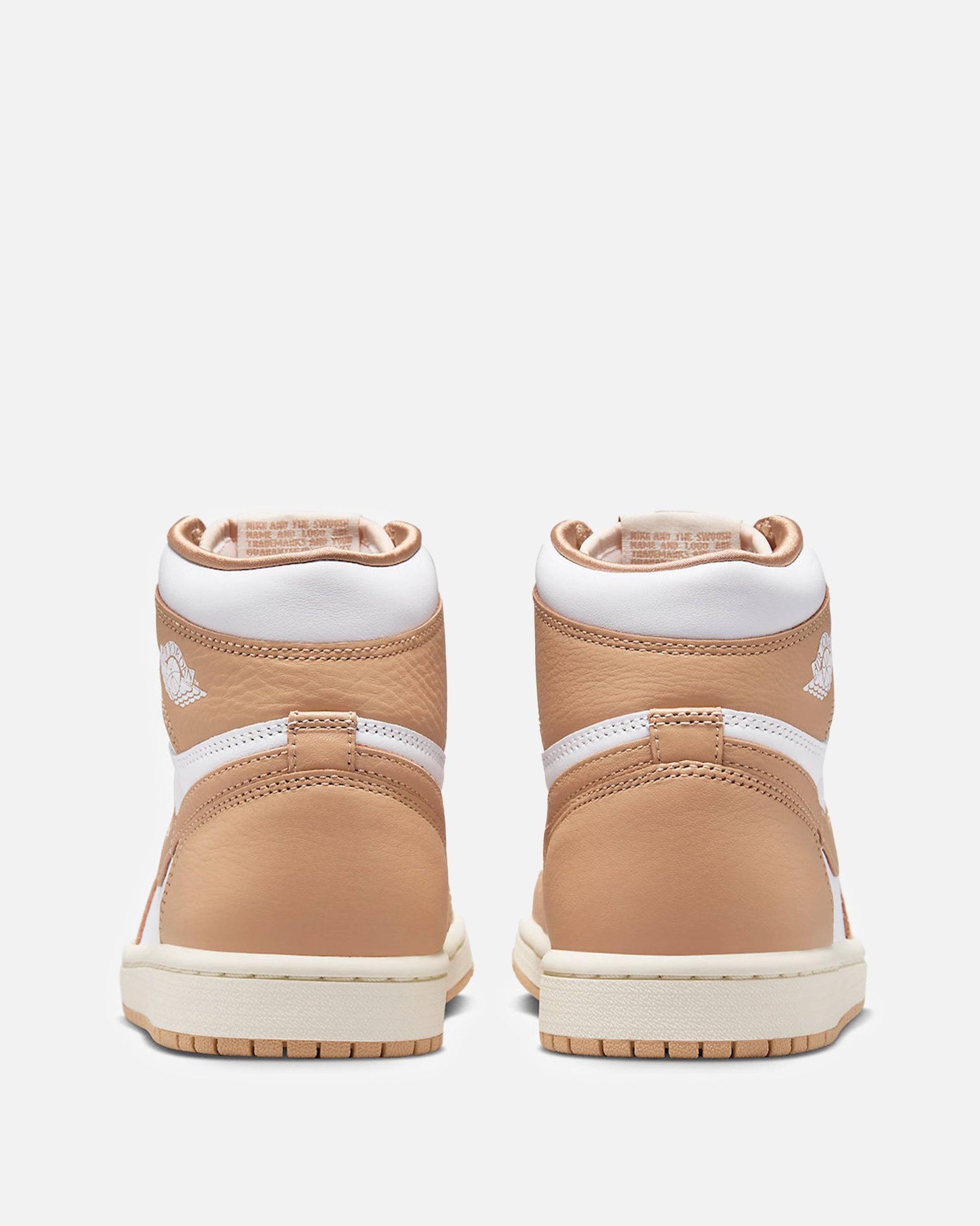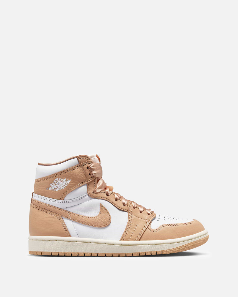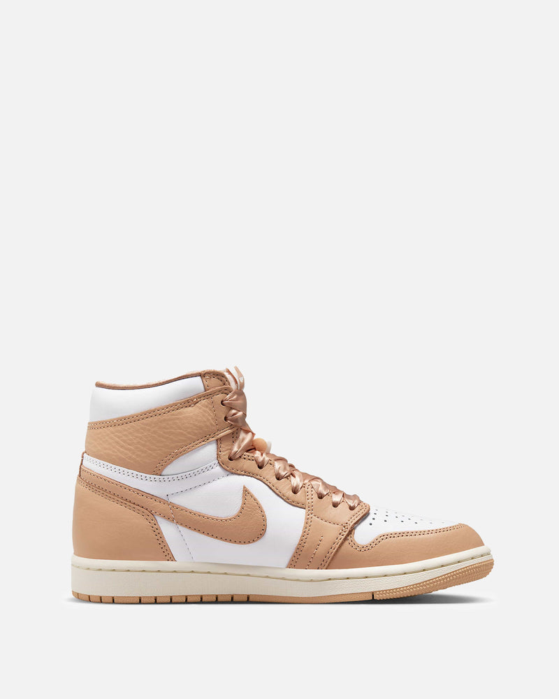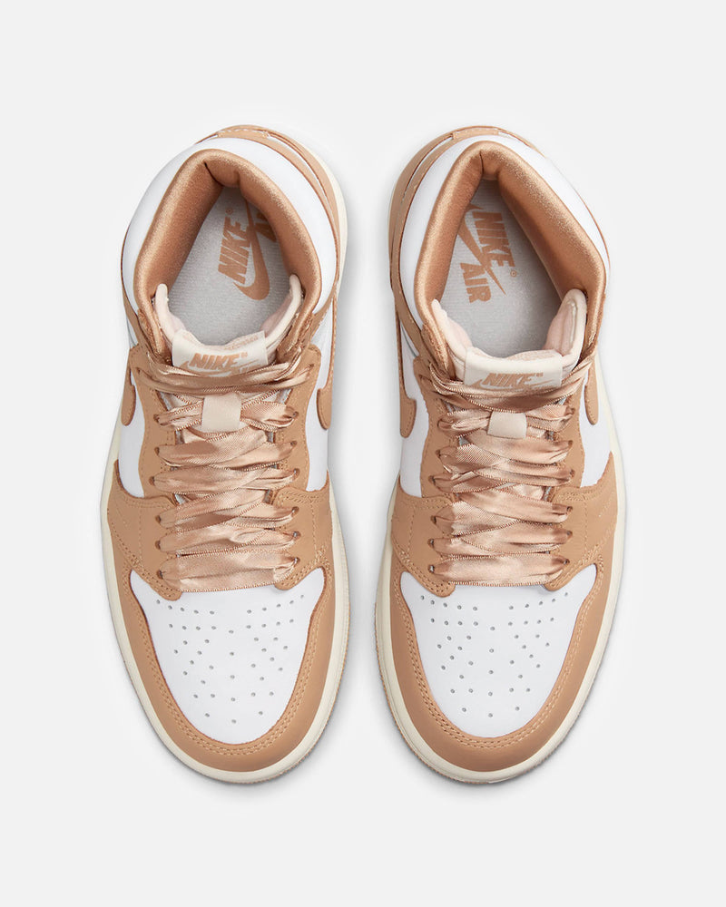 Women's Air Jordan 1 High in Praline and White. This hightop sneaker features a leather base with textured leather overlays on the upper. A jacquard nylon logo patch is stitched on the tongue with Jordan Brand's 'wings' logo embossed on the collar.