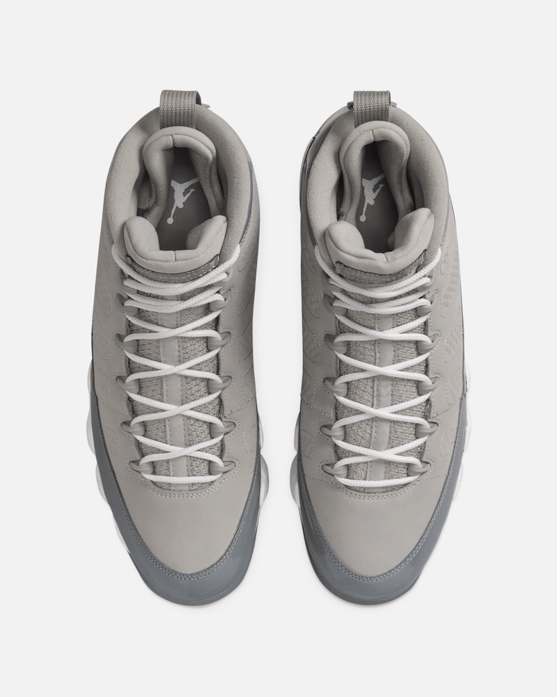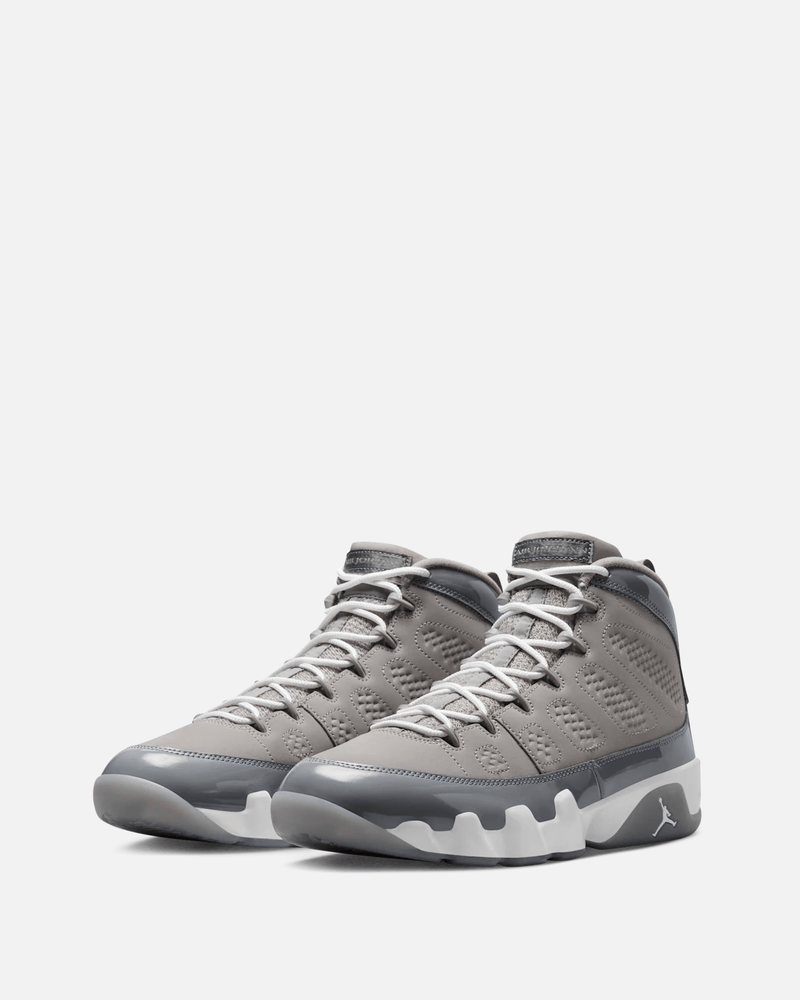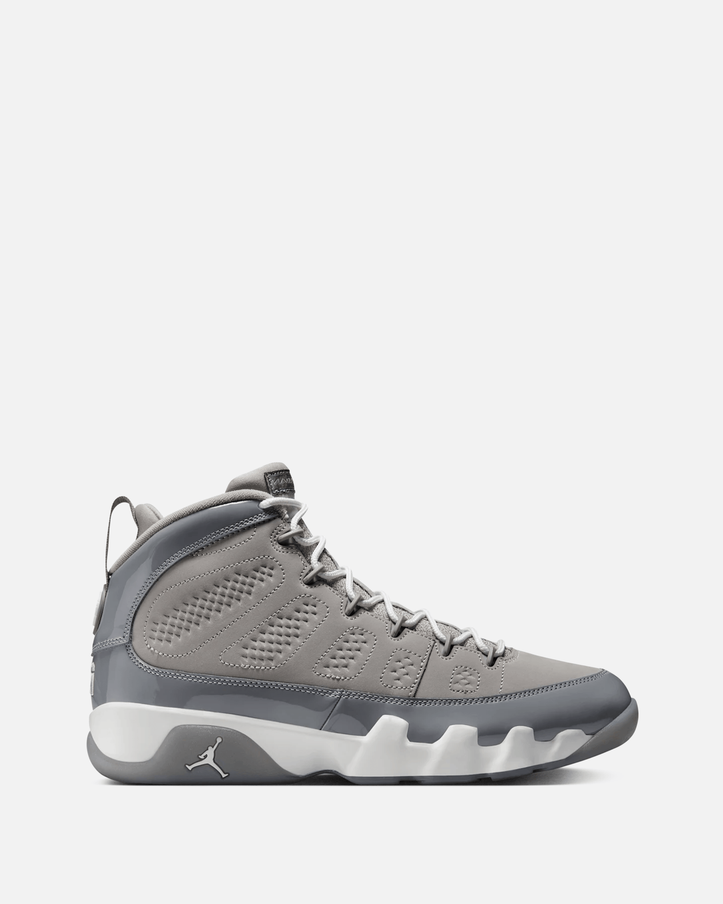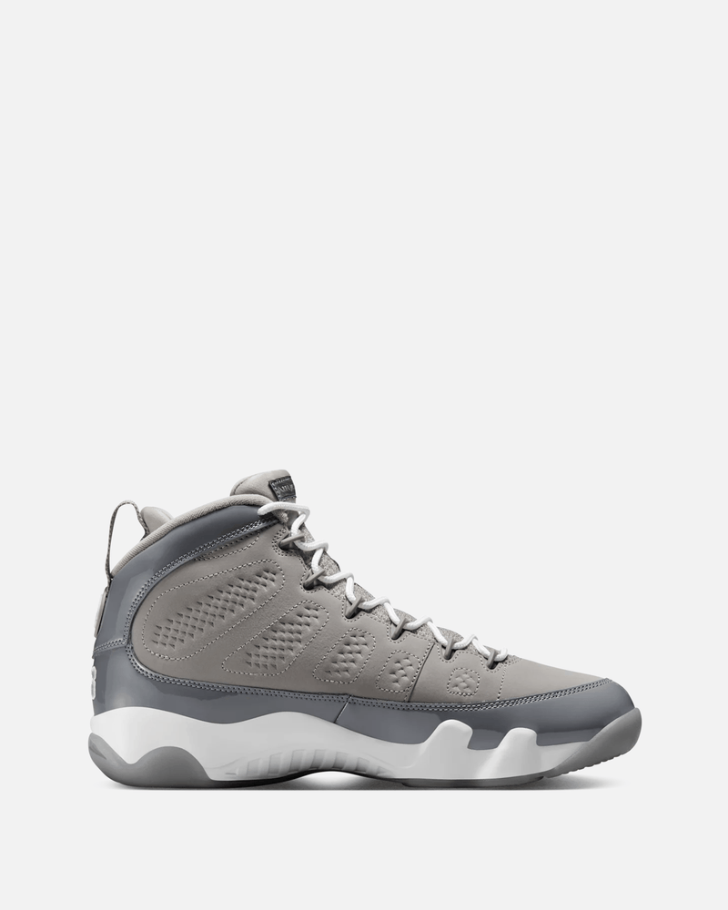 Air Jordan 9 in Medium Grey and Cool Grey. This hightop sneaker features a nubuck base with patent leather overlays on the toe, heel counter and collar. A jacquard nylon logo patch is stitched on the tongue with a stamped logo emblem on the heel counter.