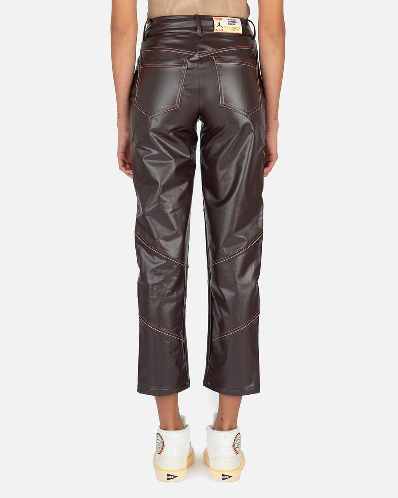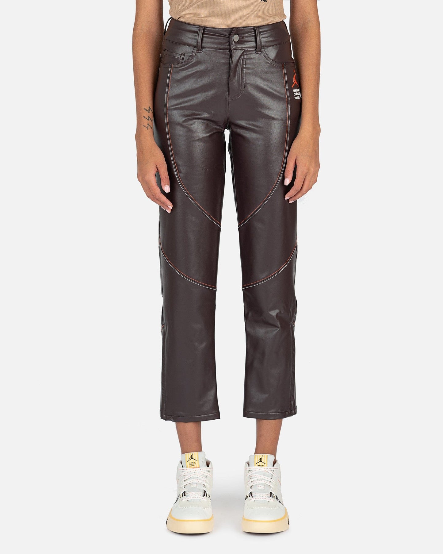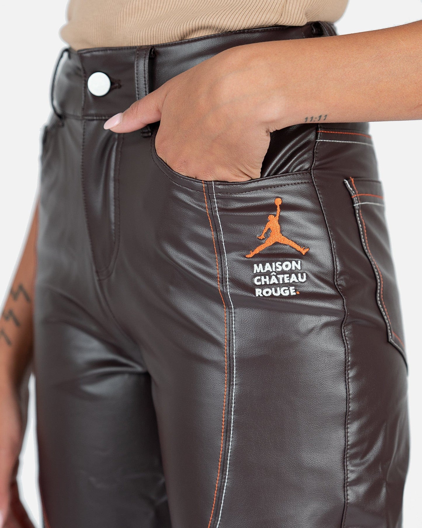 Jordan x Maison Chateau Rouge faux leather pants in brown. These pants are made of a stretchy material and have embroidered branding.