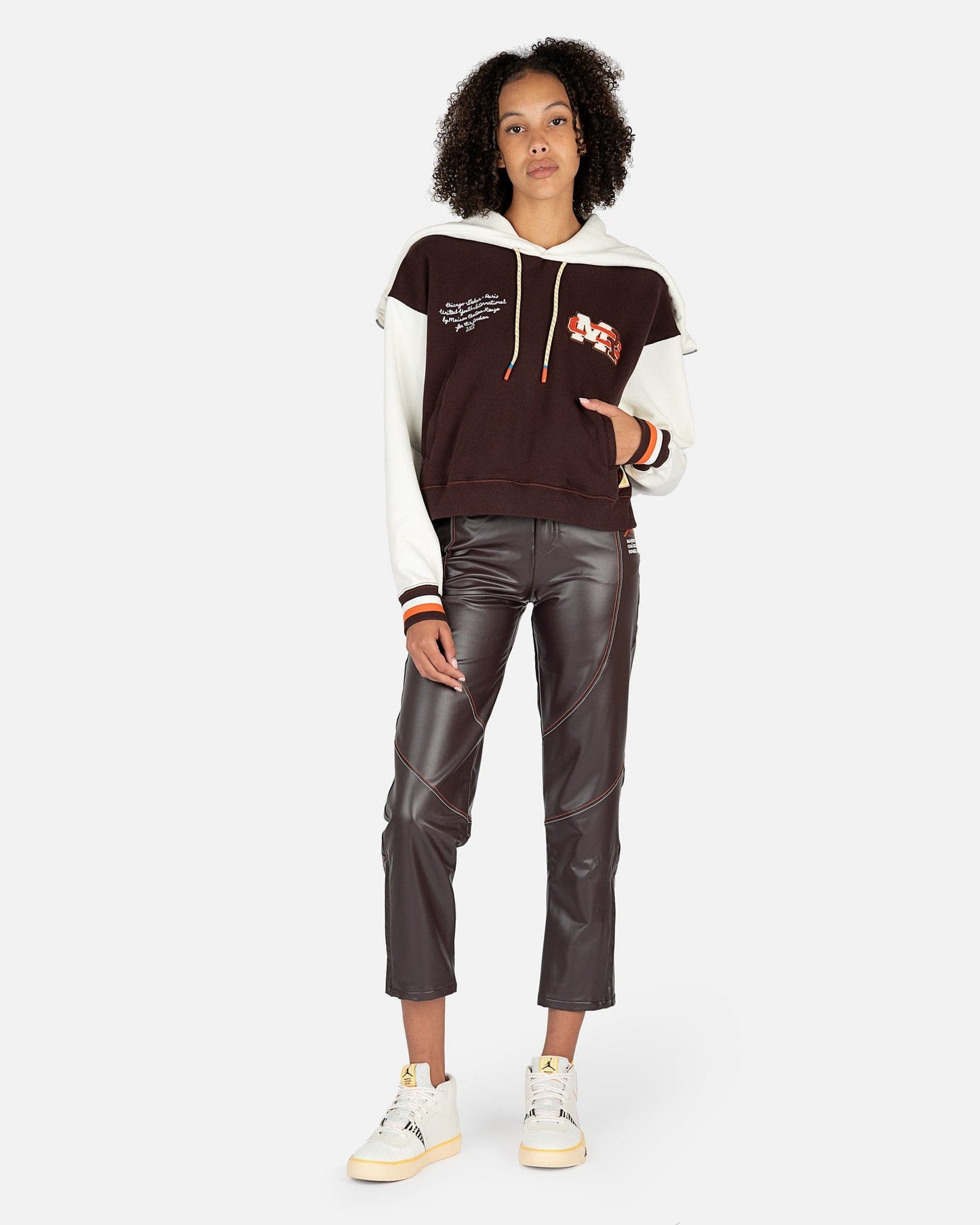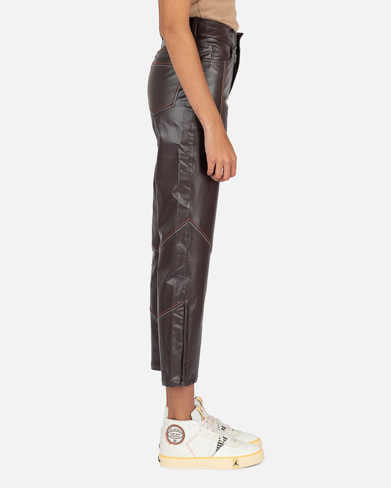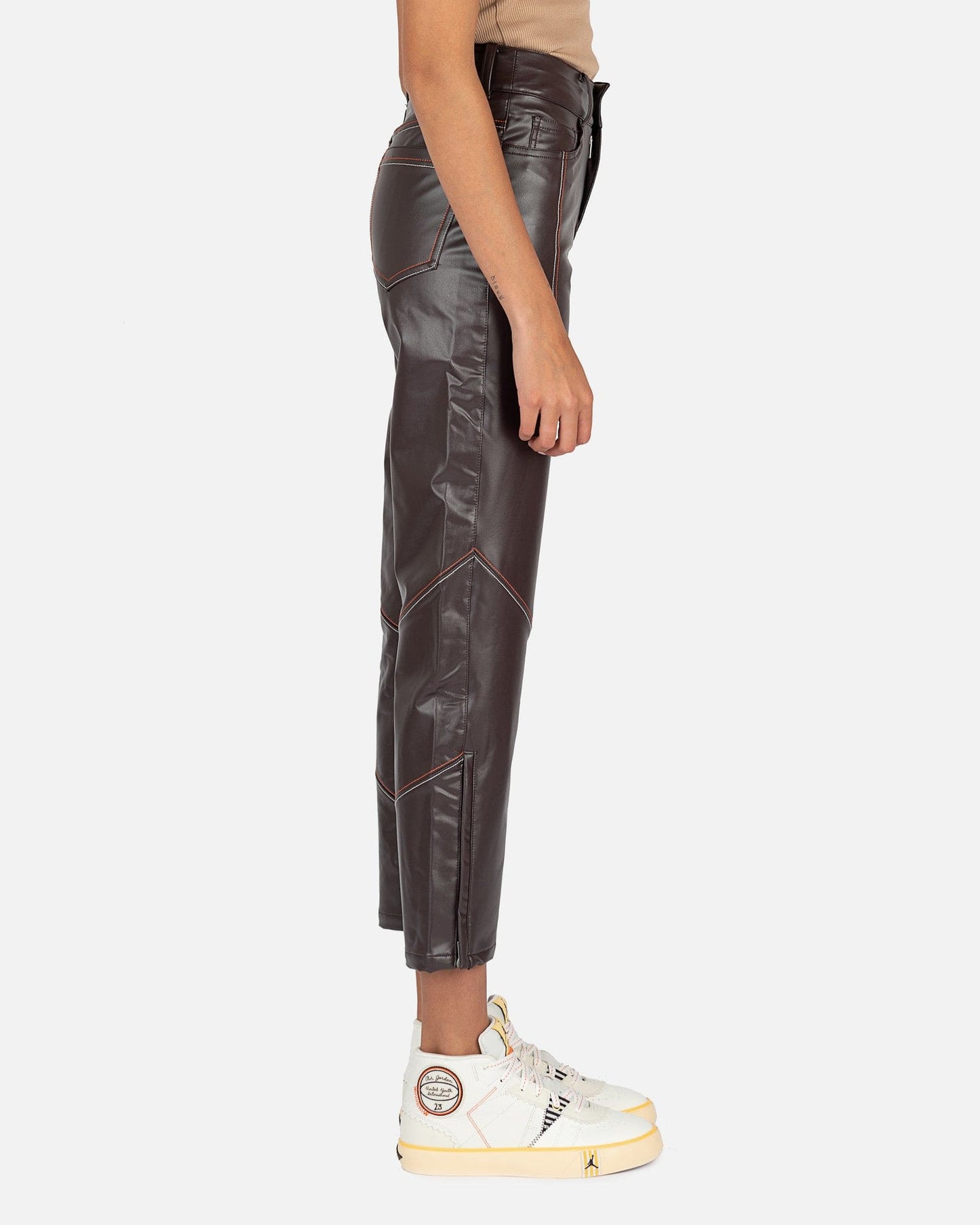 Jordan x Maison Chateau Rouge faux leather pants in brown. These pants are made of a stretchy material and have embroidered branding.