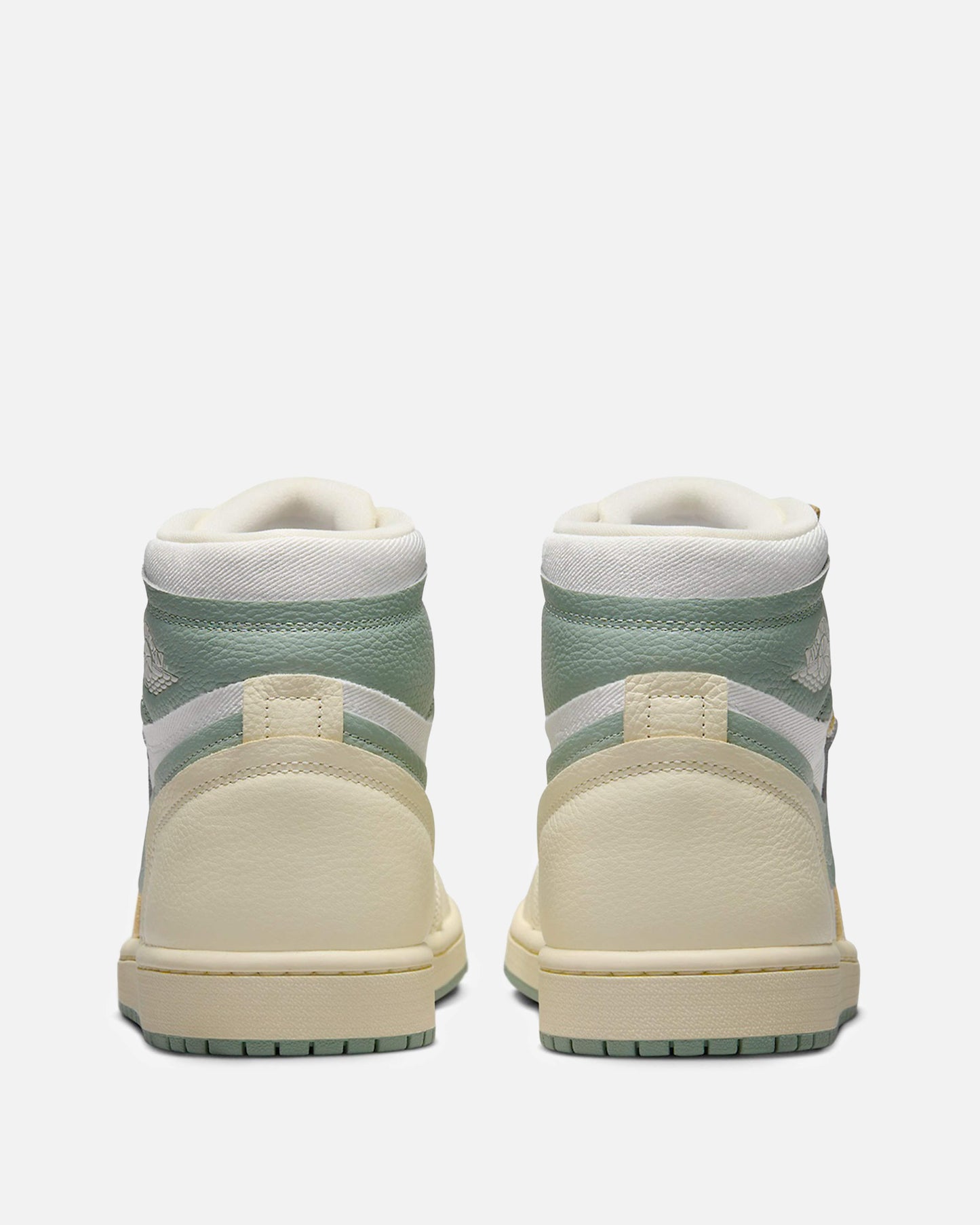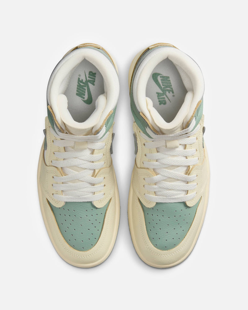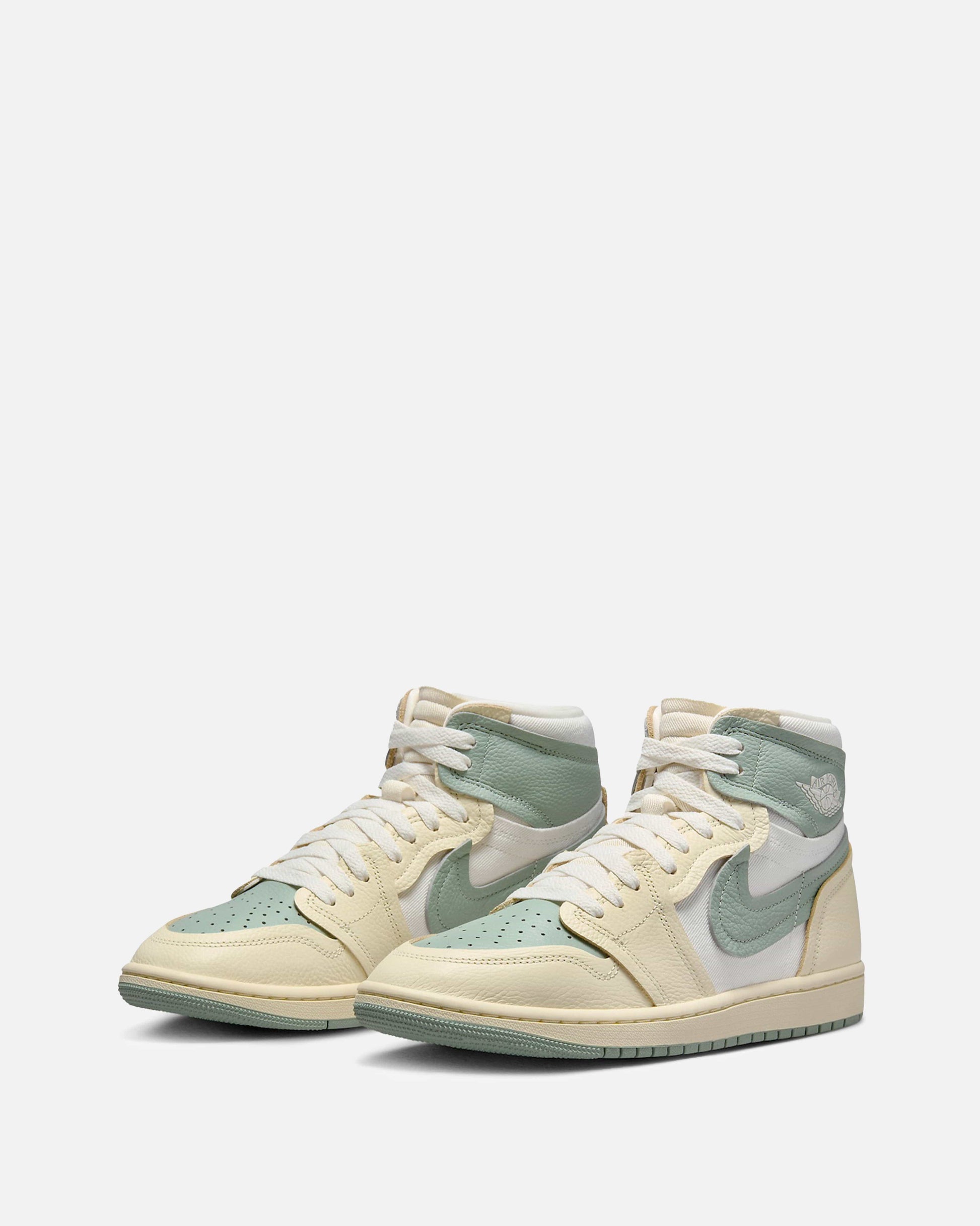 Women's Air Jordan 1 Method of Make in Legend Sand and Jade Smoke. This hightop sneaker features a canvas base with leather overlays on the mudguard, eyeguard, heel counter and collar. Jordan Brand's 'wings' logo is embossed on the collar.