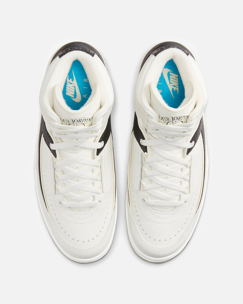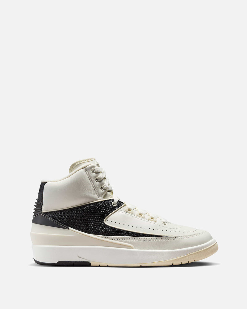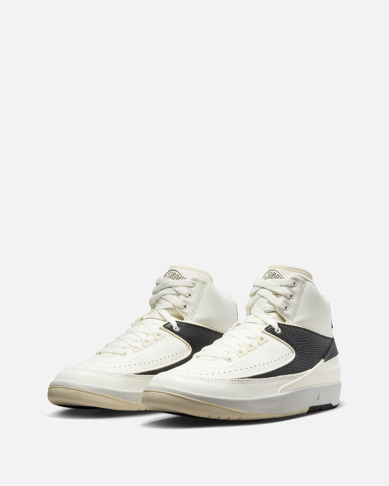 Women's Air Jordan 2 in Sail and Coconut Milk. This hightop sneaker features a leather base with textured leather overlays on the mid-foot and TPU panels on the heel counter. A leather logo patch is stitched on the tongue with additional branding on the heel.