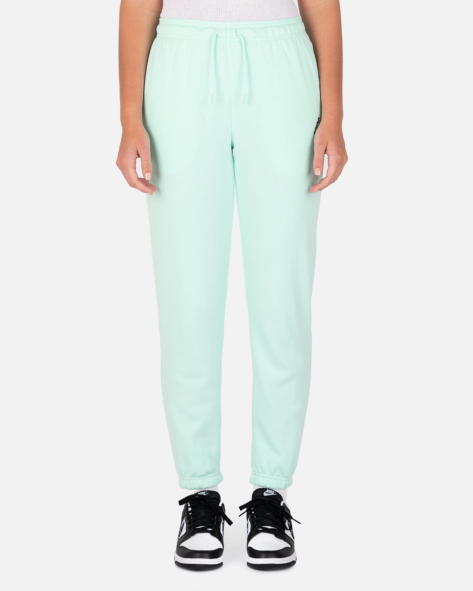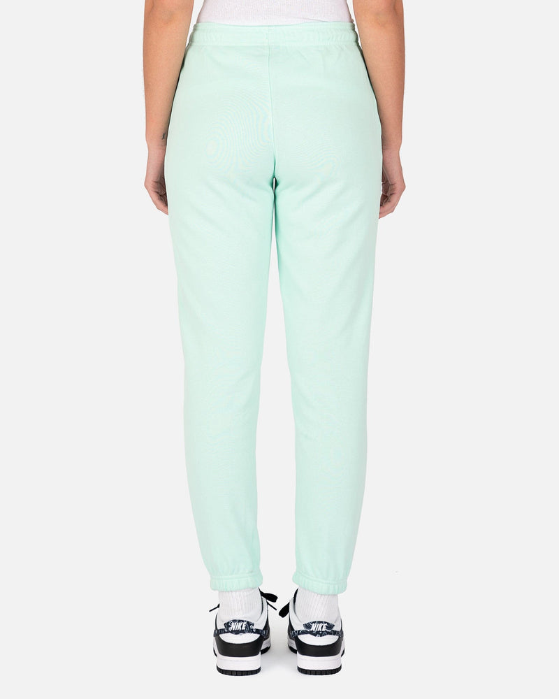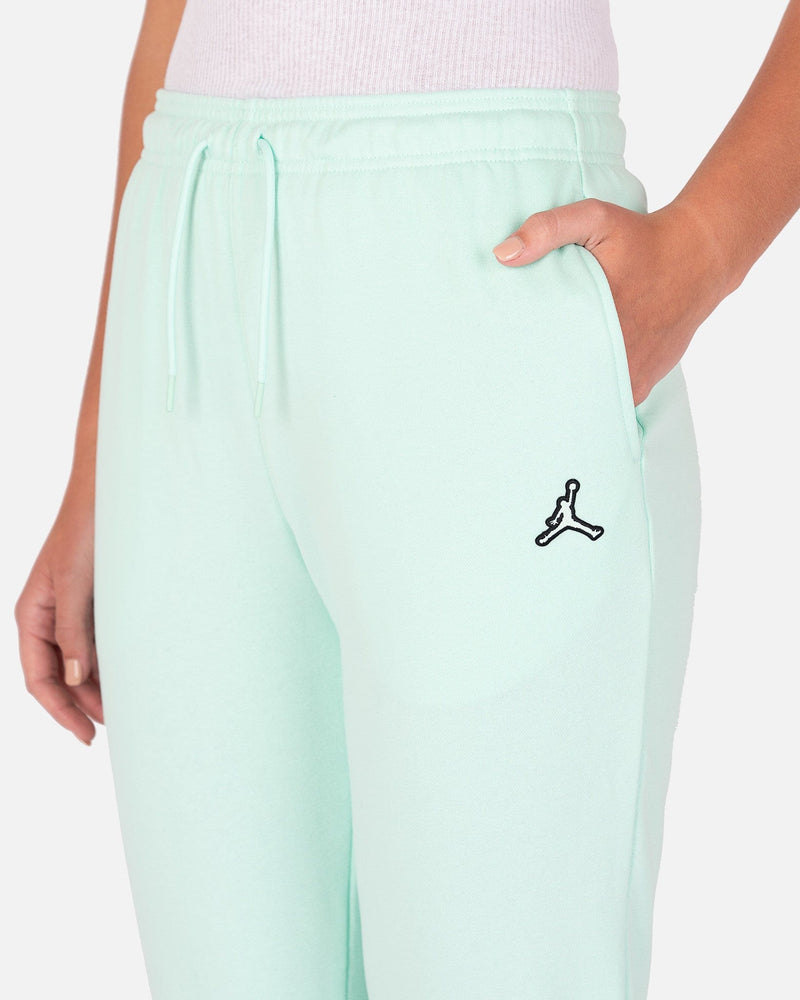 Jordan women's fleece sweatpants in mint green. These pants have an elasticized waist and a regular fit, with the Jumpman logo patch on the front left thigh.